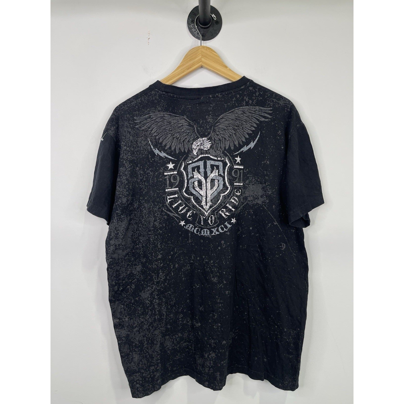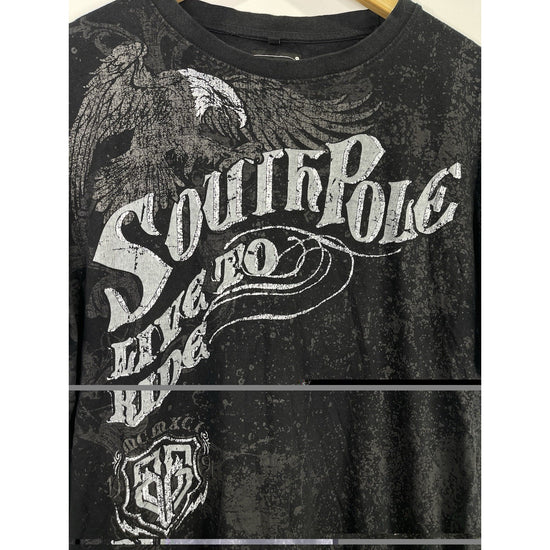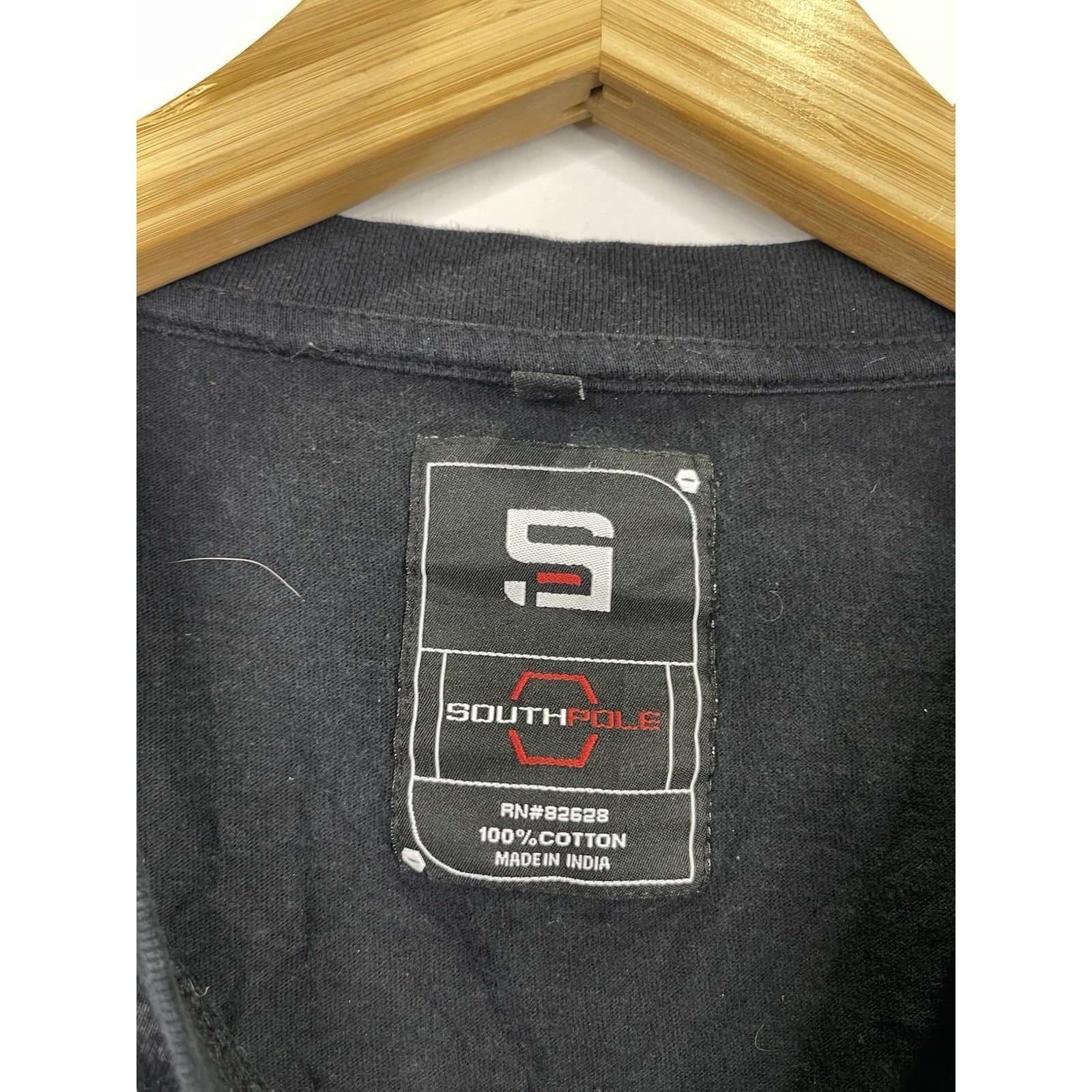 This product is a vintage Y2k Southpole black t-shirt in size XL. It features a crew neck and short sleeves, made of cotton material, with a regular fit. The shirt is designed with a hip hop theme and is suitable for all seasons. Made in India, this t-shirt is a stylish and comfortable choice for men looking to add a retro touch to their wardrobe.