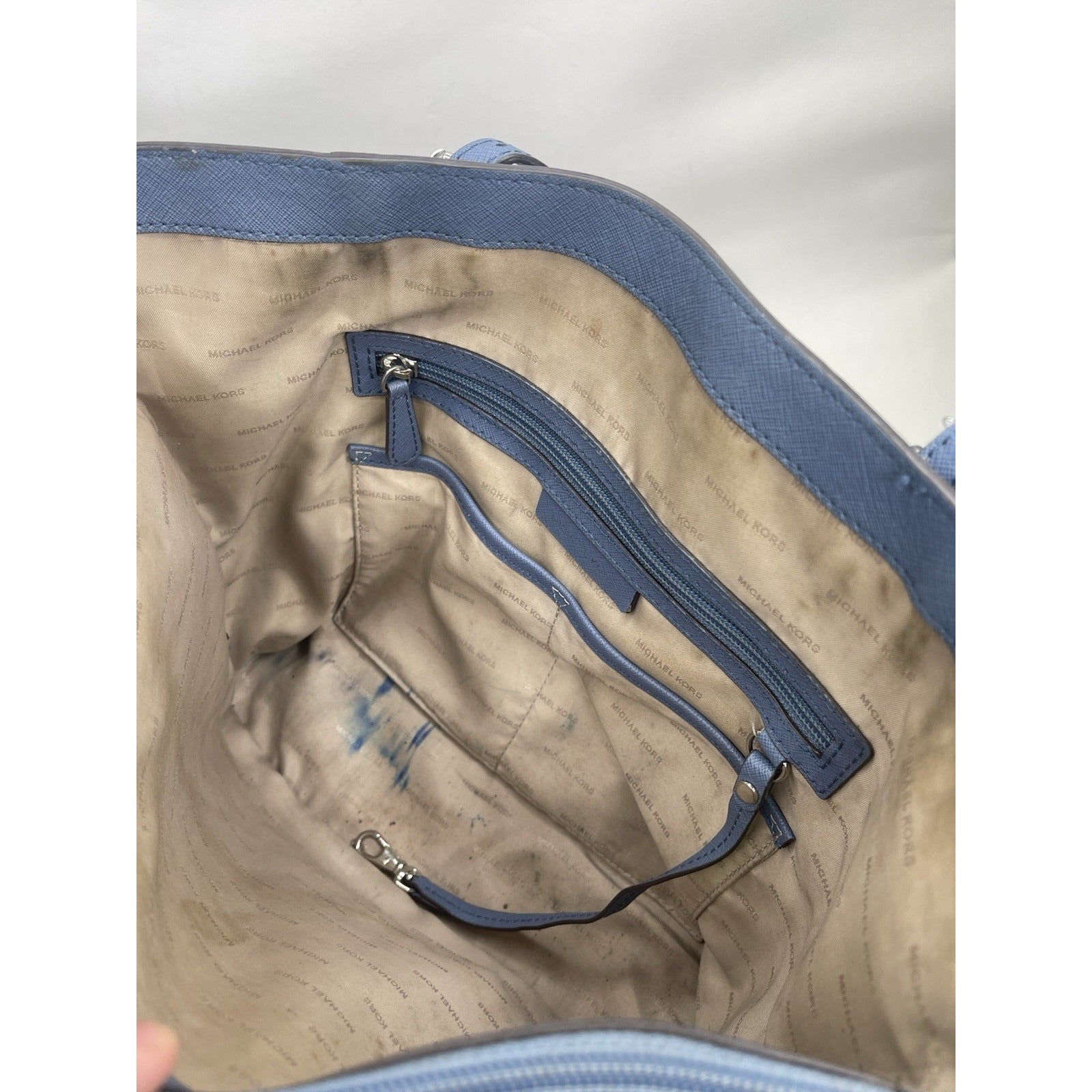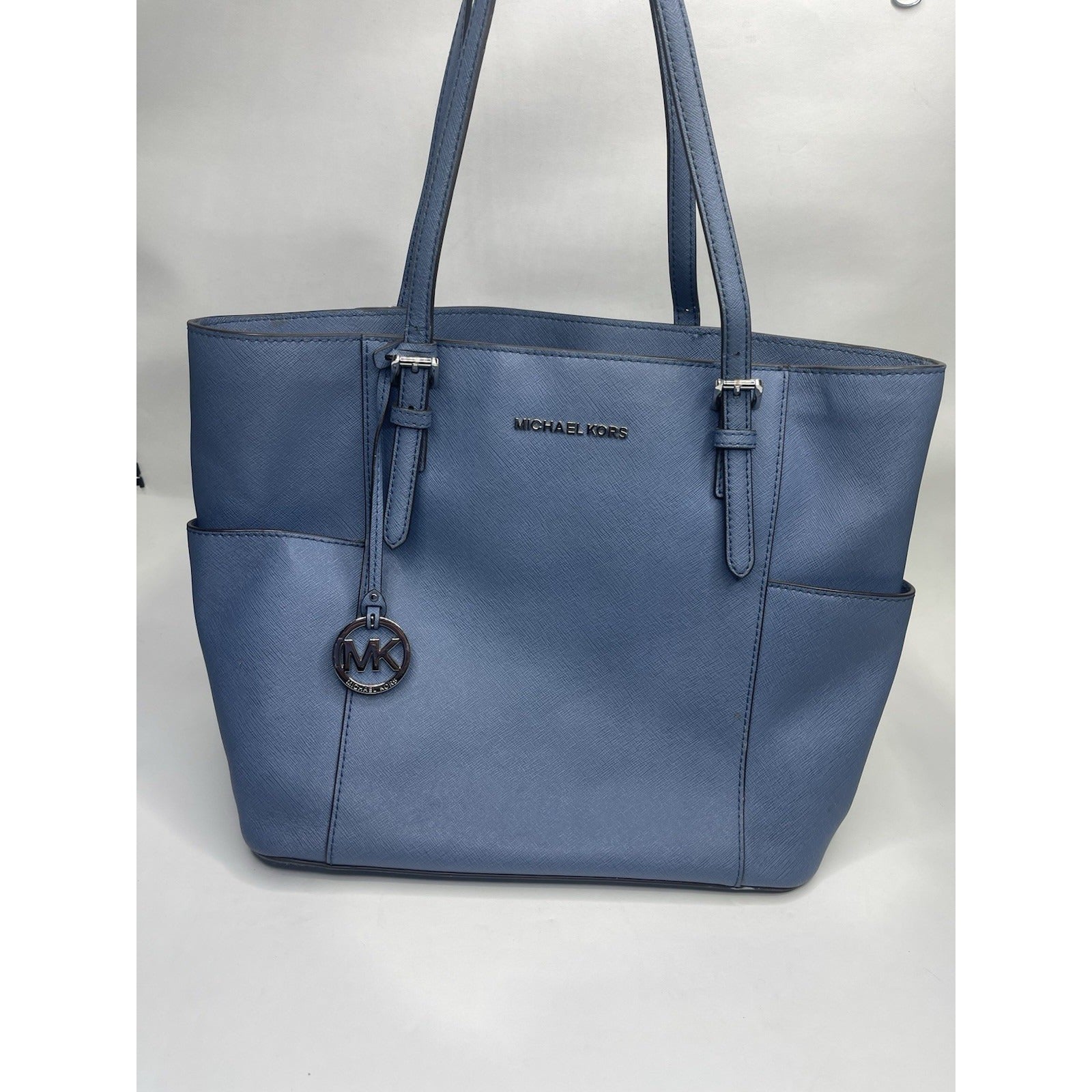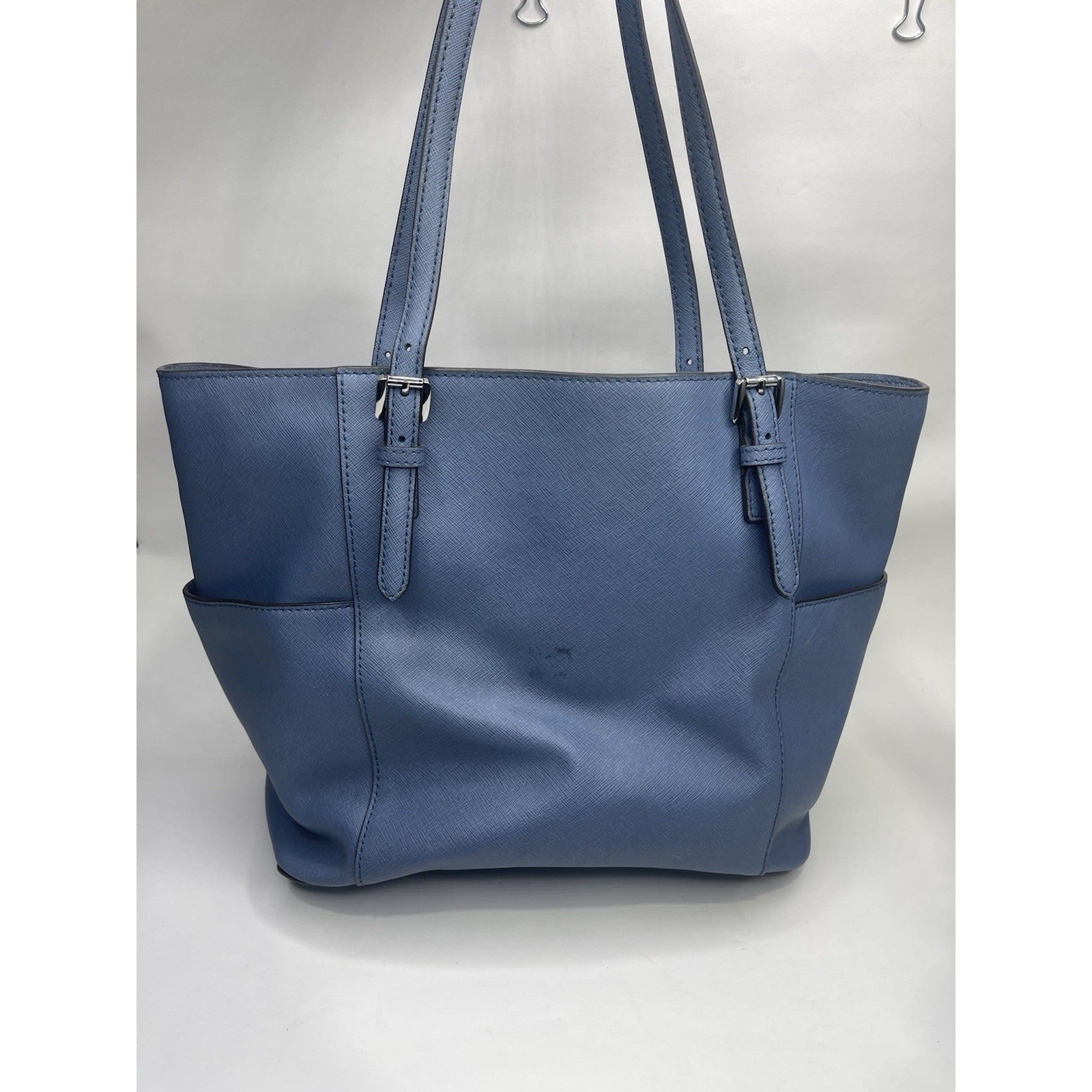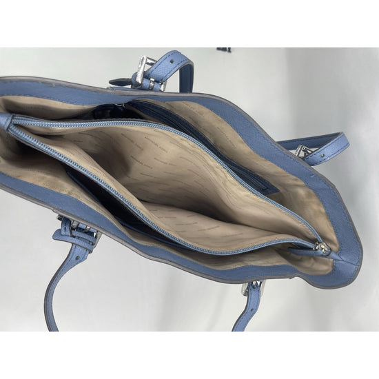 The Michael Kors Blue Charlotte Saffiano Leather Top-Zip Tote Bag is a stylish and spacious accessory designed for women. Made from luxurious leather with a fabric lining, this large tote features double blue handles and a zip closure. The exterior color in South Pacific Blue complements the silver hardware, adding a touch of elegance. The product comes with Michael Kors packaging, making it a perfect gift or luxurious addition to any handbag collection.