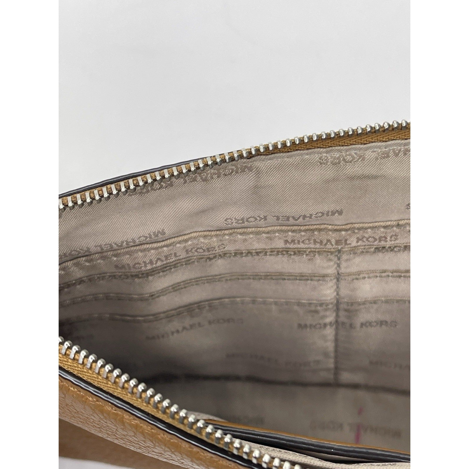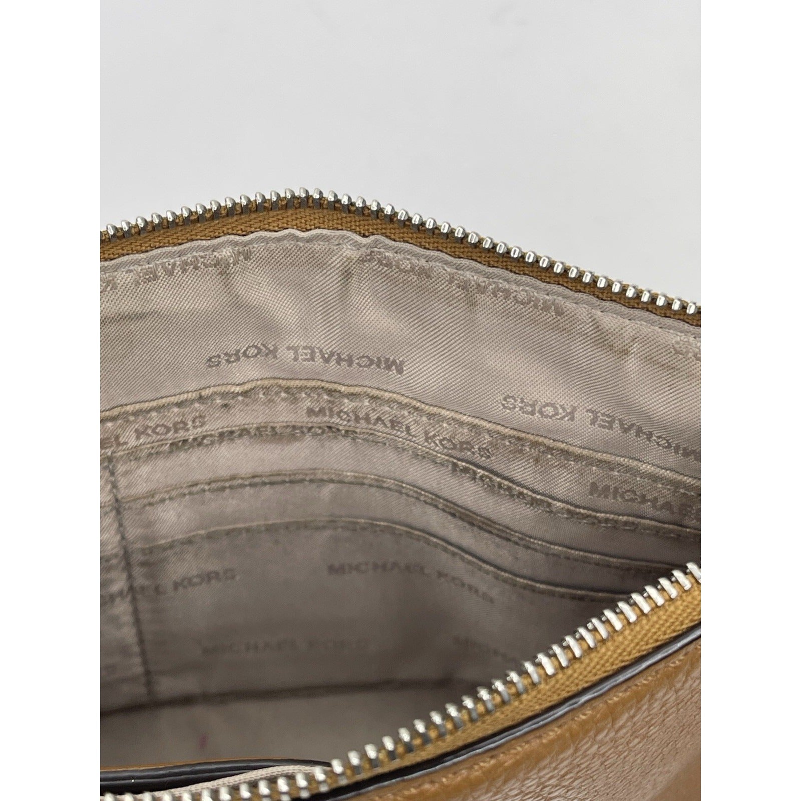 The Michael Kors Brown Wristlet Wallet is a stylish and practical clutch designed for women. Crafted from luxurious leather with a solid brown exterior and a black fabric lining, this wallet features a zip closure and gold hardware accents. It includes inner pockets, a lined interior, and credit card slots for organization. The wristlet design allows for convenient carry, making it perfect for on-the-go use. With its designer brand and high-quality materials, this wallet is a fashionable and functional accessory for any outfit.