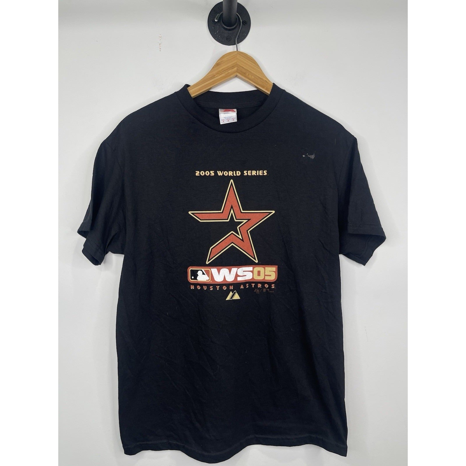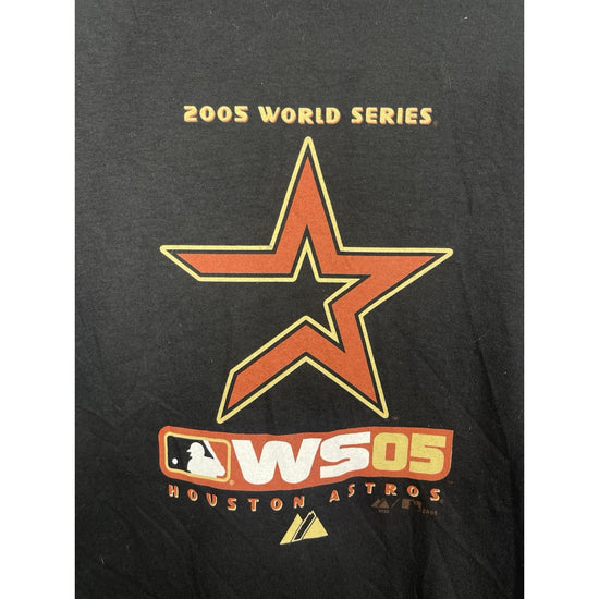 The product is a black medium-sized t-shirt featuring the Houston Astros logo, commemorating their World Series victory in 2005. This officially licensed MLB merchandise is suitable for both men and women, making it a versatile and stylish way for fans to show support for the team. Whether worn to games or casually, this shirt is a must-have for any baseball fan looking to honor the Astros' historic achievement.