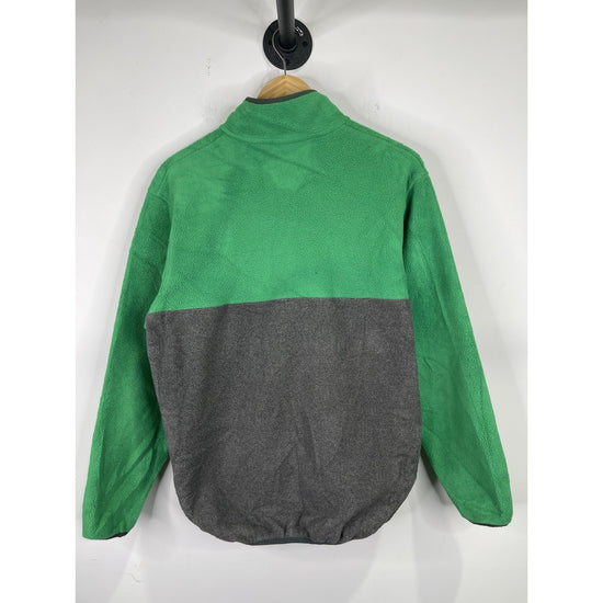 The product is a Men's Small green fleece Synchilla 1/4 snap pullover sweater by Patagonia. This sweater features a solid green color with a tight-knit design, long sleeves, and a mock neck neckline. Made of polyester fleece fabric, it is lightweight and suitable for all seasons, making it perfect for outdoor activities like walking and hiking. It also has accents like button closures and pockets, adding functionality to the stylish pullover design. The Aztec and 90s themes give it a unique and retro vibe, perfect for casual wear.