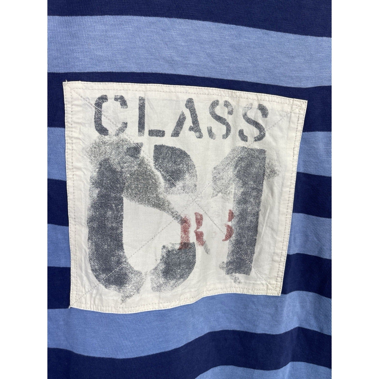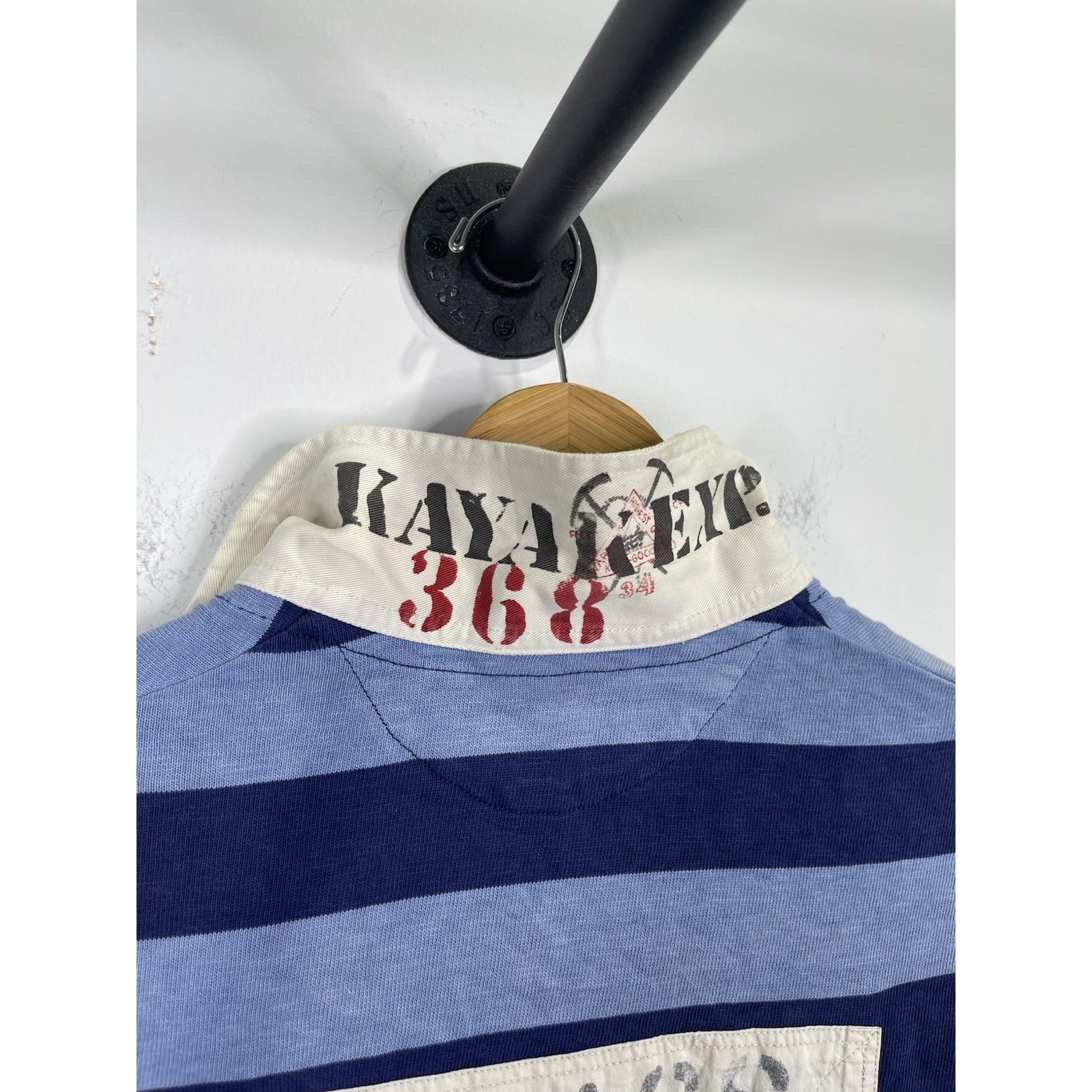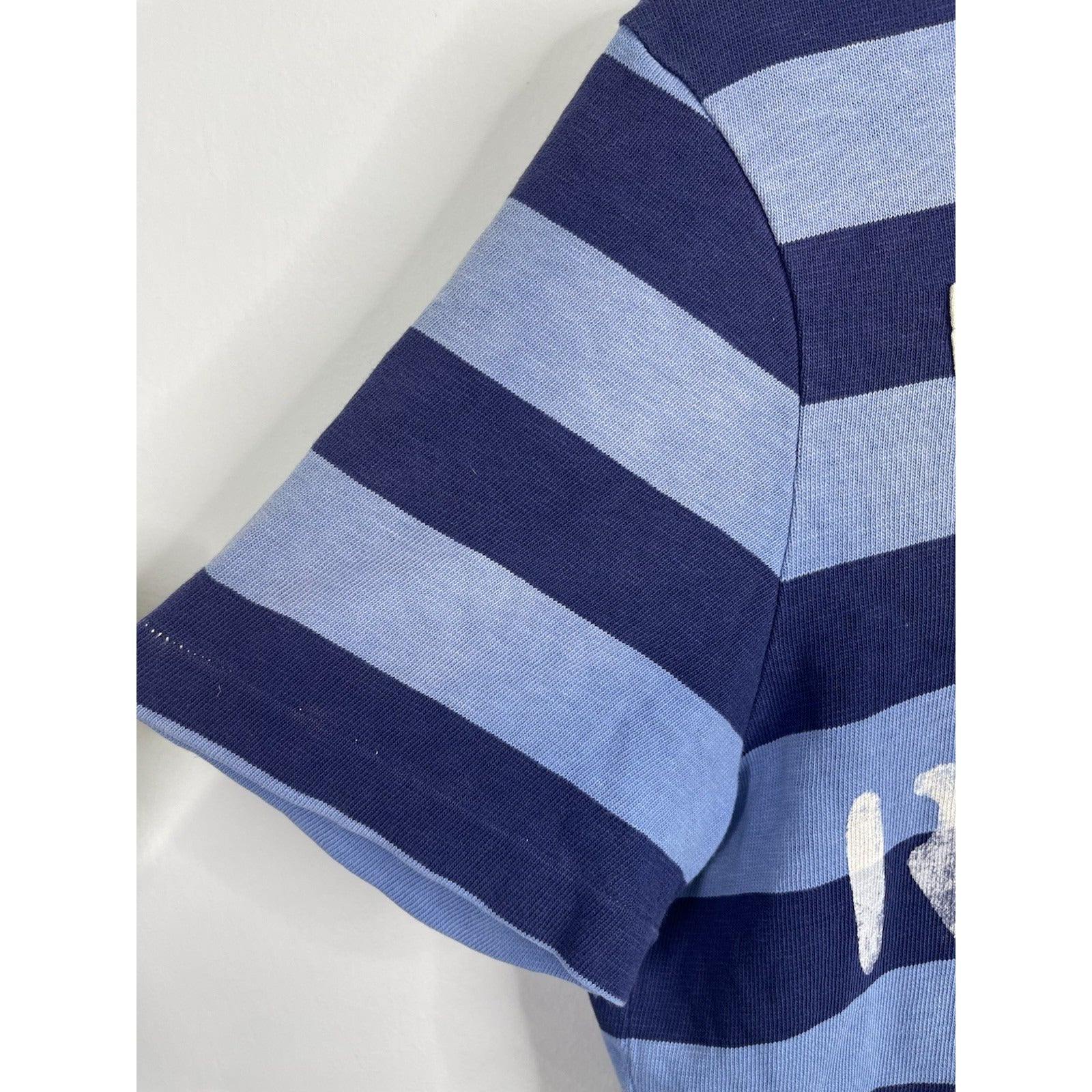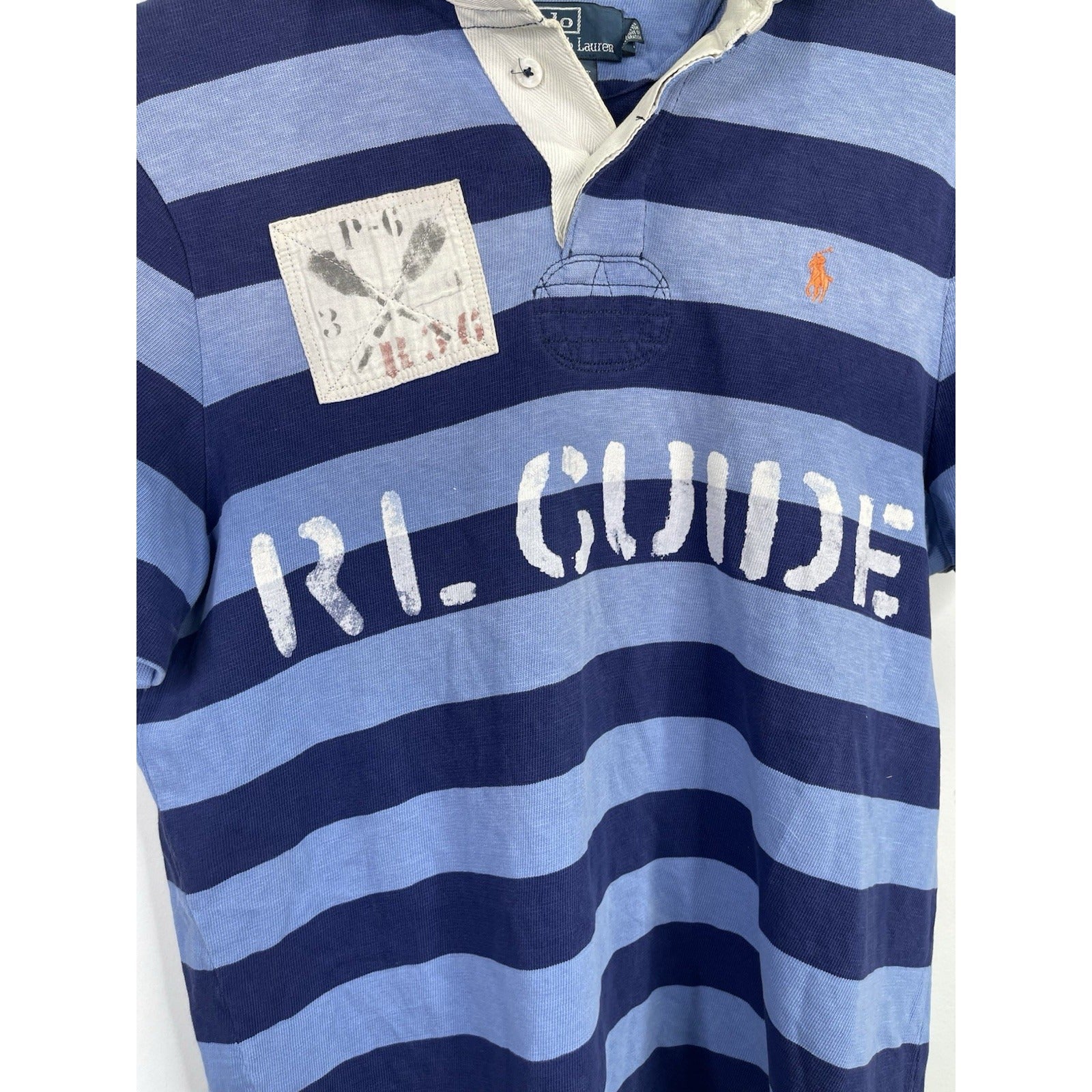 This Polo Ralph Lauren blue men's shirt is a custom fit logo shirt in size L. Made from cotton fabric with a medium wash, this short sleeve polo features a collared neckline and striped pattern. Vintage in style, it bears the iconic Polo Ralph Lauren logo as accents. The regular fit and classic design make it a versatile addition to any man's wardrobe, perfect for a timeless and effortless look.