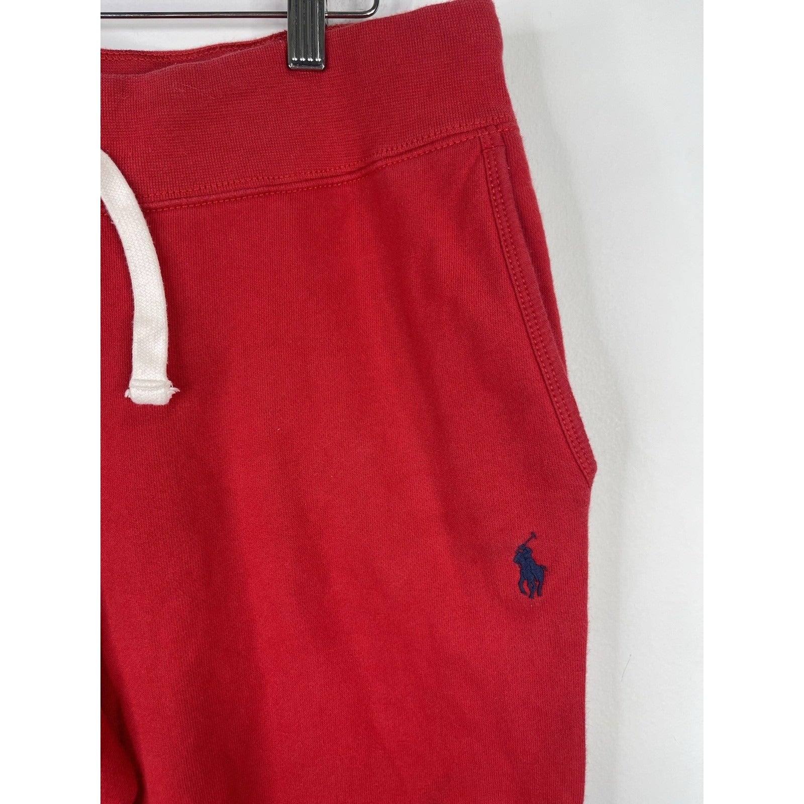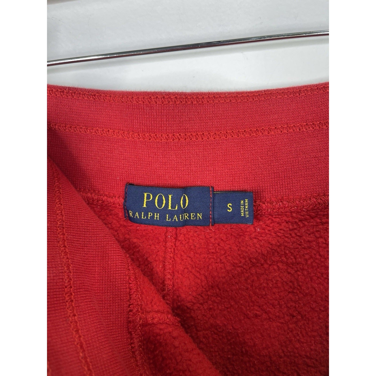 The Polo Ralph Lauren Men's Red Fleece Sweatpants Joggers in size small are perfect for the athleisure trend, with a drawstring closure for a comfortable fit. Made of soft fleece fabric with a stretch technology, these sweatpants feature a classic fit with a tapered leg style, making them ideal for activities like walking and running. The red color with the signature blue pony adds a stylish touch to the pants, which are easy to care for and perfect for the winter, fall, and spring seasons. Made from cotton, these sweatpants also have pockets for added convenience.