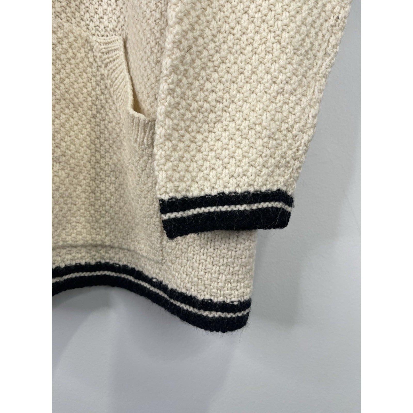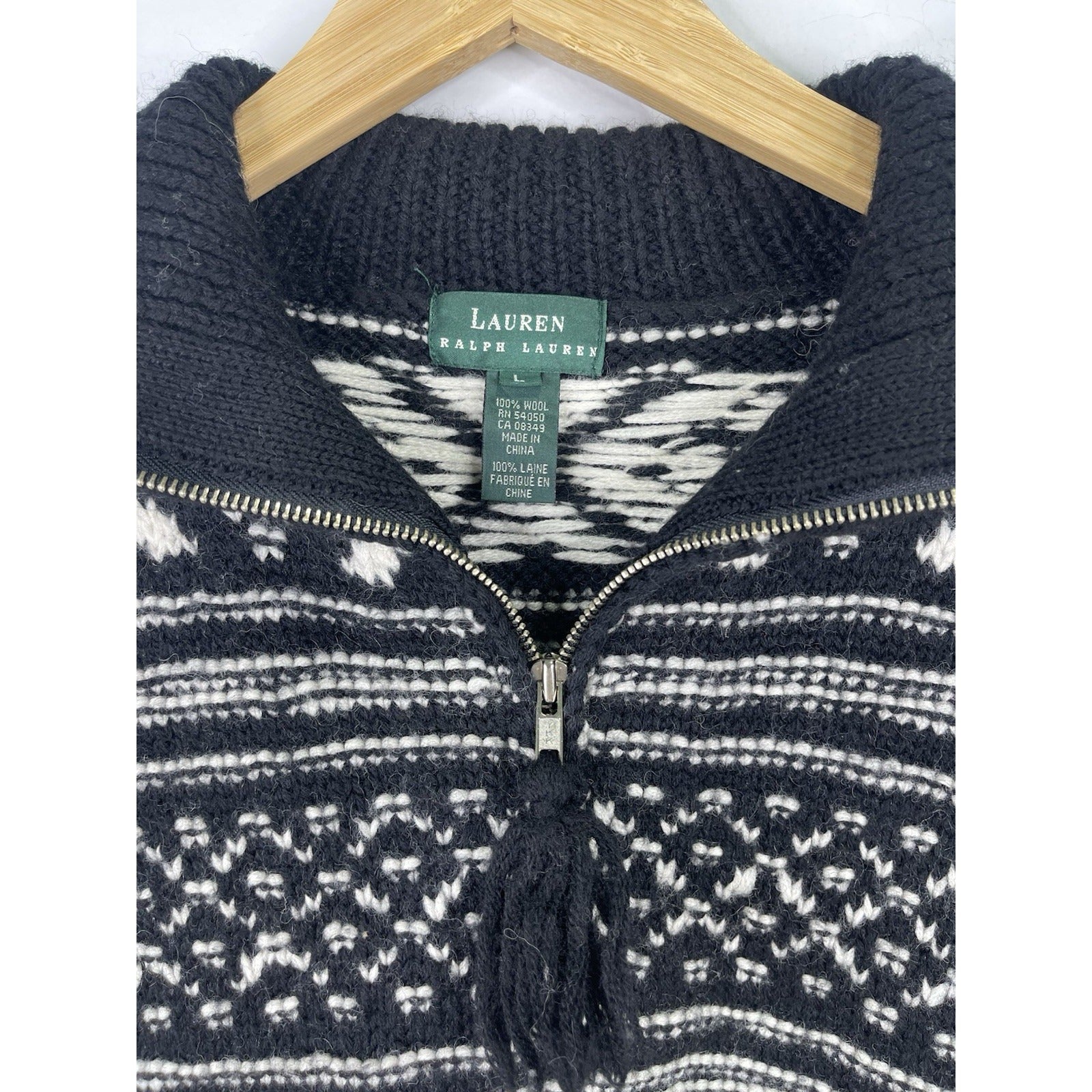 The product is a Ralph Lauren Fair Isles Wool 1/4 Zip Sweater for men in size large. The sweater features a classic black and ivory color scheme with a Fair Isle pattern, made of wool material. It has a 1/4 zip design for easy wear and a regular fit for comfort. Perfect for staying warm and stylish during the colder months.