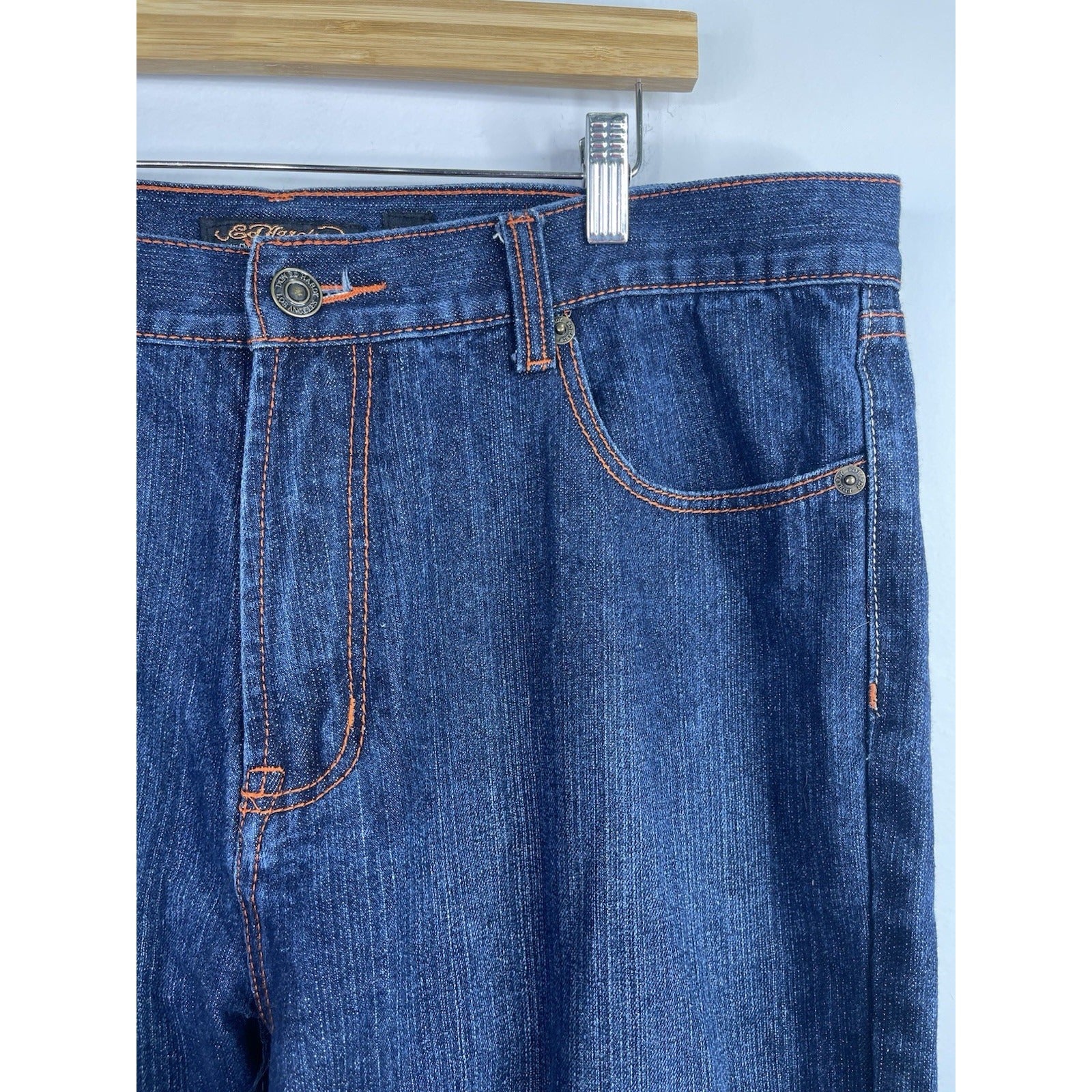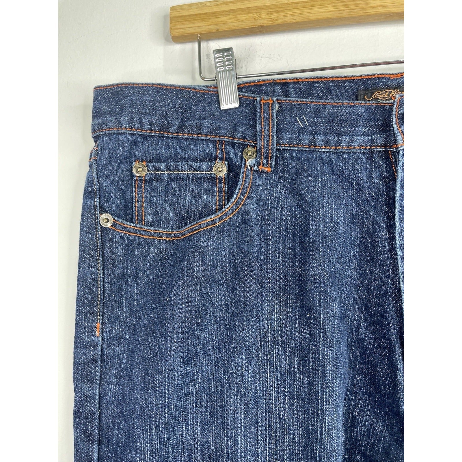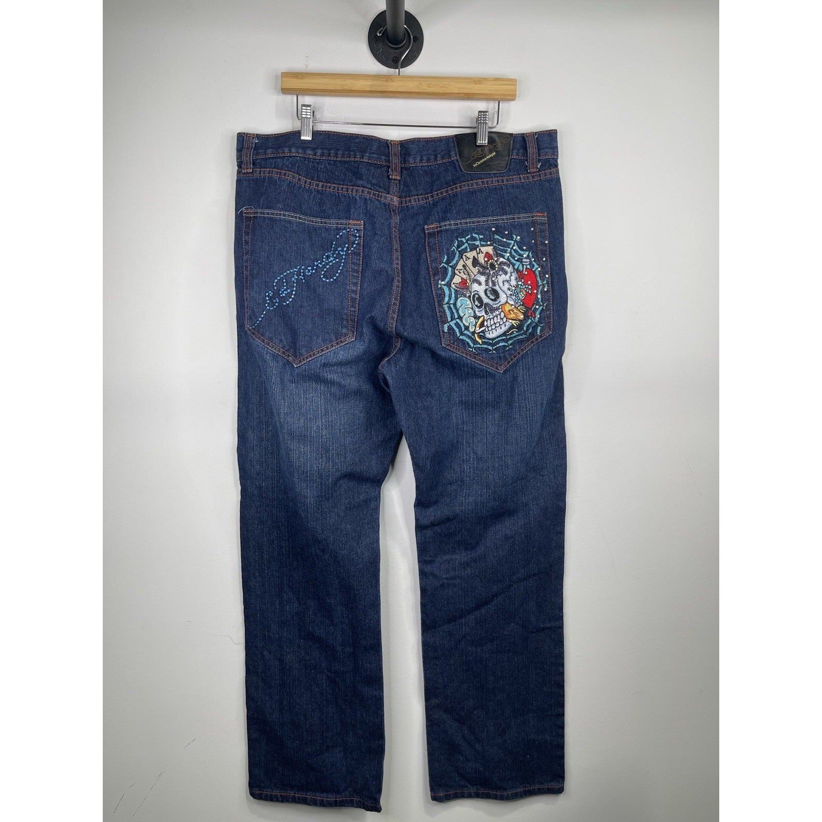 This product is a rare pair of Ed Hardy Skull Rhinestones Baggy Y2K Jeans in size 40x34, featuring skull and heart embroidery. Made of cotton denim with a dark wash, these vintage jeans have a zip and button closure, regular fit, and wide-leg style. The blue color and rhinestone accents give these jeans a unique and edgy look, perfect for those who appreciate art, rock, hipster, and gothic styles from the 90s. With a comfortable design and convenient pockets, these jeans are a statement piece for any fashion-forward individual.