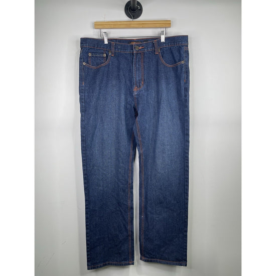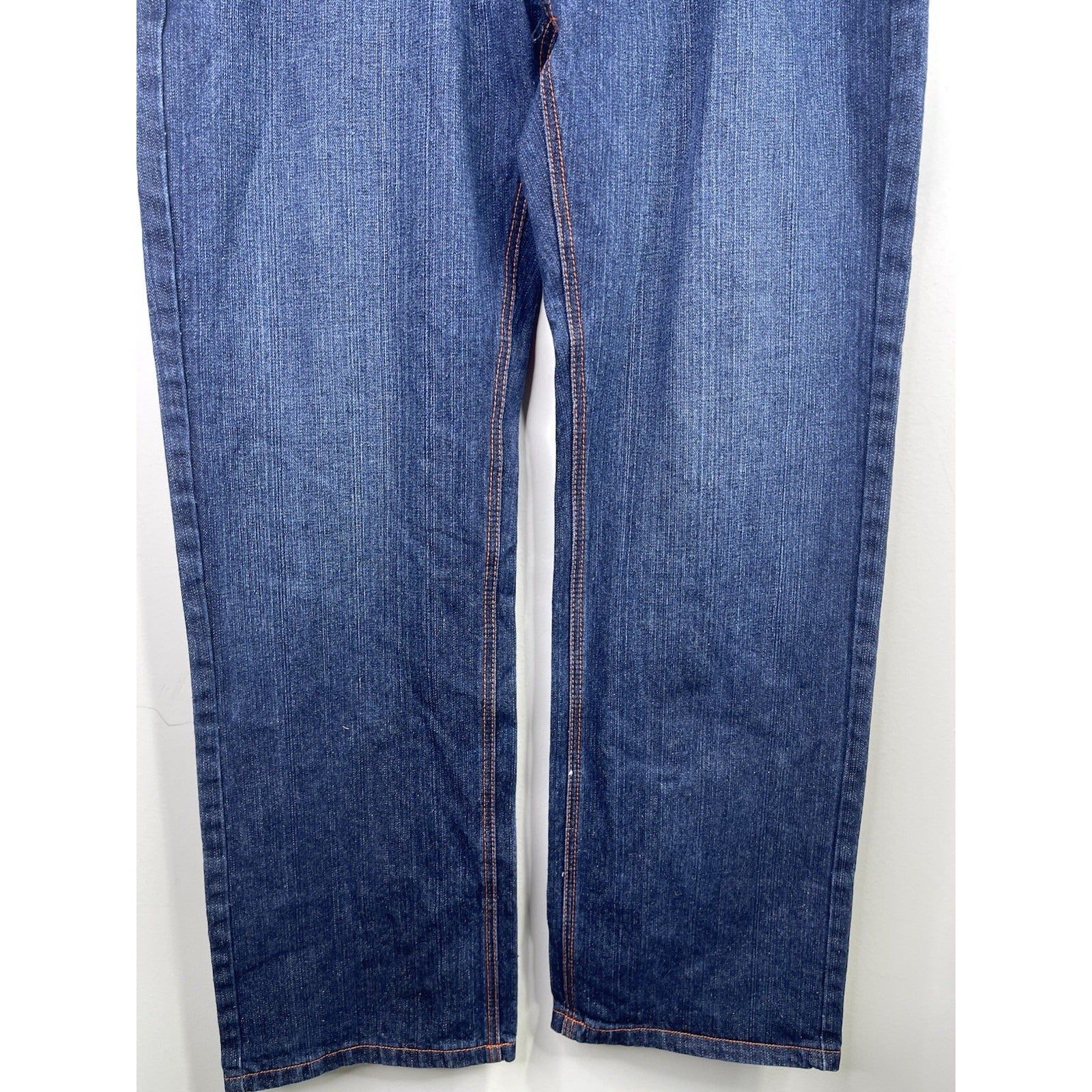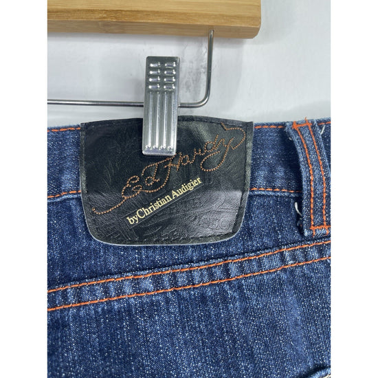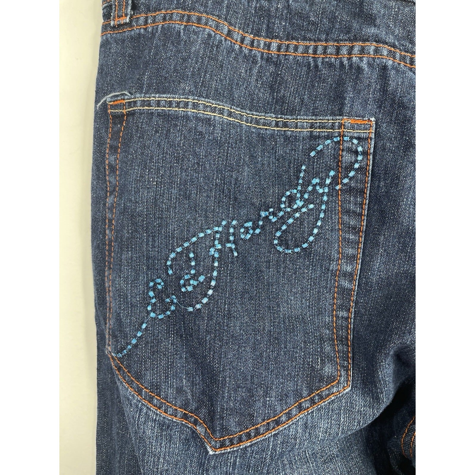 This product is a rare pair of Ed Hardy Skull Rhinestones Baggy Y2K Jeans in size 40x34, featuring skull and heart embroidery. Made of cotton denim with a dark wash, these vintage jeans have a zip and button closure, regular fit, and wide-leg style. The blue color and rhinestone accents give these jeans a unique and edgy look, perfect for those who appreciate art, rock, hipster, and gothic styles from the 90s. With a comfortable design and convenient pockets, these jeans are a statement piece for any fashion-forward individual.