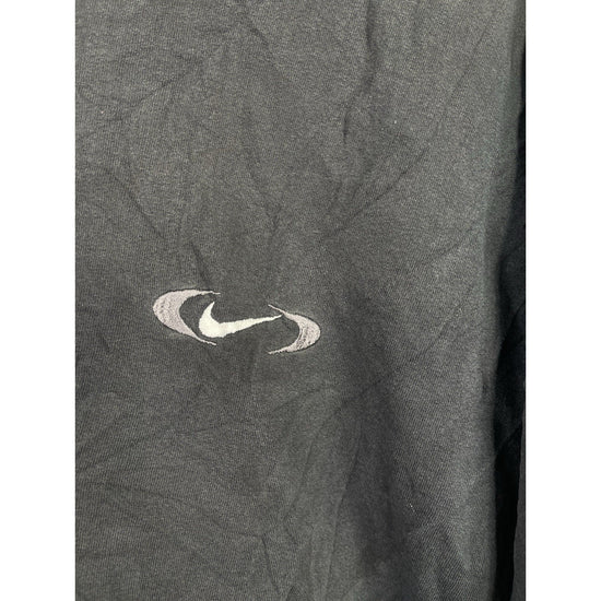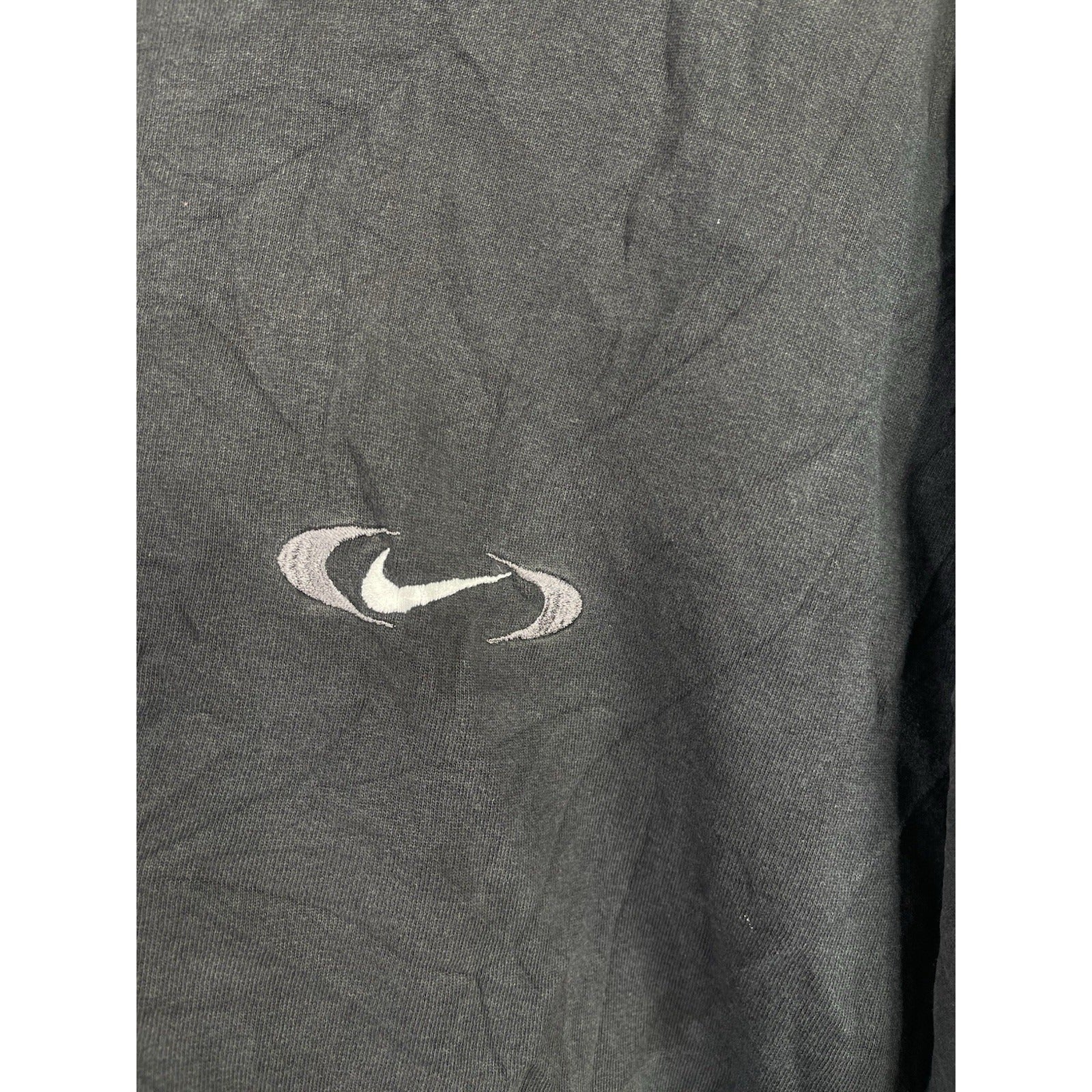 The product is a rare vintage Nike Oval Swoosh Pullover Crewneck Sweatshirt from the 90s or 2000s in black. This sweatshirt features a solid pattern, crew neckline, and is made of a 95/5 cotton-polyester blend material. It is a size large and is perfect for men looking for streetwear style activewear. The sweatshirt is a classic piece with a unique design that is sure to make a statement in any wardrobe.