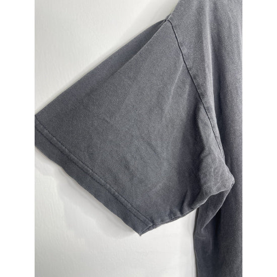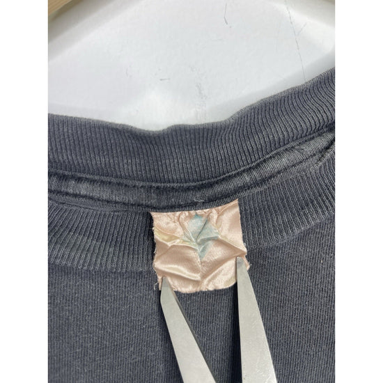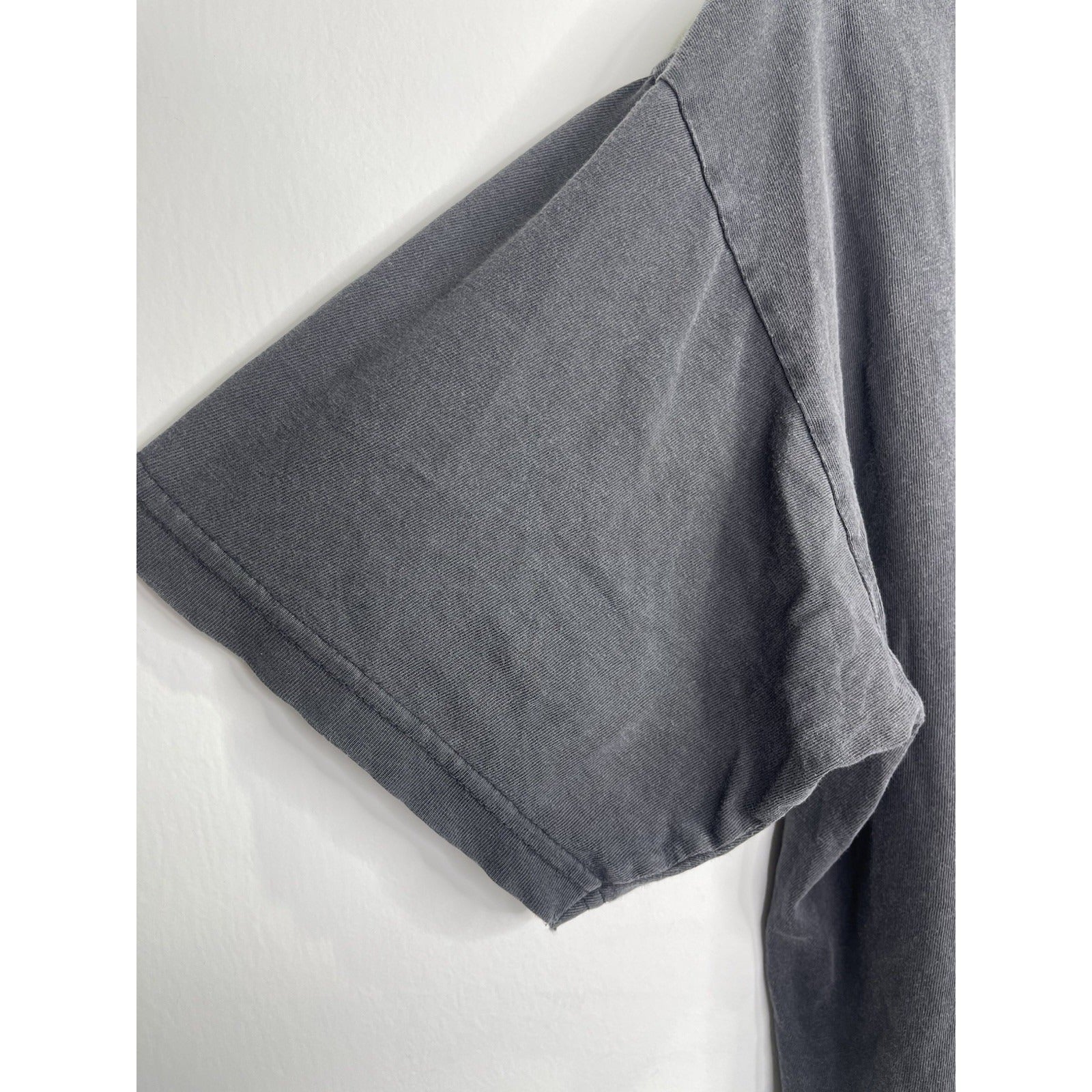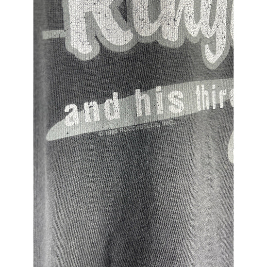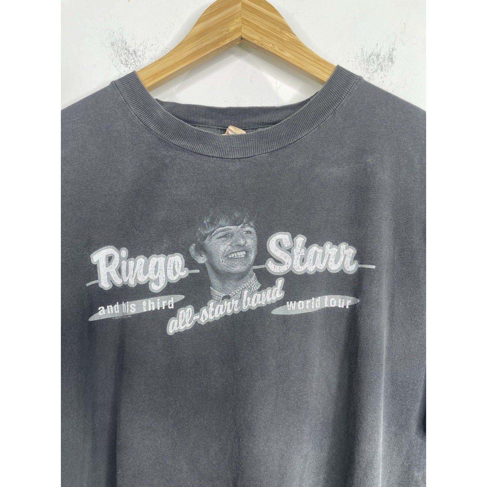 This vintage black T-shirt from 1995 features a crew neck and short sleeves, made of cotton fabric with a double-sided graphic print of Ringo Starr and the Beatles. The shirt belongs to the unisex adults department and is machine washable. Perfect for fans of 90s music and classic rock, this collectible shirt is a stylish addition to any wardrobe.