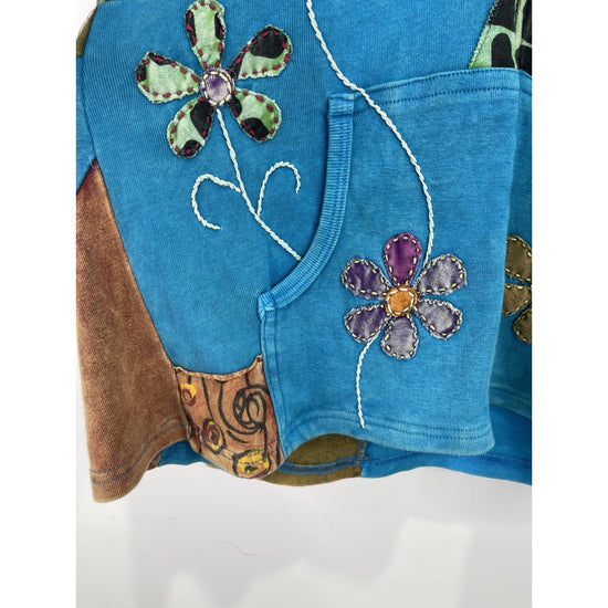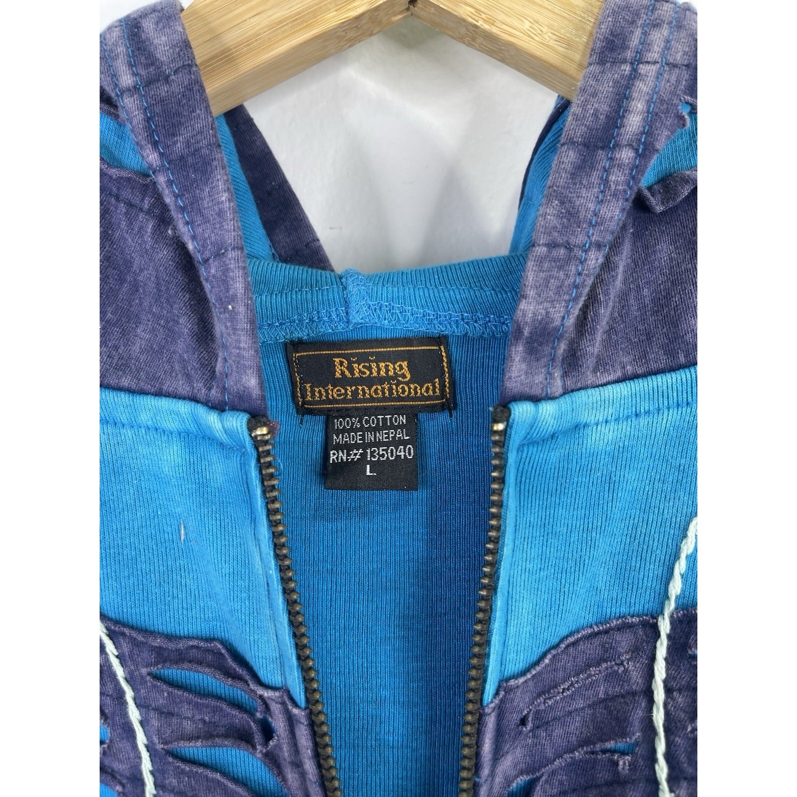 This Rising International women's artsy unique full zip jacket in size L is perfect for those embracing a boho hippie style. Made from cotton, this blue jacket features a full zip design, making it both stylish and comfortable. The jacket is designed for regular sizing and is ideal for women looking to add a touch of individuality to their wardrobe. With its basic jacket style and hippie theme, this piece is sure to stand out and make a statement.