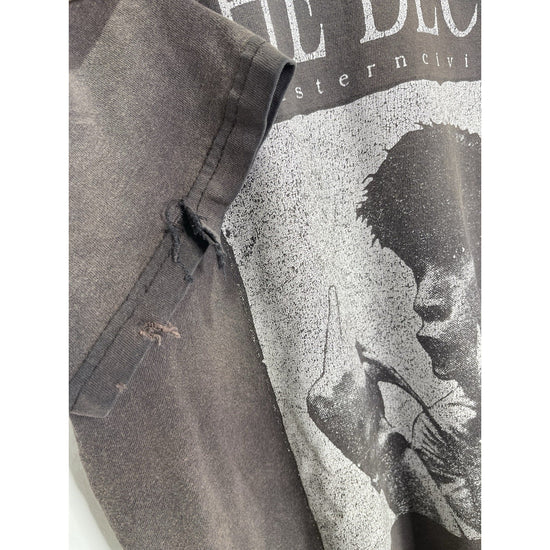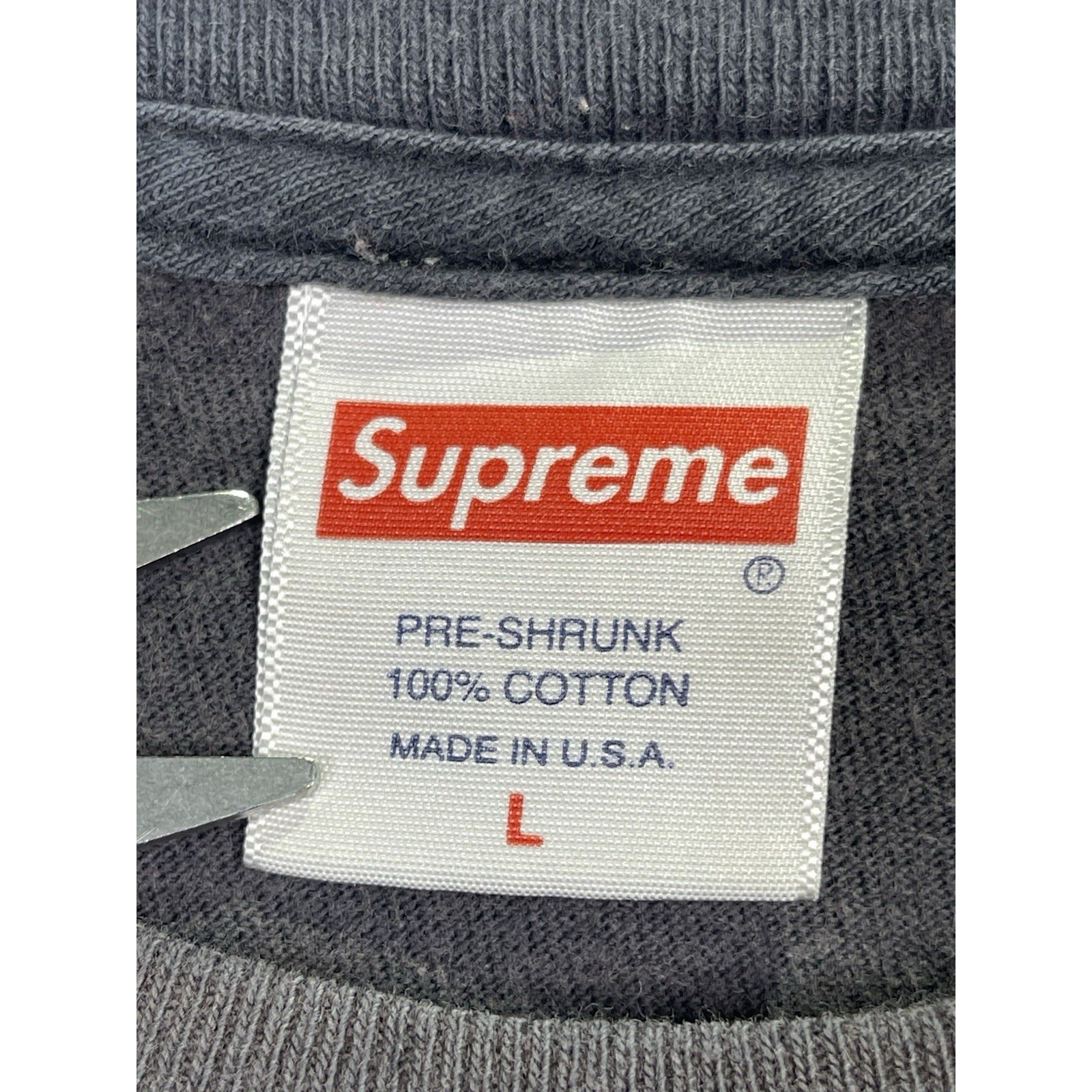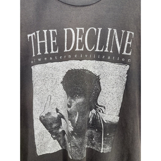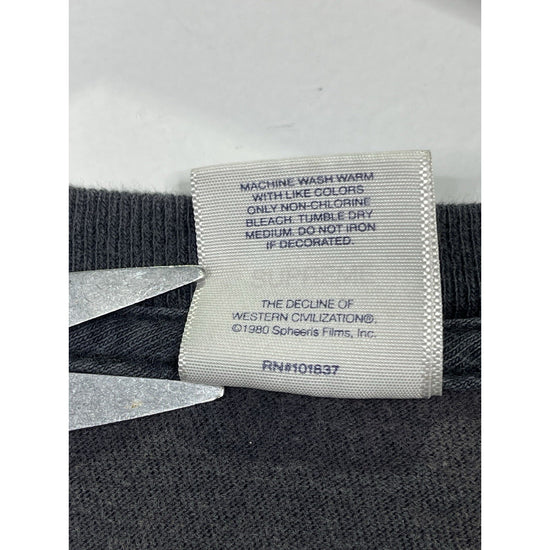 The Supreme The Decline Of Western Civilization Black T-shirt in size Large features a graphic print design with a Western theme. Made from cotton with a regular fit, this vintage style shirt has a crew neck and short sleeves, making it a versatile piece for all seasons. The black color and Supreme branding add a stylish touch to this classic men's t-shirt, perfect for those who appreciate a mix of streetwear and historical references in their fashion choices. Made in the United States, this shirt is a must-have for fans of the brand and those looking to make a statement with their clothing.