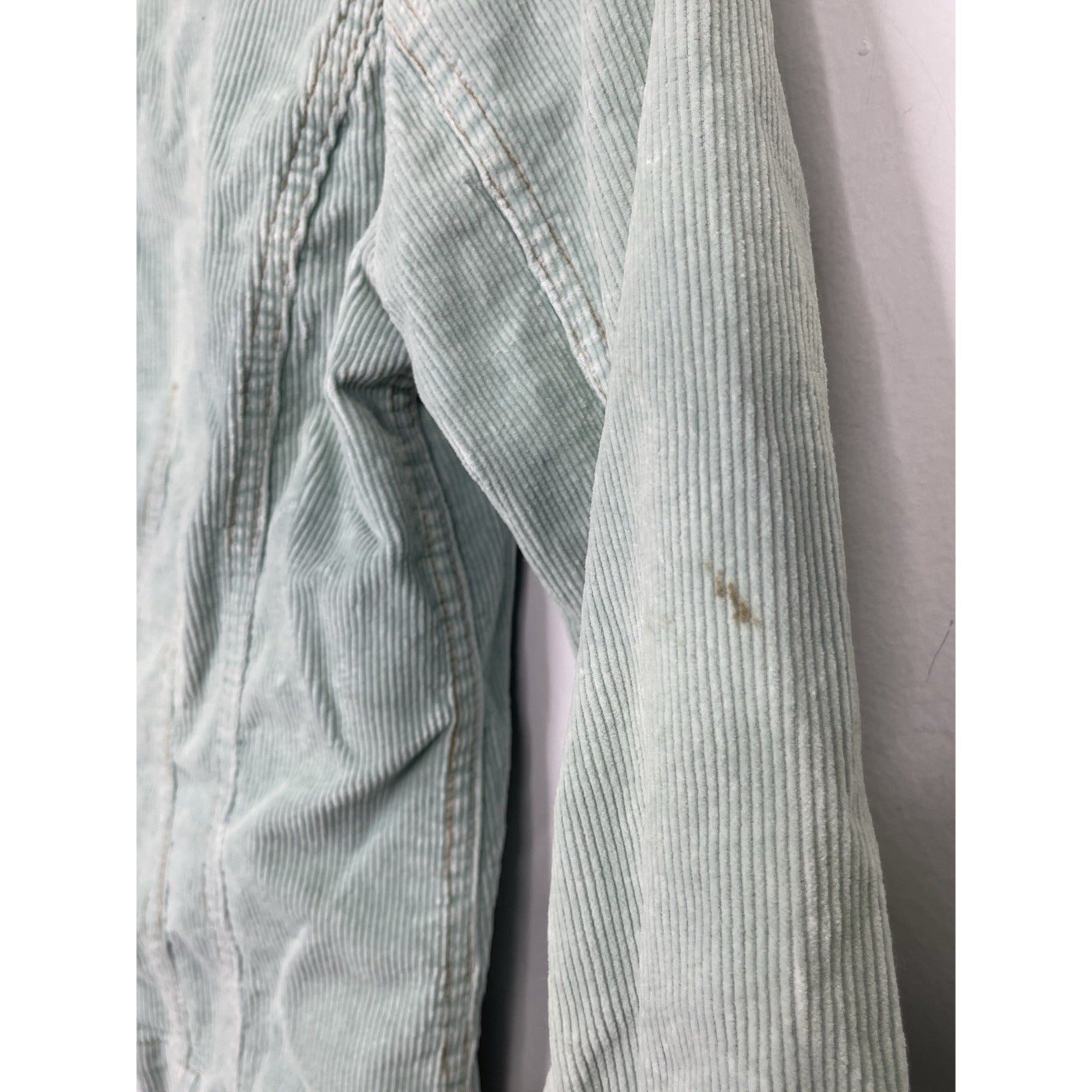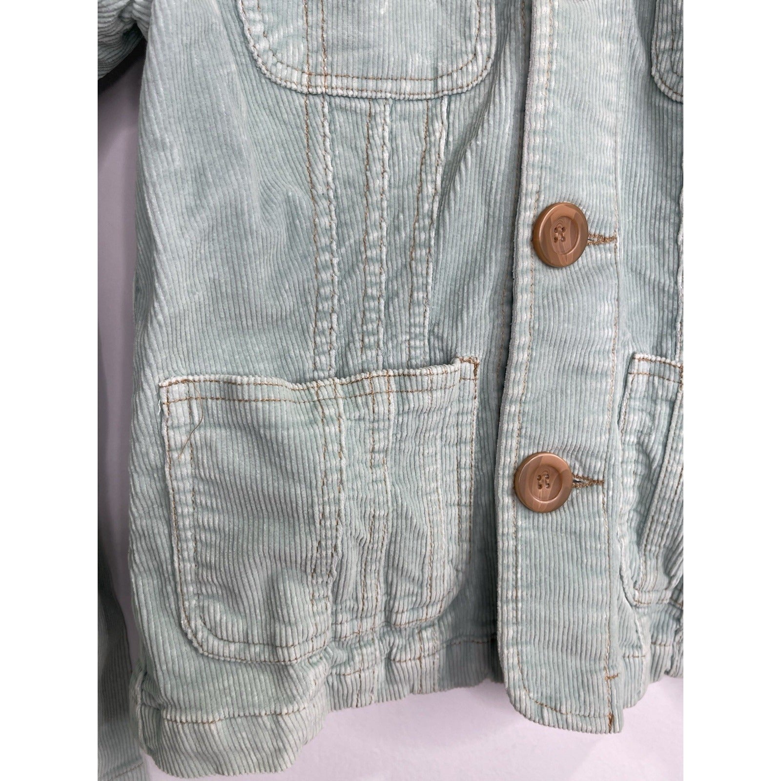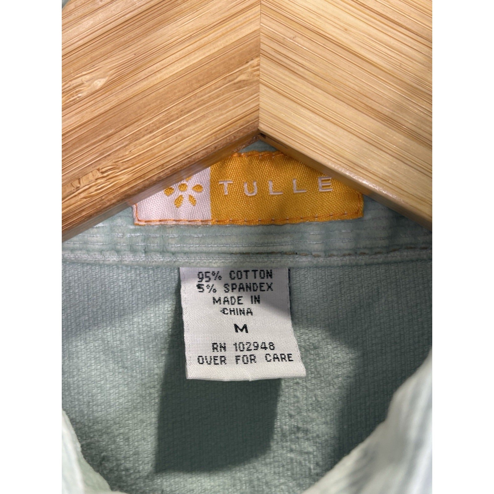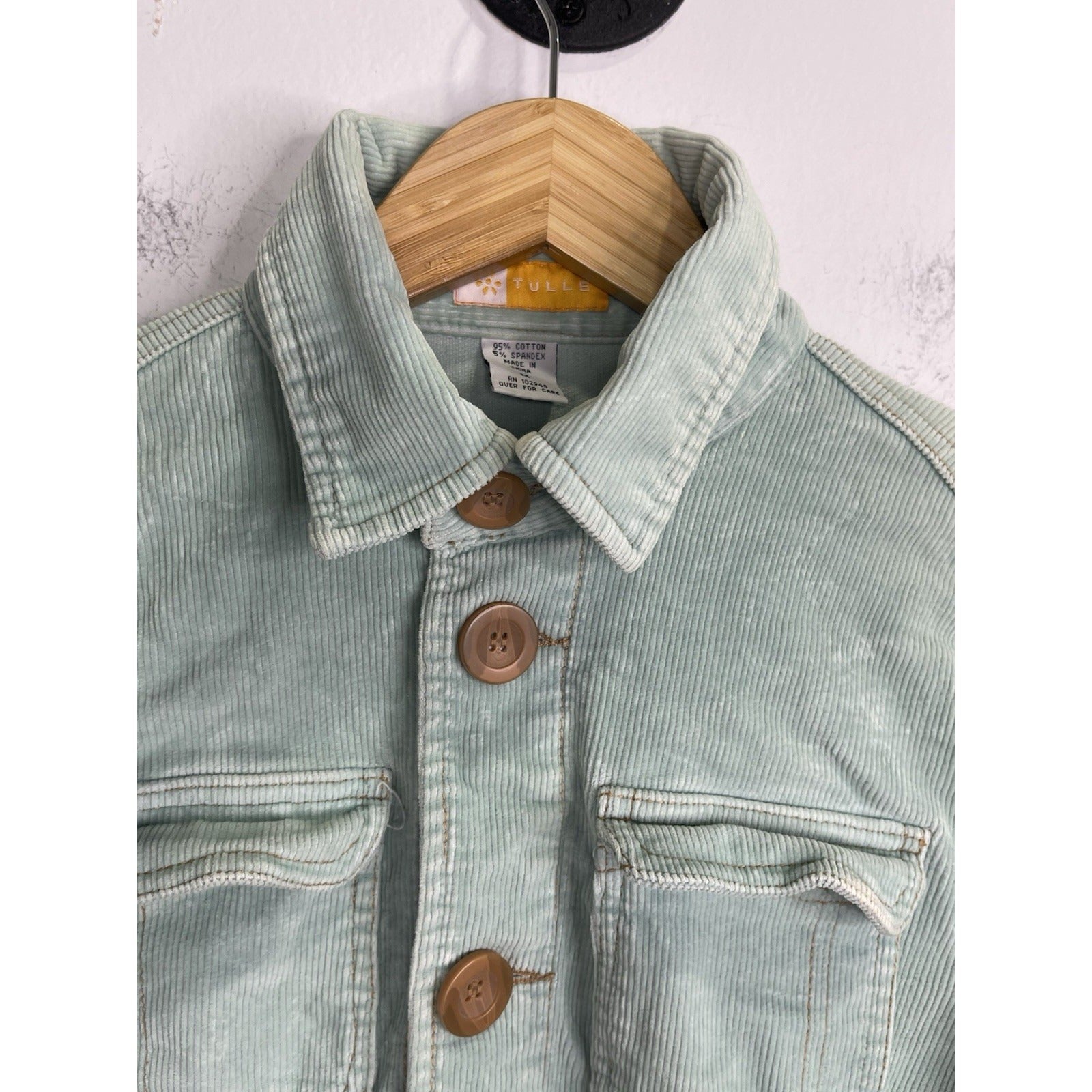 The Tulle Petite Women's Light Blue Corduroy Jacket in size M features a retro style with a button front closure and a collared neckline. Made from a comfortable cotton blend material, this jacket is perfect for various occasions such as travel, parties, or casual wear. The solid blue color and corduroy fabric give it a classic yet stylish look, making it a versatile piece for the winter, fall, and spring seasons. The jacket also includes pockets for added convenience. Perfect for petite women who appreciate a blend of vintage charm and modern style.