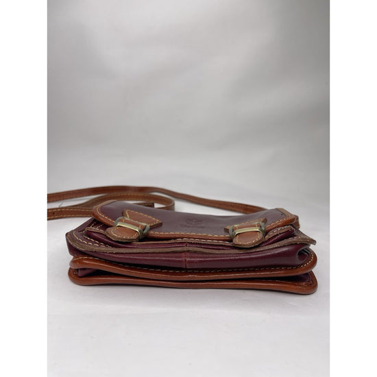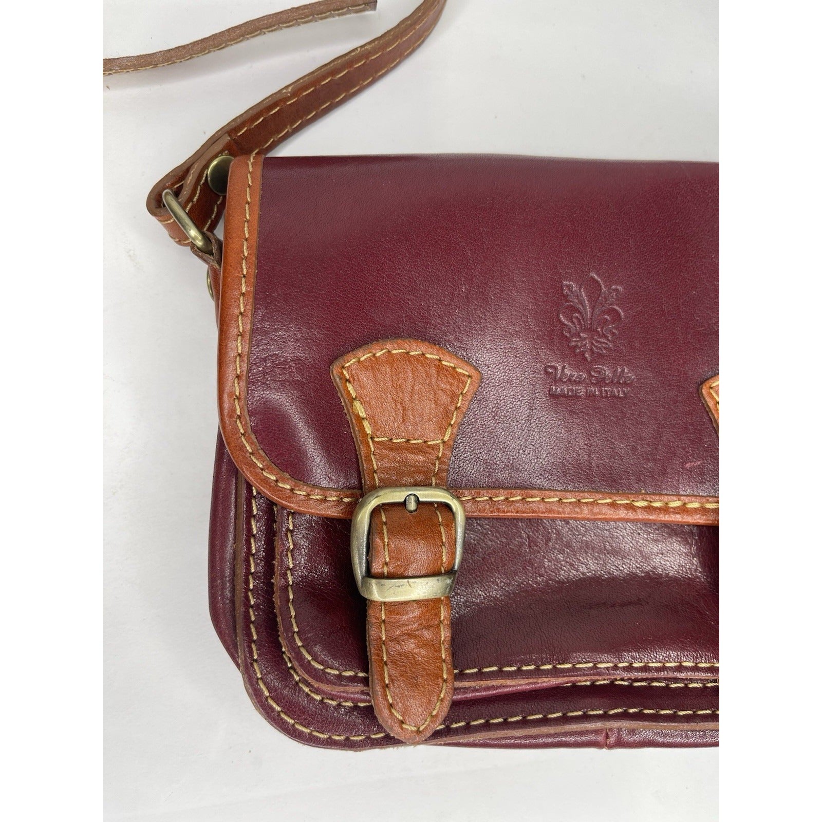 The Vera Pelle Florence Made in Italy Wine Red Cowhide Leather Crossbody Bag is a stylish and compact accessory for women. Crafted from high-quality leather with a solid wine red exterior and gold hardware accents, this small crossbody bag features a convenient magnetic closure and a brown leather strap for easy wear. The beige leather lining adds a touch of elegance to the overall design, making it the perfect choice for on-the-go fashion. Made in Italy by the reputable brand Vera Pelle, this bag combines sophistication and functionality for a chic look.
