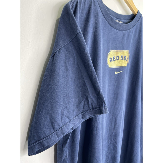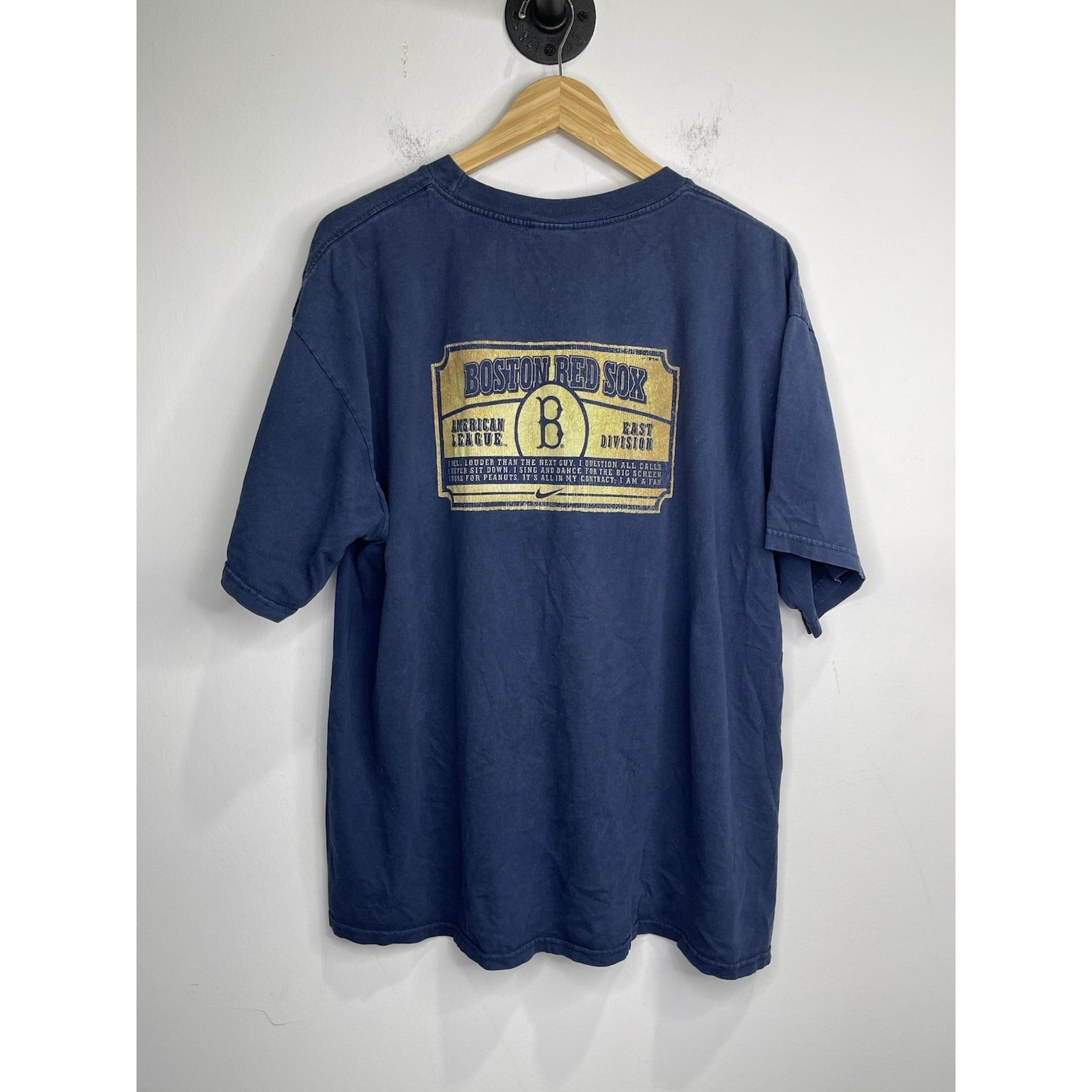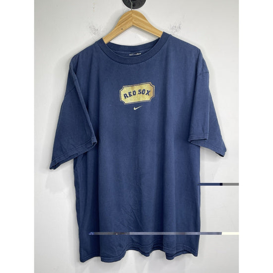 This Vintage 00s Nike Center Swoosh Boston Red Socks T-shirt in size XL features the iconic Nike Swoosh design on the center chest, representing both the brand and the Boston Red Sox team. The red color adds a classic and bold touch to this men's T-shirt, perfect for any nostalgic sports fan or sneaker enthusiast looking to add a unique piece to their collection. Made by Nike, this shirt is sure to be high quality and stylish, making it a standout addition to any wardrobe.