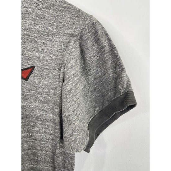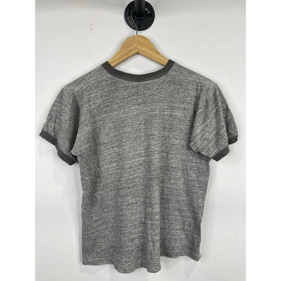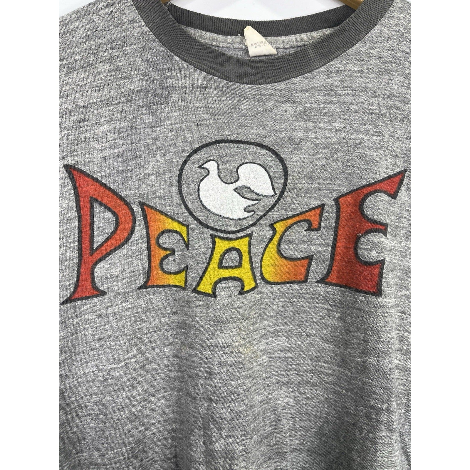 This Vintage 1970's Men's PEACE Grey T-shirt in size M is a classic piece with a crew neck and short sleeves, perfect for all seasons. Made of cotton in the United States, this graphic print shirt features a regular fit and a 70s theme, making it a timeless addition to any wardrobe. The peaceful character of the design adds a touch of nostalgia and unity to this versatile t-shirt from Sportswear.