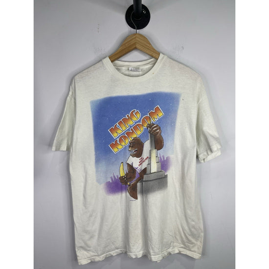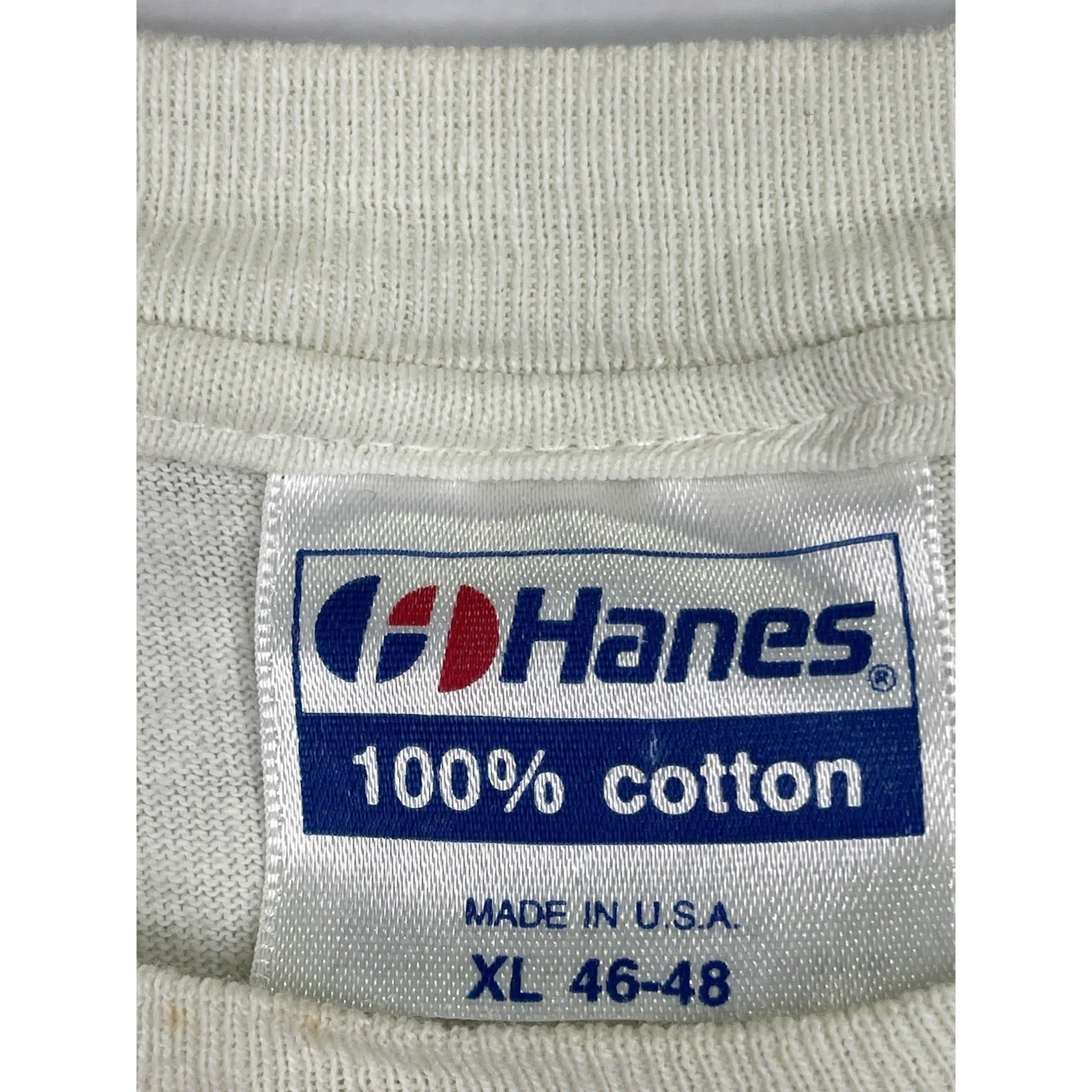 The Vintage 1987 King Kondoms Promo T-shirt in size XL is a classic piece from the 90s era. Made by Hanes, this regular fit T-shirt features a graphic print design that adds a retro touch to any outfit. The white color and short sleeve style make it versatile for all seasons, perfect for adding a unique vintage flair to your wardrobe.