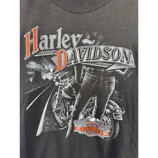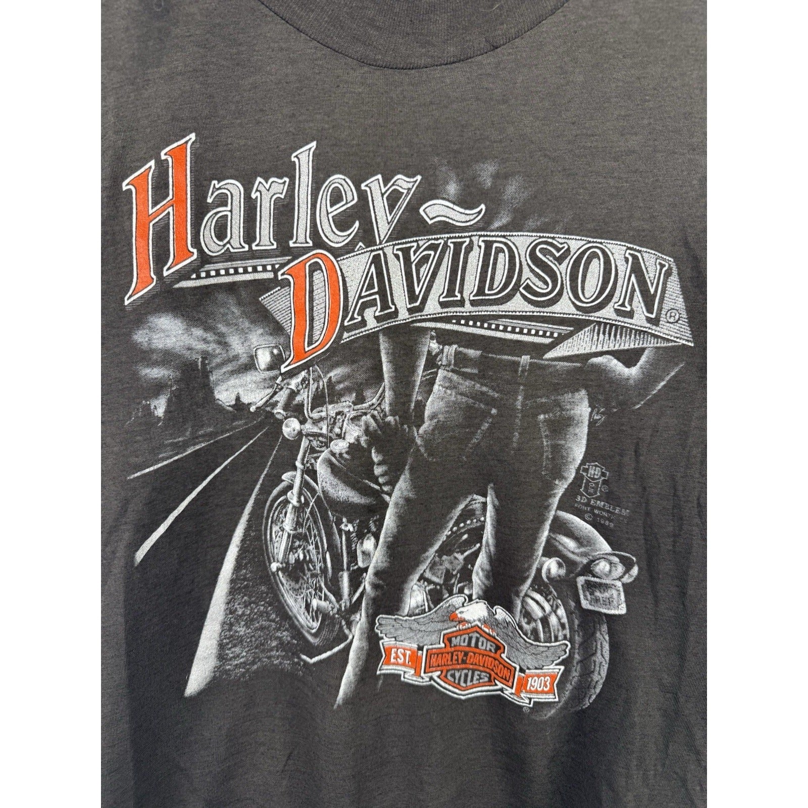 This Vintage 1989 Harley Davidson 3D Emblem T-shirt in size M is a classic piece of men's clothing that showcases the iconic Harley-Davidson brand. The black shirt features a short sleeve design and is decorated with the Harley-Davidson emblem, making it a perfect choice for biker and motorcycle enthusiasts. With its 80s theme and vintage appeal, this shirt is a timeless addition to any wardrobe, ideal for those who appreciate retro style and quality craftsmanship.