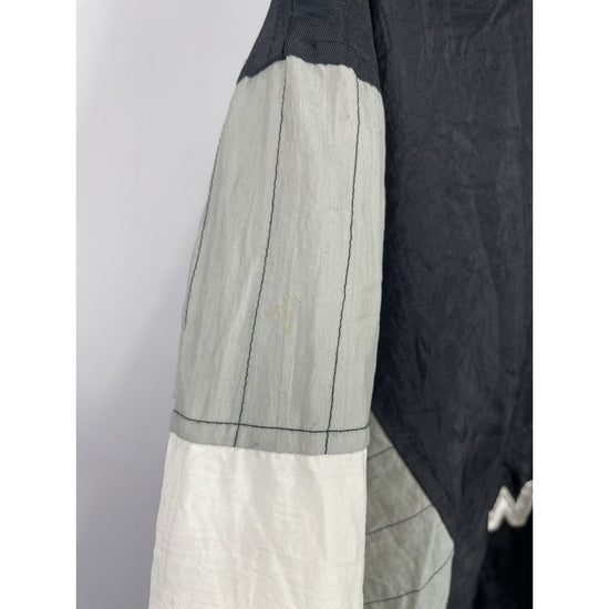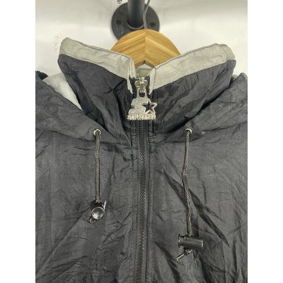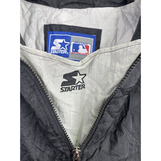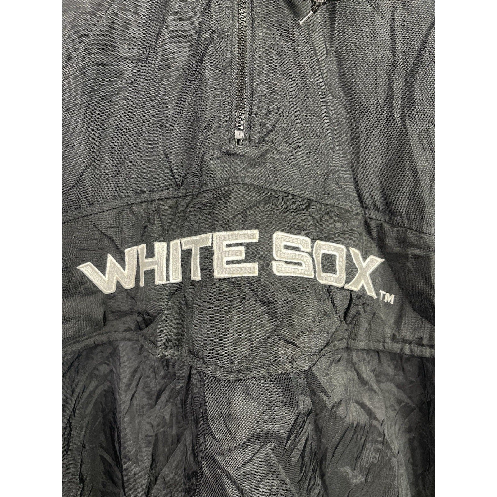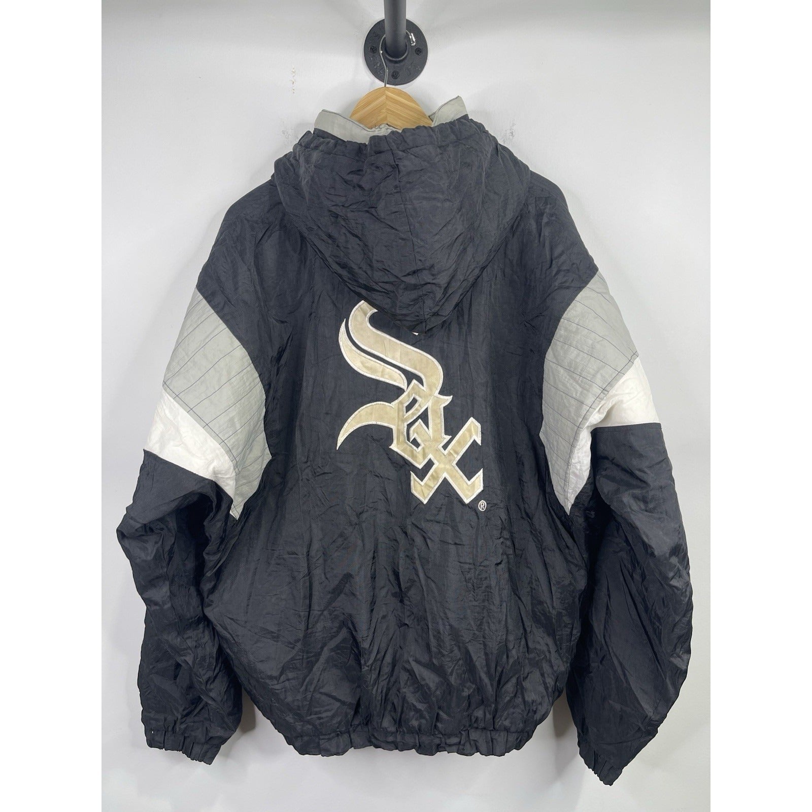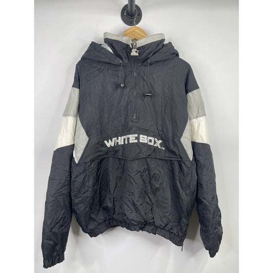 The Vintage 1990s STARTER Chicago White Sox Baseball 1/4 Zip Puffer Jacket in size L is a unique and stylish piece perfect for any baseball fan or collector. Made of polyester with a softshell fabric type, this mid-length jacket features an embroidered White Sox logo and button accents, adding a touch of nostalgia to your wardrobe. The limited edition design, combined with its vintage appeal, makes it a standout choice for both casual and formal occasions. Whether you're traveling, attending a party, or simply looking for a warm winter coat, this Starter jacket is sure to make a statement.