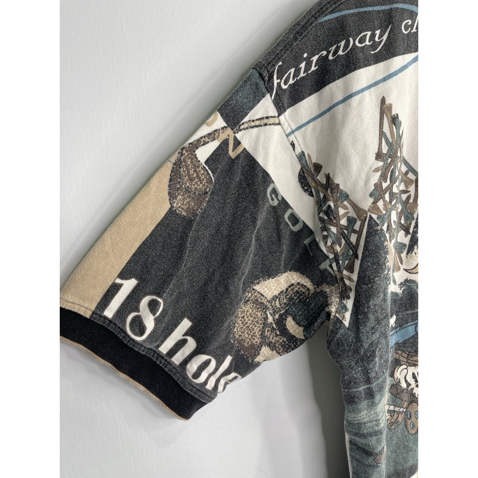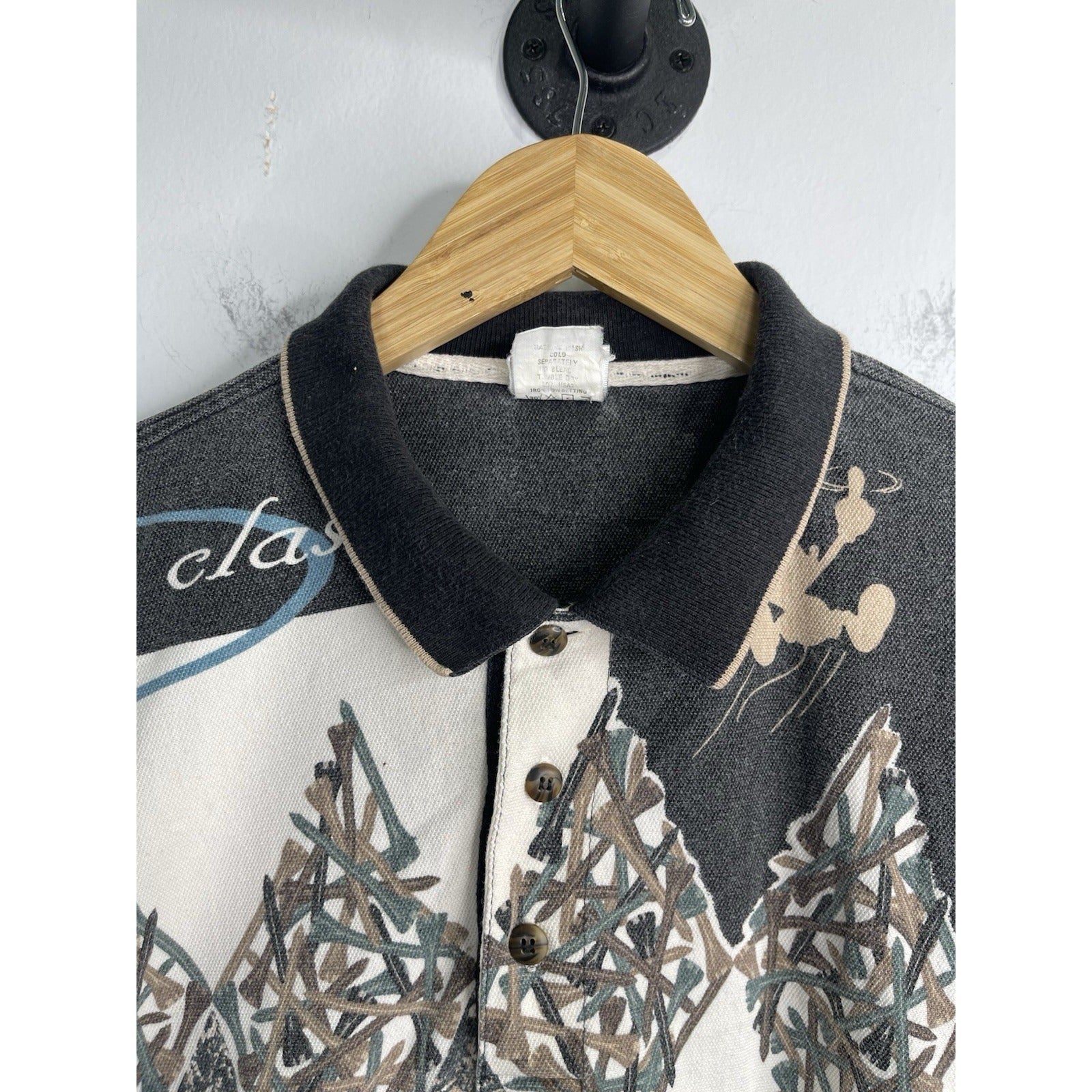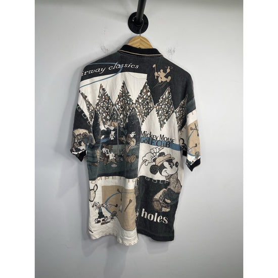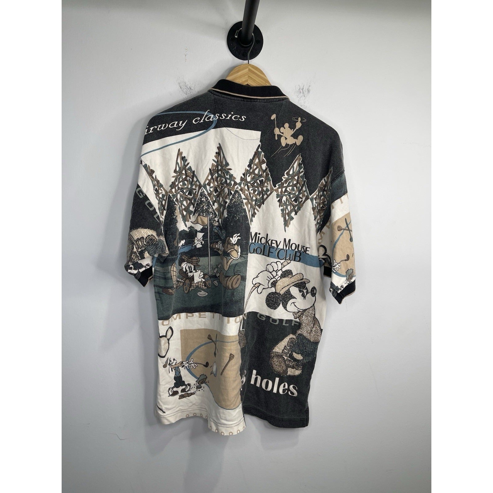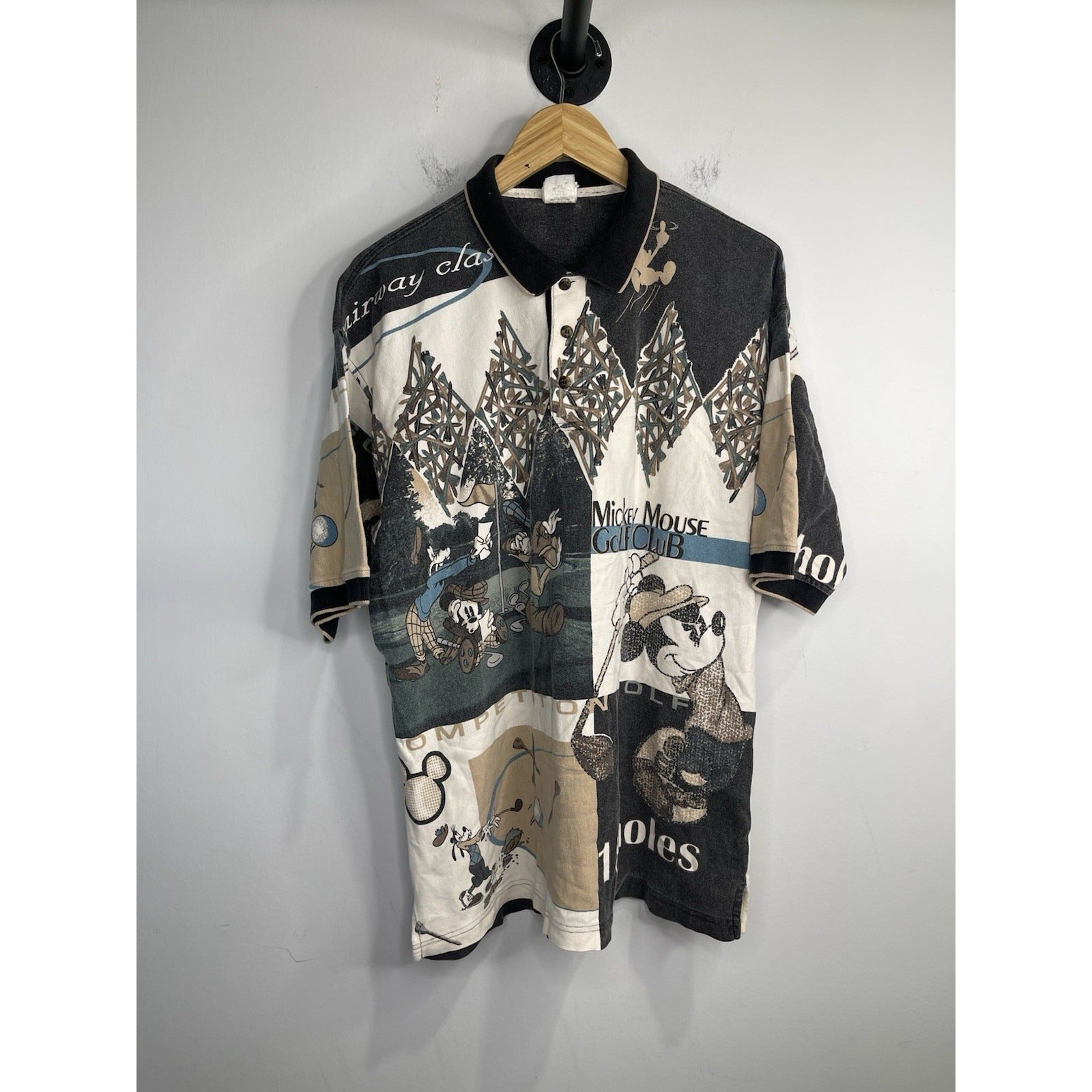 This Vintage 1990s THE DISNEY STORE Mickey Donald Duck Goofy Golf Club Polo Shirt XL is a colorful and playful piece with an all-over print featuring iconic Disney characters like Mickey Mouse. Made of 100% cotton, this short-sleeve polo shirt has a collared neckline and button accents, perfect for casual occasions. The regular fit and XL size make it comfortable and stylish for men who appreciate vintage Disney merchandise from the 90s. Perfect for golf enthusiasts or fans of cartoon and 90s-themed clothing, this machine washable shirt is a nostalgic addition to any wardrobe.