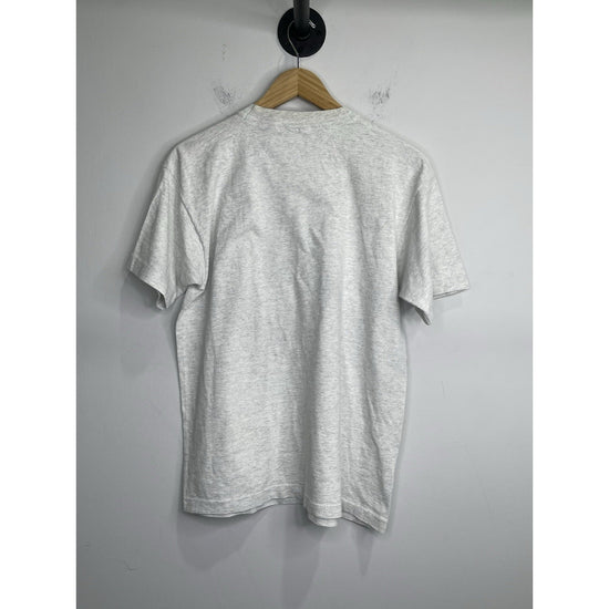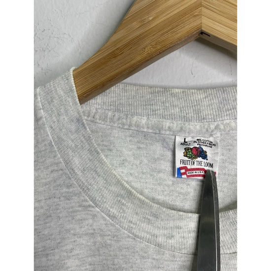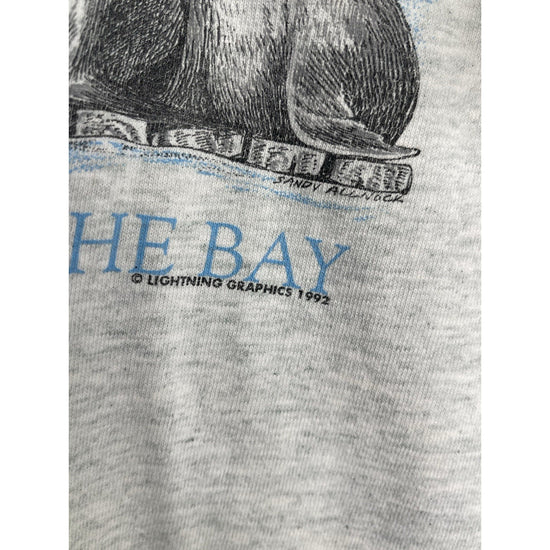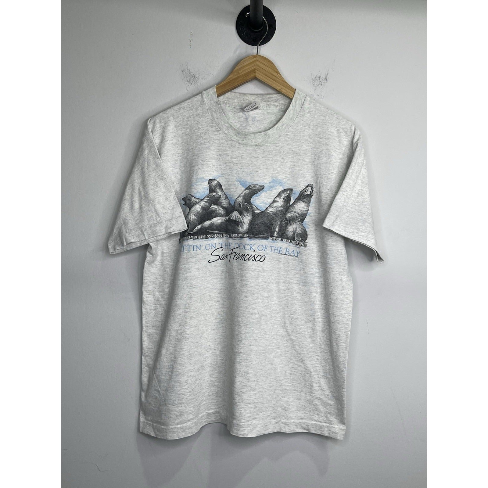The product is a vintage 1992 Sittin On The Dock Of The Bay Seal Grey T-shirt in size Large. This regular fit T-shirt features a solid gray color with a crew neck and short sleeves. The shirt has a 90s theme and is perfect for men who appreciate vintage clothing from that era. The design and style of this T-shirt make it a unique and stylish addition to any wardrobe, especially for those who enjoy classic and retro fashion choices.