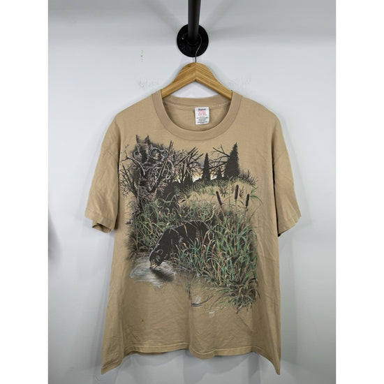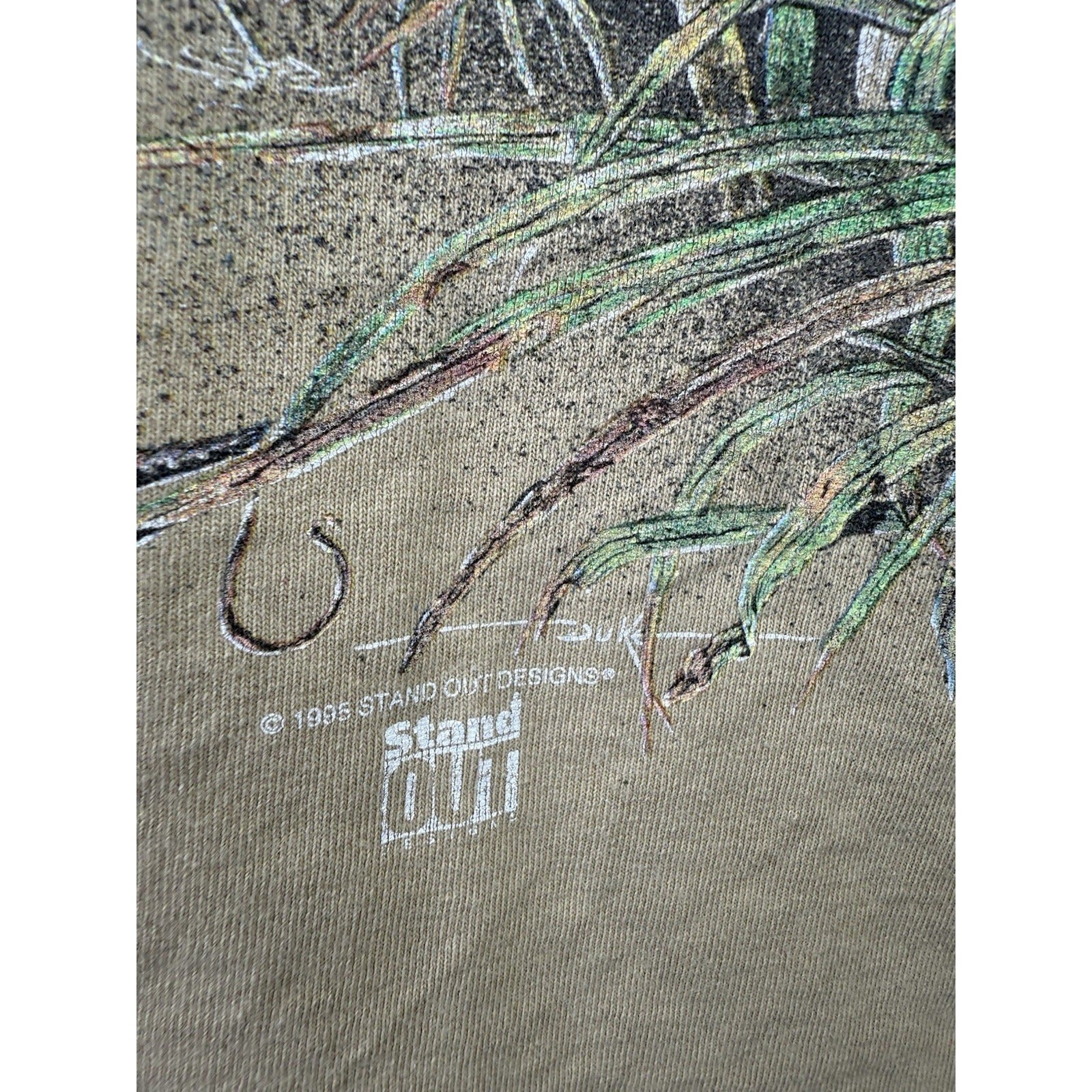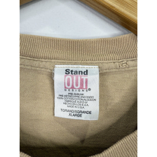 The Vintage 1995 Bears Nature T-shirt in size XL is a unique piece with short sleeves, a crew neck, and a regular fit. Made by Stand Out in the United States, this brown t-shirt features a nature theme that perfectly captures the essence of the 1990s. The retro design and vintage appeal make it a standout addition to any man's wardrobe, perfect for those who appreciate classic style and nostalgic aesthetics.
