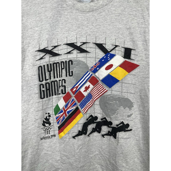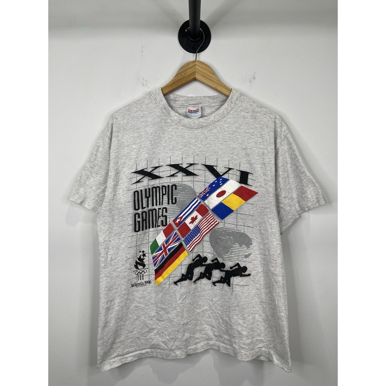 The product is a vintage 1996 Atlanta Georgia Olympic Games XXVI flags t-shirt in size XL. It is officially licensed by the Olympics and features the USA team flag. The shirt is unisex adult size and color white, making it a unique and nostalgic item for fans of the 1996 Atlanta Olympics. Made by Hanes, this t-shirt holds significance as a piece of sports memorabilia from a historic event.