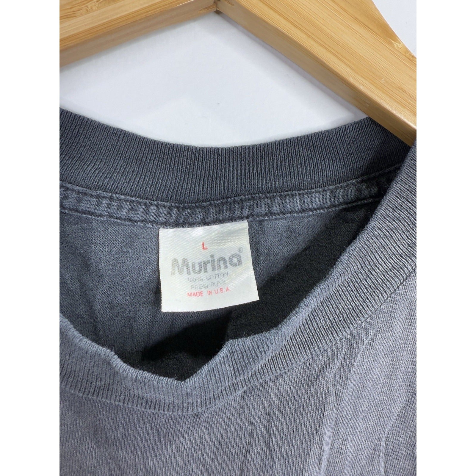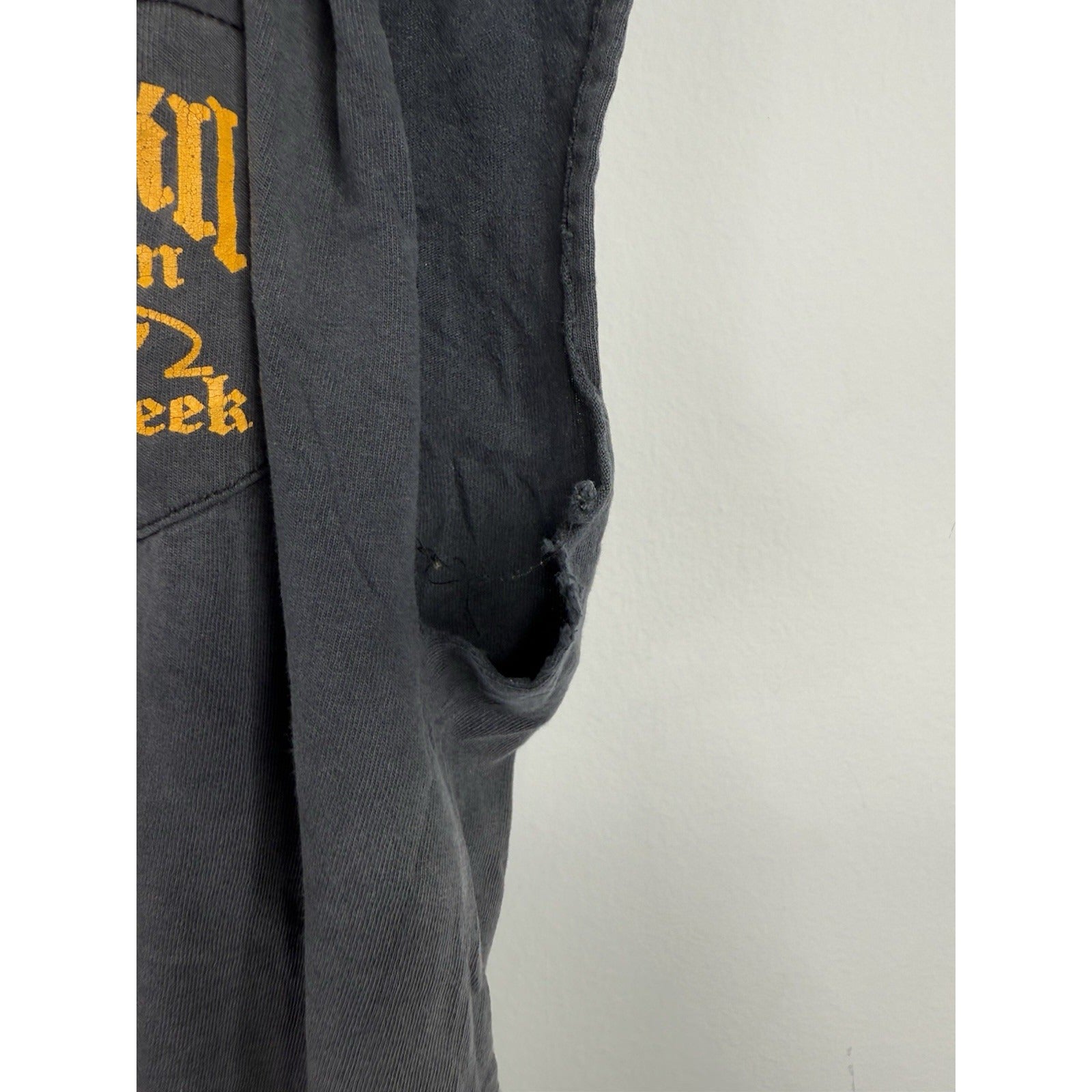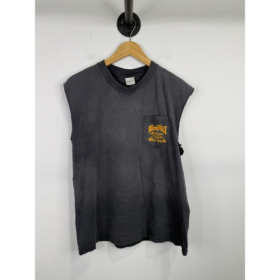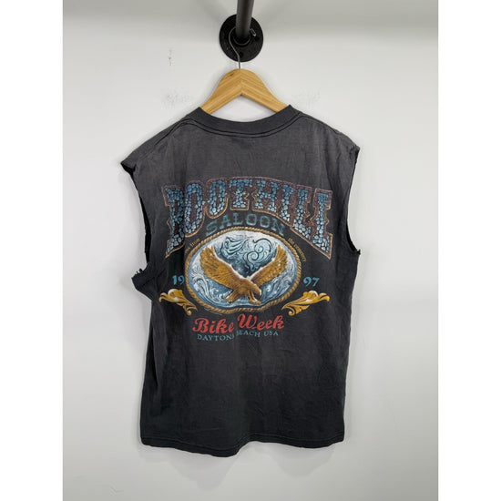 The Vintage 1997 Boothill Saloon T-shirt in size L is a sleeveless shirt featuring a biker and motorcycle theme inspired by the USA. Made by Murina in the United States, this black shirt is designed for men with a regular fit. Perfect for those looking for a unique and nostalgic addition to their wardrobe, this shirt captures the essence of a bygone era with its vintage design and iconic imagery.