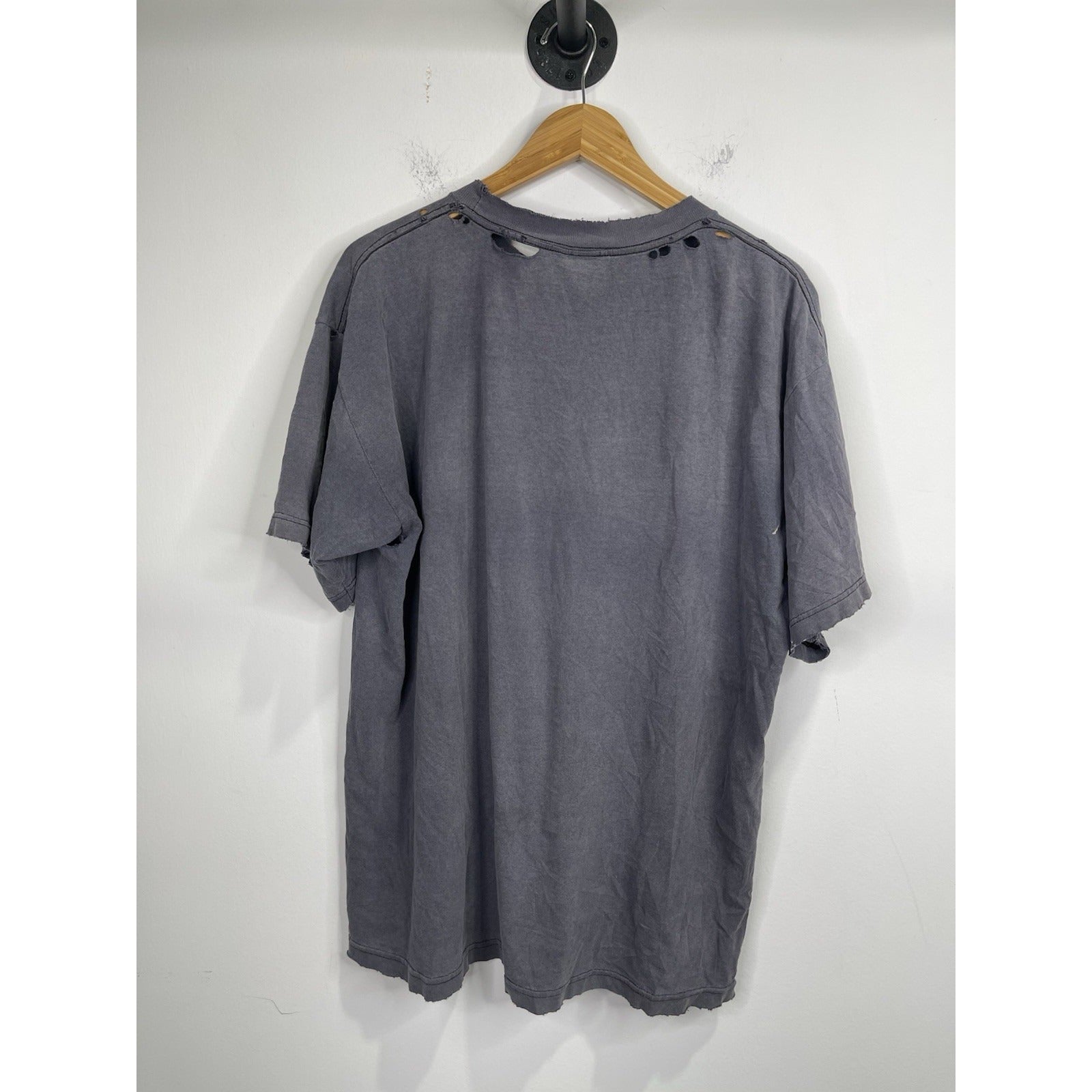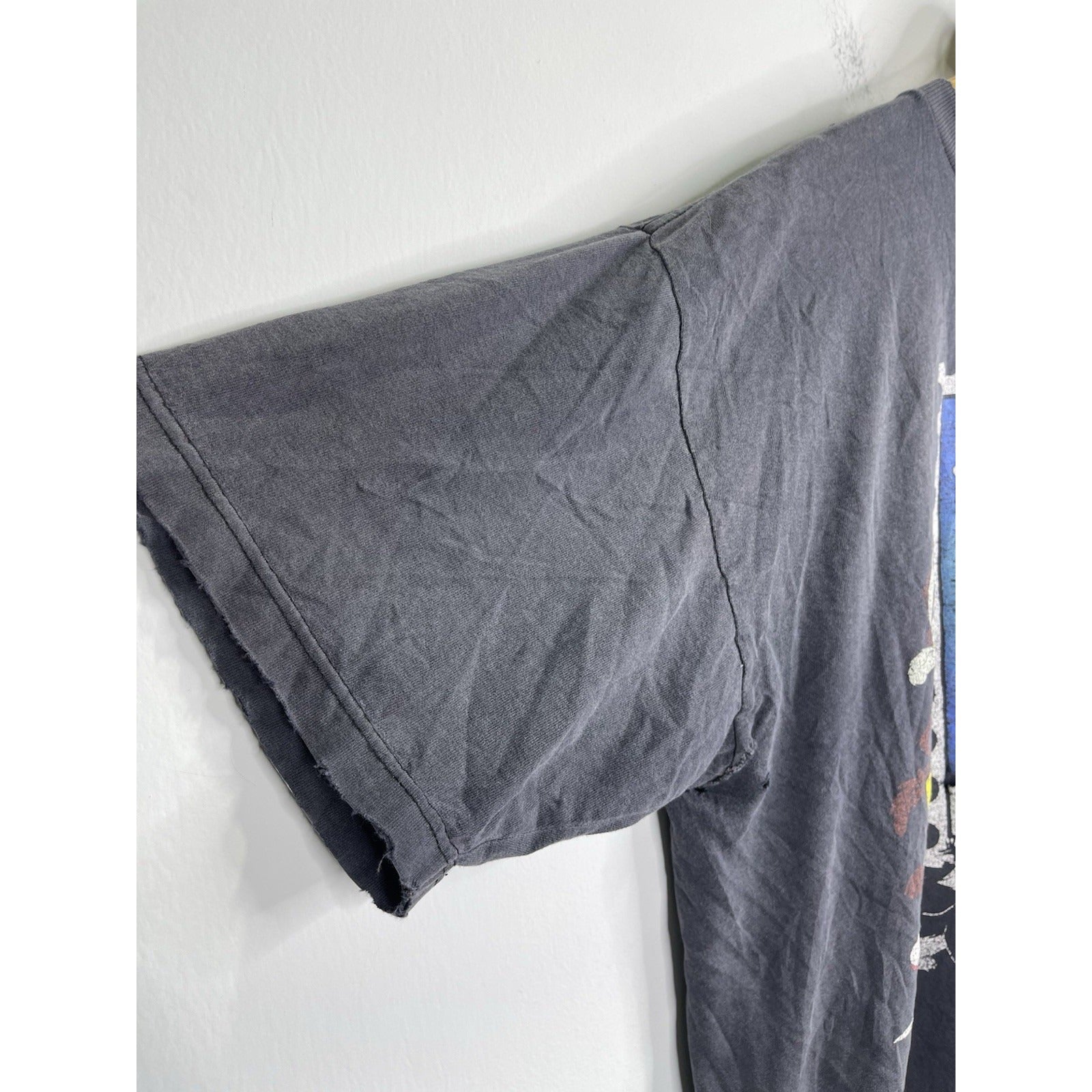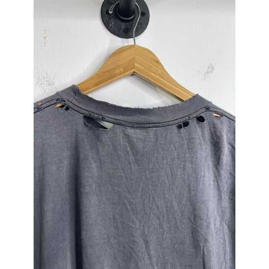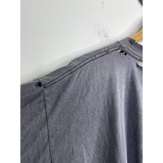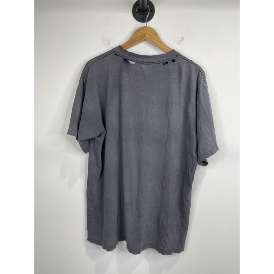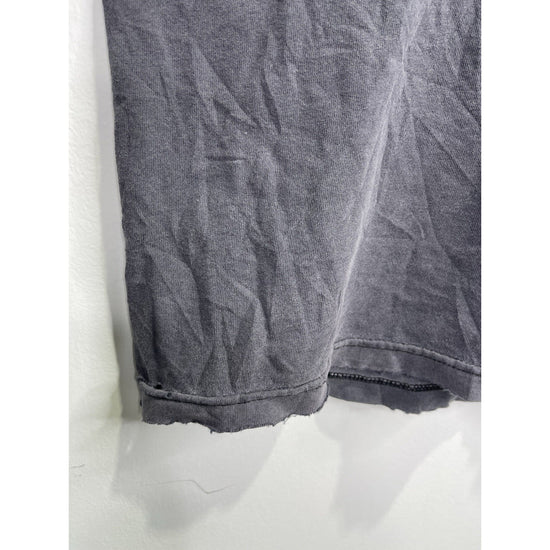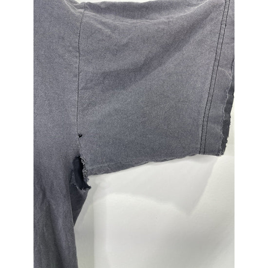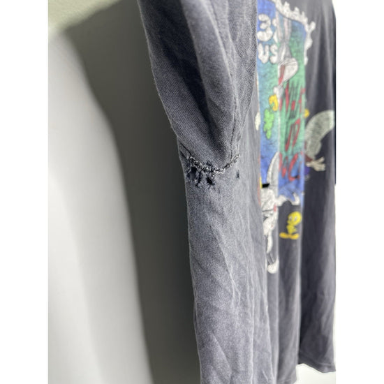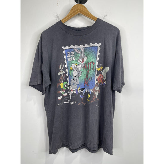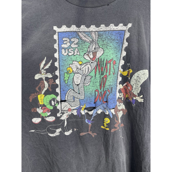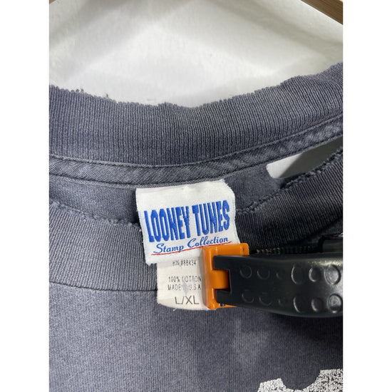 This Vintage 1997 Looney Tunes Stamp Collection Bugs Bunny Graphic T-Shirt in size L/XL is a classic piece for any cartoon fan. Made of comfortable cotton knit material, the black shirt features a solid pattern with a crew neck and short sleeves. The iconic Bugs Bunny logo adds a touch of nostalgia, perfect for those who appreciate 90s cartoons and Americana pop culture. With its regular fit and breathable design, this T-shirt is a timeless and stylish addition to any man's wardrobe.