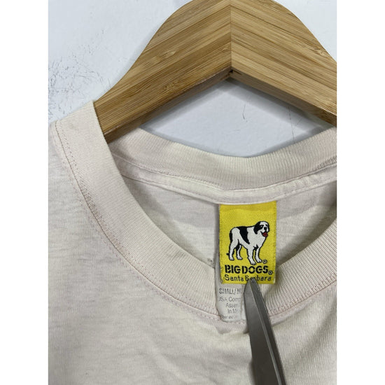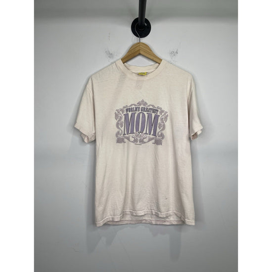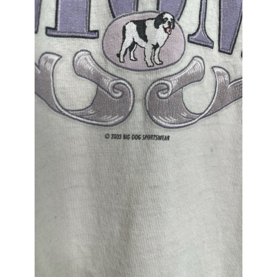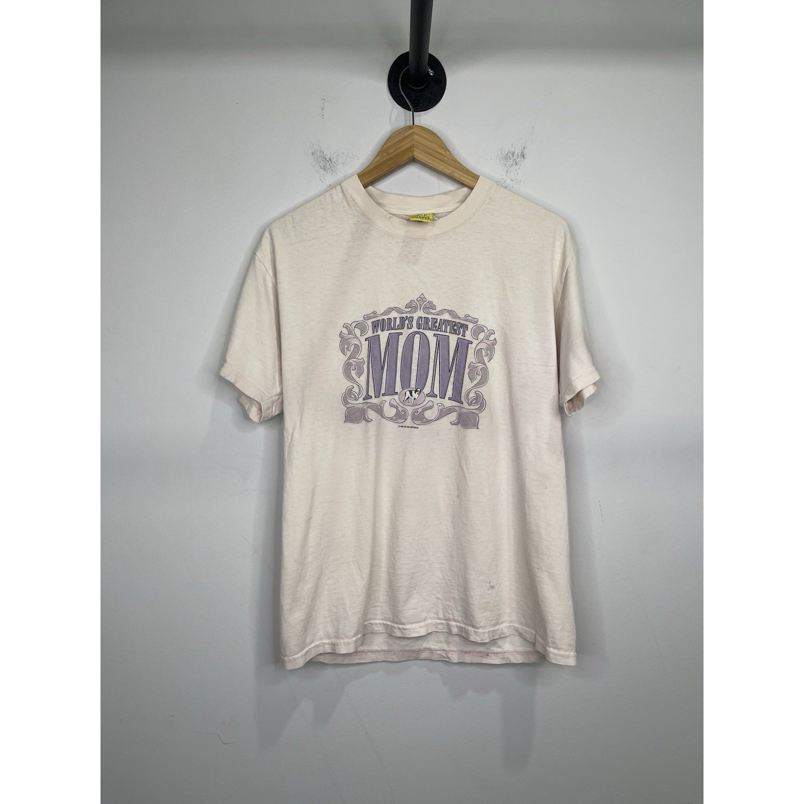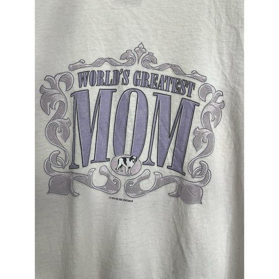 The product is a vintage 2003 Big Dogs "World's Greatest Mom" T-shirt in white, size small. This short sleeve shirt features a crew neckline and is made of cotton, making it a comfortable and stylish choice for everyday wear. The shirt commemorates Mother's Day and is themed around the Y2K era, adding a fun and nostalgic touch to the design. The brand, Big Dogs, adds a unique and playful element to this classic piece of clothing.