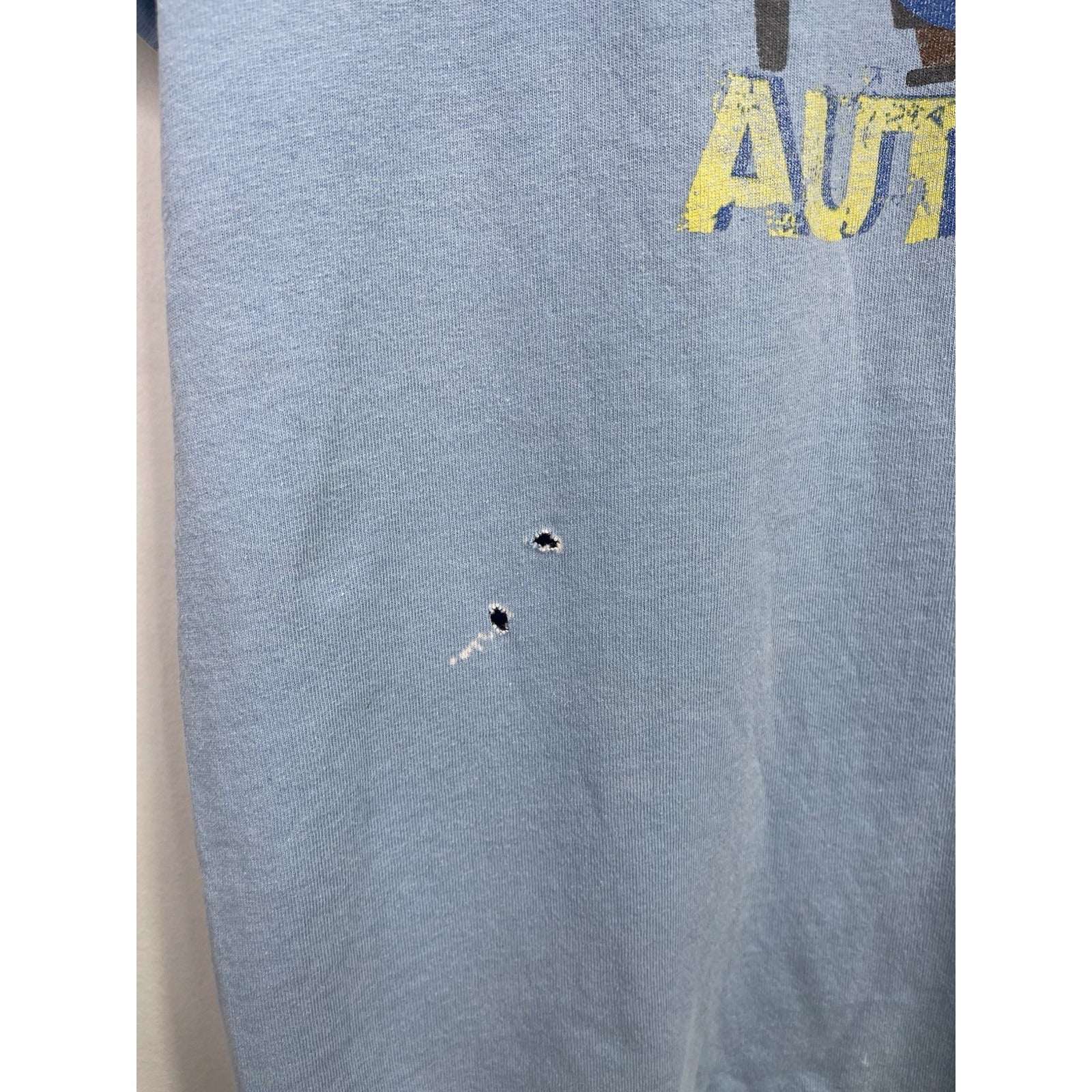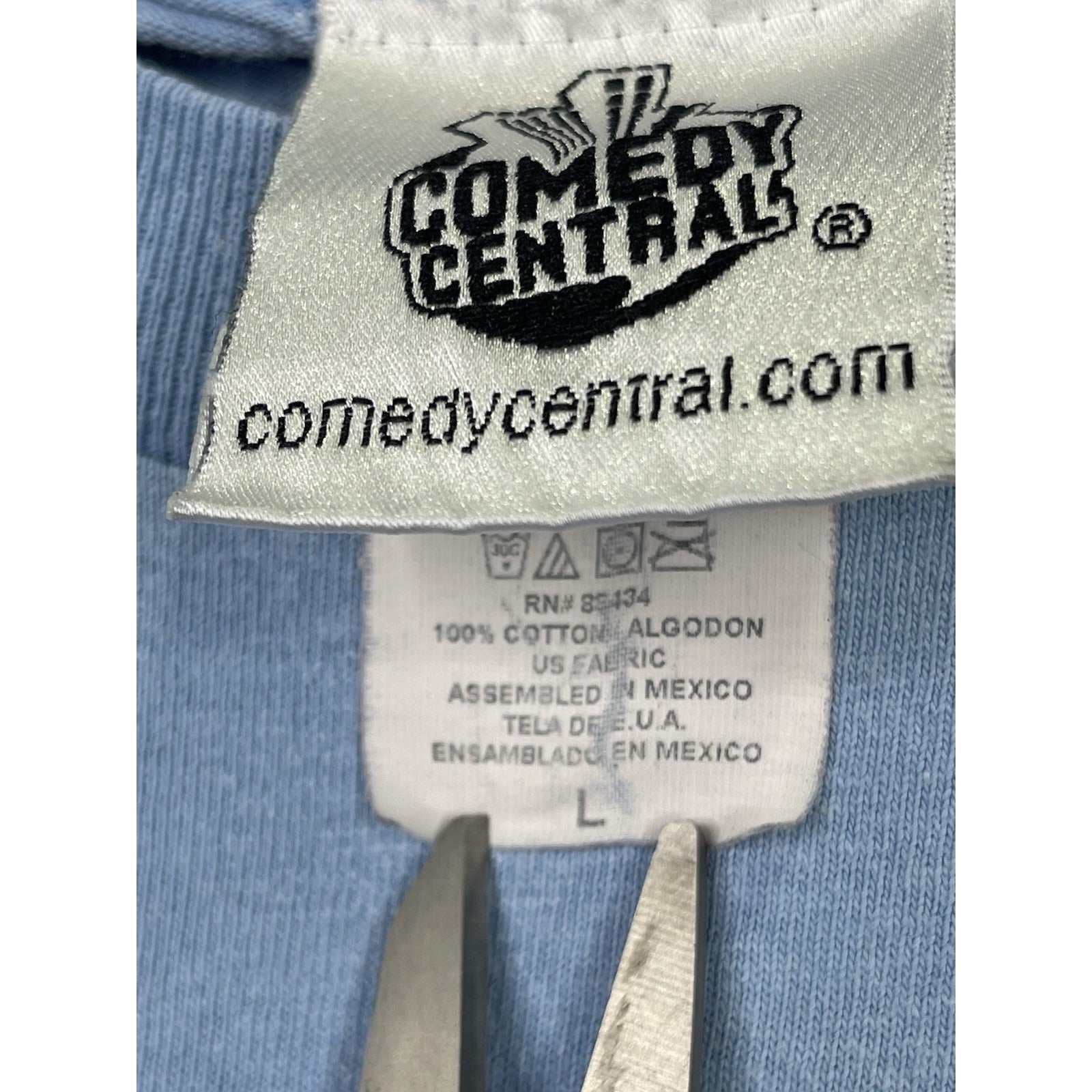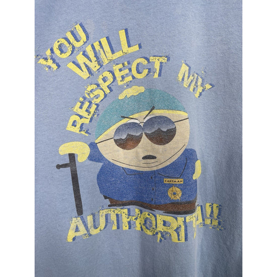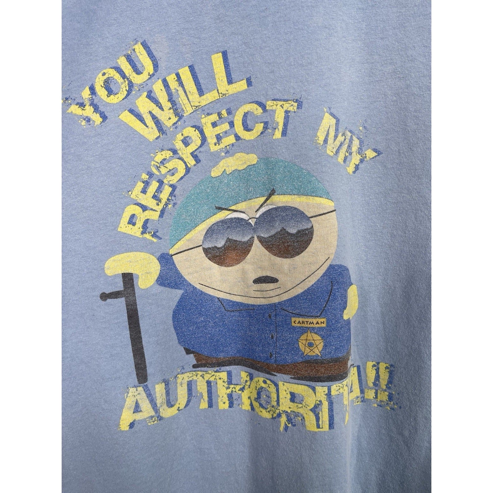 This Vintage 2005 Comedy Central South Park Cartman Respect My Authorita T-shirt is a solid blue tee-shirt featuring a graphic of Cartman from the popular animated TV show. Made of 100% cotton with a crew neck and short sleeves, this limited edition shirt is perfect for fans of South Park and vintage TV memorabilia. The shirt is designed to fit comfortably with a regular fit, making it suitable for all seasons and occasions where a funny and quirky statement piece is needed. With its unique design and branded accents, this T-shirt is a must-have for any South Park enthusiast.