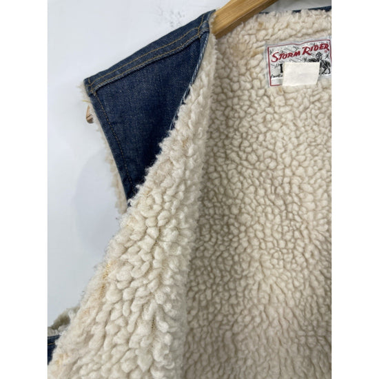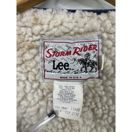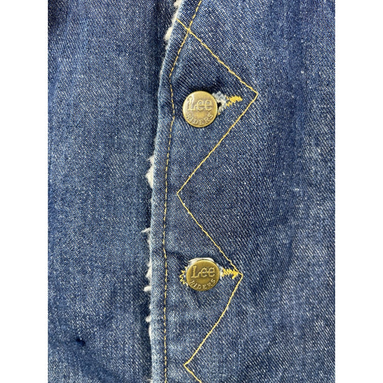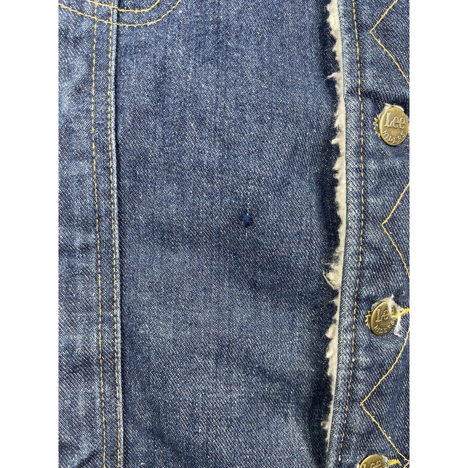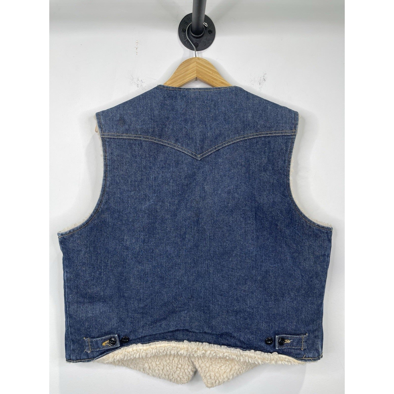 This vintage 70s Lee Storm Rider denim vest is a stylish and functional piece perfect for casual occasions. Made with cotton denim and lined with wool, this vest offers warmth and comfort. The dark wash and XL size make it a versatile option for men who enjoy walking or hiking. With its button closure and classic design, this Union-made vest is a timeless addition to any wardrobe.