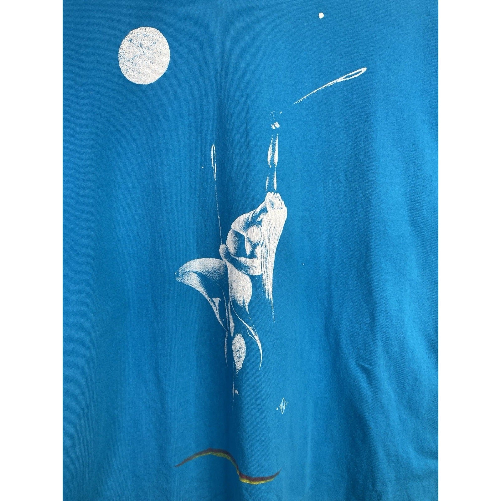 This vintage 80's Female Athlete Midair Blue T-Shirt in size X-Large is a unique and nostalgic piece that would be perfect for any collector or fan of retro fashion. Made from cotton and featuring the iconic Tiger brand, this original shirt from the United States captures the style and spirit of the 1980s. The midair design and vibrant blue color add a touch of whimsy and athleticism to this classic appeal.