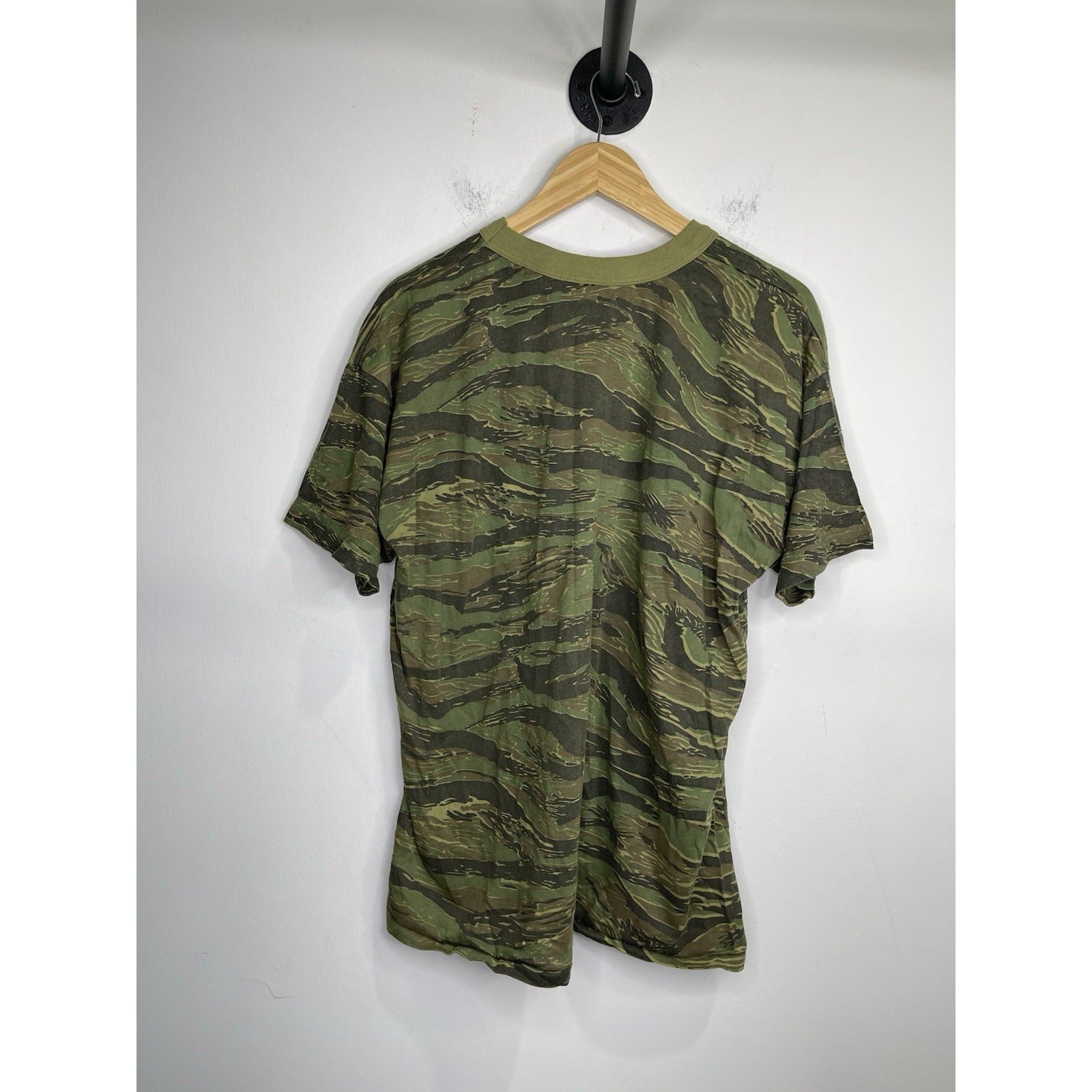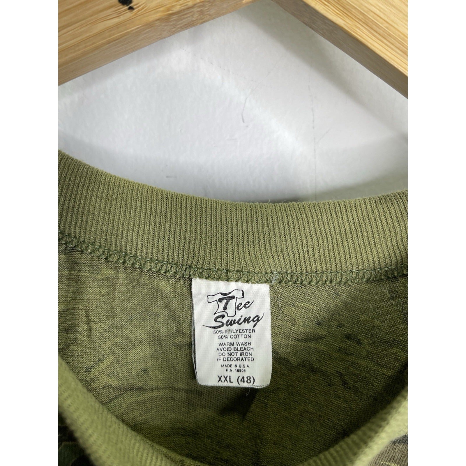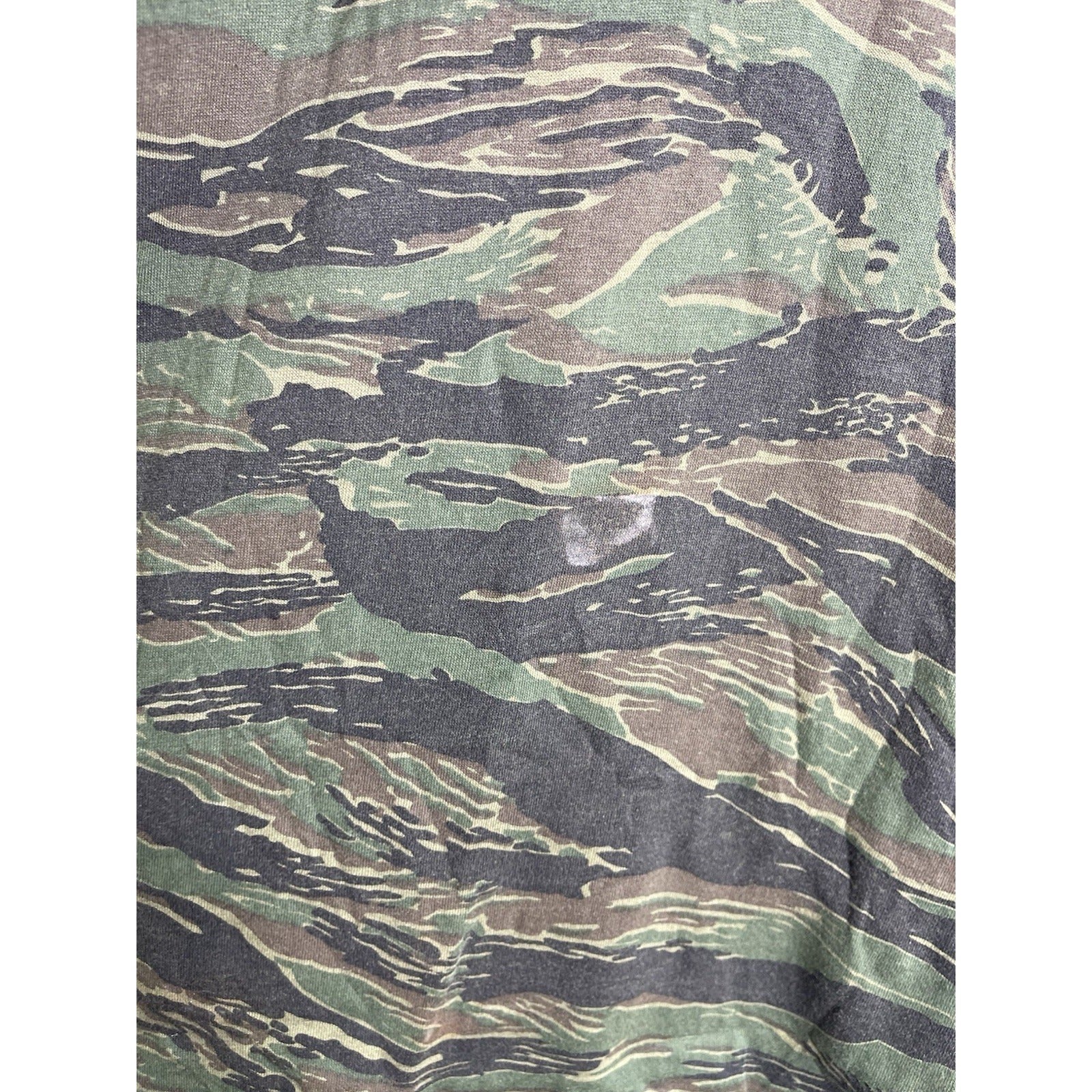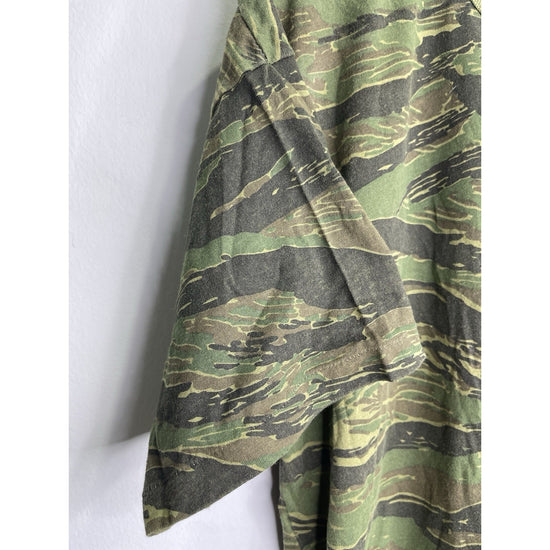 The product is a vintage 90s made in USA camo t-shirt in size 2XL. This regular fit t-shirt features a camouflage pattern in multicolor, making it a unique and stylish choice for men who appreciate retro fashion. The short sleeve design and 90s theme add to the nostalgic appeal of this classic piece, perfect for adding a touch of heritage to any casual outfit.
