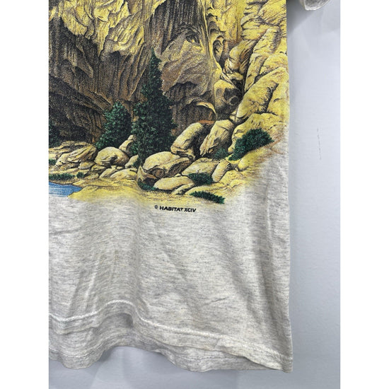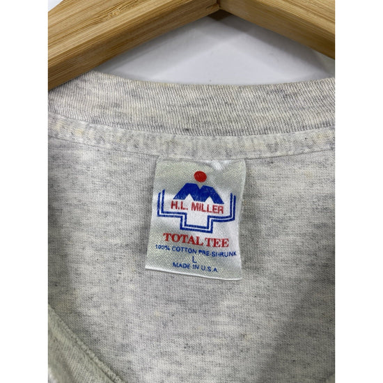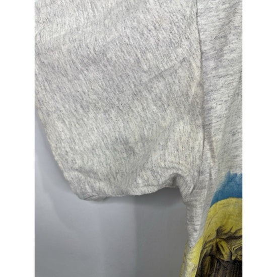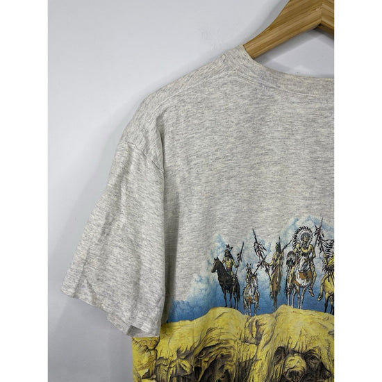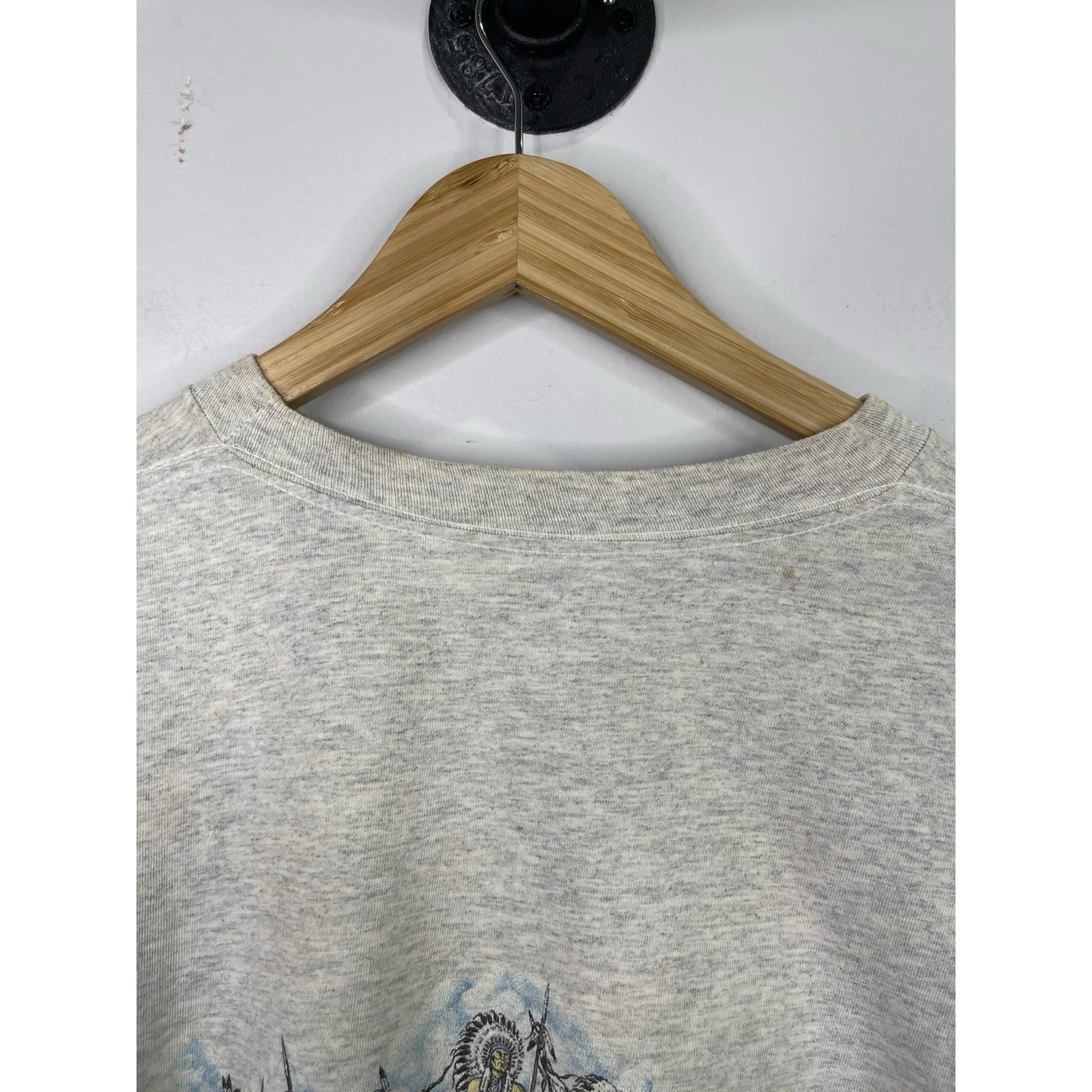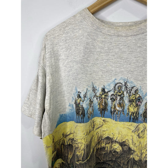 This Vintage 90s Men's Native American Grey T-shirt features a single stitch design and a size large. The t-shirt showcases a graphic tee style with a vintage theme, perfect for those who appreciate unique and retro clothing items. The grey color adds a versatile touch to the overall look, making it a stylish addition to any wardrobe.