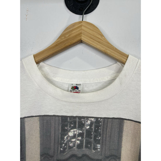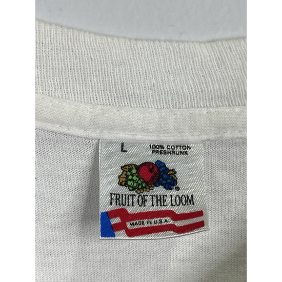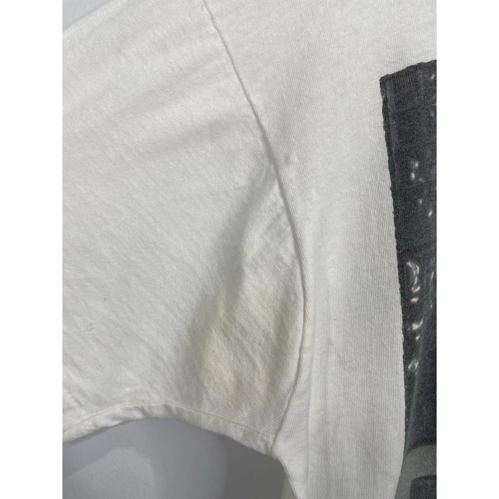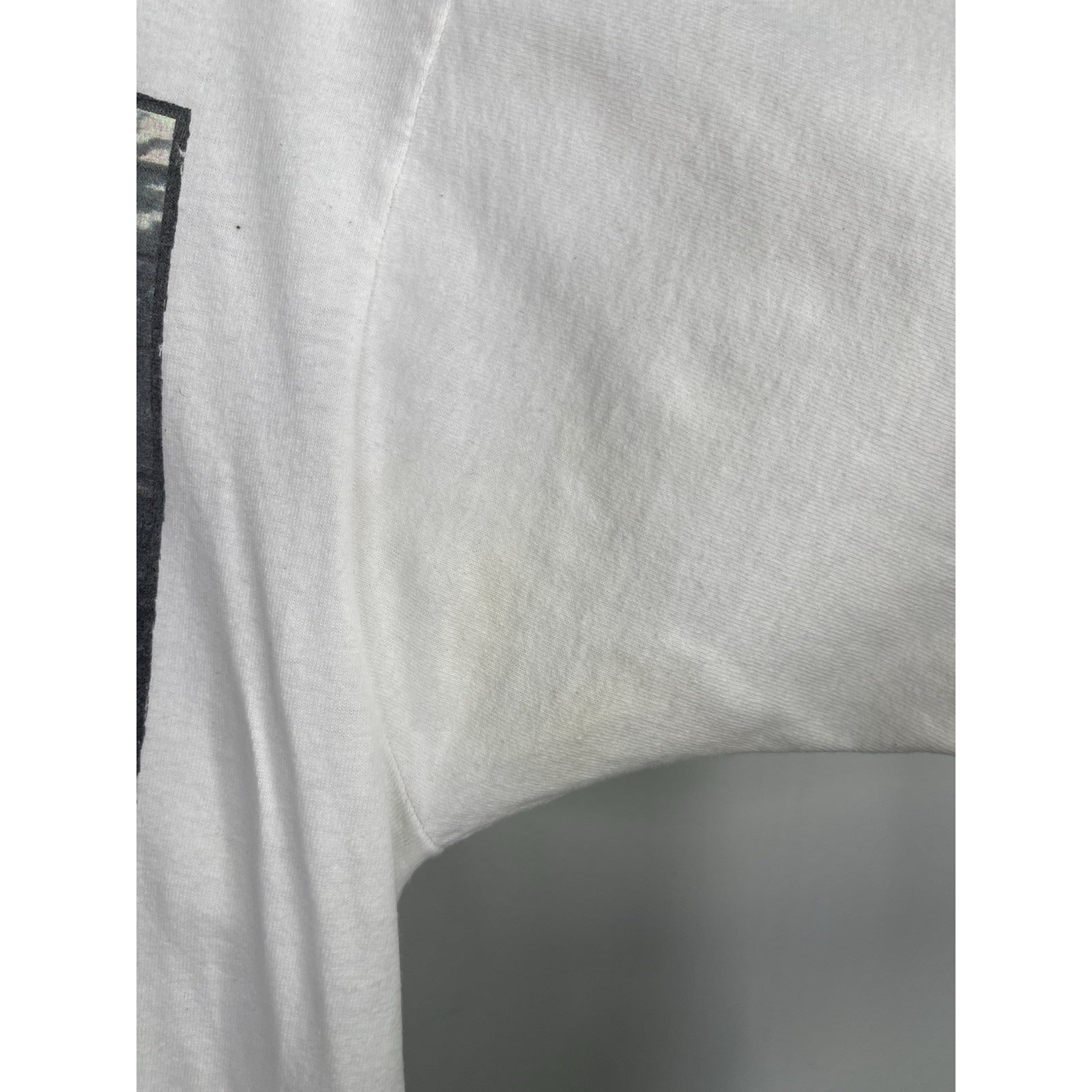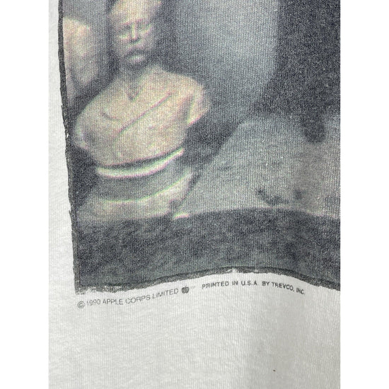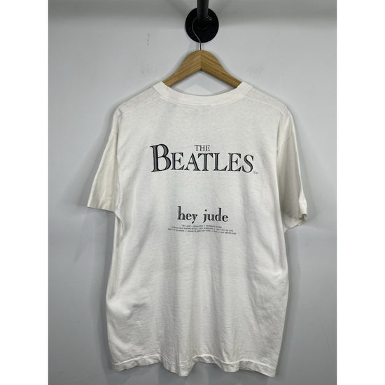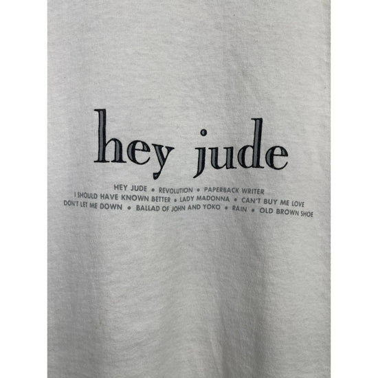The product is a vintage 90's THE BEATLES Hey Jude 1990 t-shirt in size large, made by Fruit of the Loom in the United States. This original t-shirt is made of white cotton and features a design from the iconic band The Beatles, making it a unique and nostalgic piece of men's vintage clothing. Perfect for fans of The Beatles or collectors of vintage concert t-shirts from the 1990s.