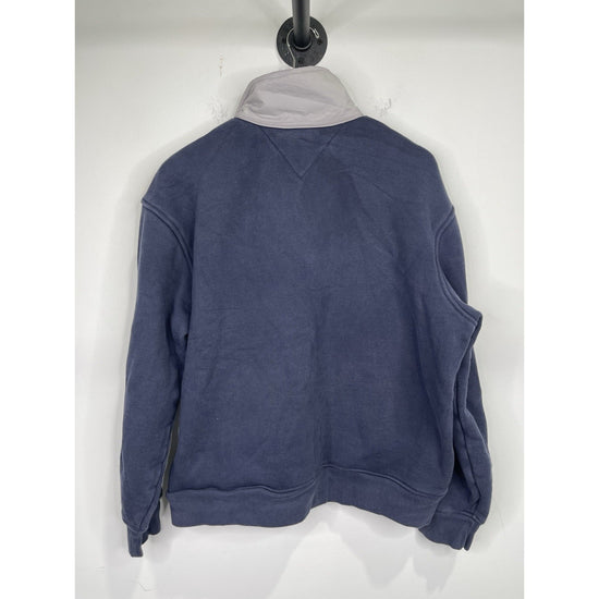 The Vintage 90's Tommy Hilfiger Authentic Sailing Gear USA/085 Half Zip Jacket in size L is a stylish and nostalgic piece perfect for men looking for a casual yet unique outerwear option. Made with nylon outer shell material and lined with cozy cotton fleece, this jacket features a patriotic flag pattern in blue and yellow, accented with the iconic Tommy Hilfiger logo. With a half zip closure, collared neckline, and elastic waist, this jacket combines retro style with practical features, making it a standout addition to any wardrobe.