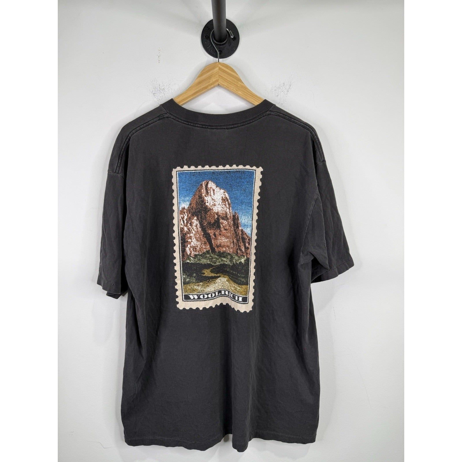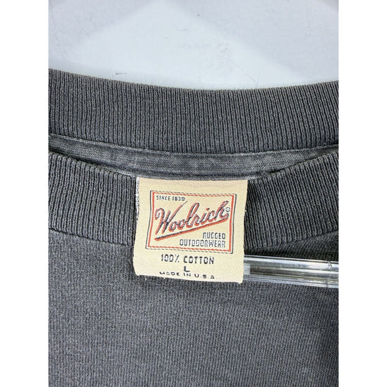 The Vintage 90s Woolrich T-shirt in size L is a classic piece with a graphic print design that captures the essence of 90s fashion. With a regular fit and short sleeves, this black t-shirt is perfect for men looking to add a touch of retro style to their wardrobe. Made by the renowned brand Woolrich, this vintage shirt is a timeless piece that can be styled in multiple ways to showcase its unique charm.