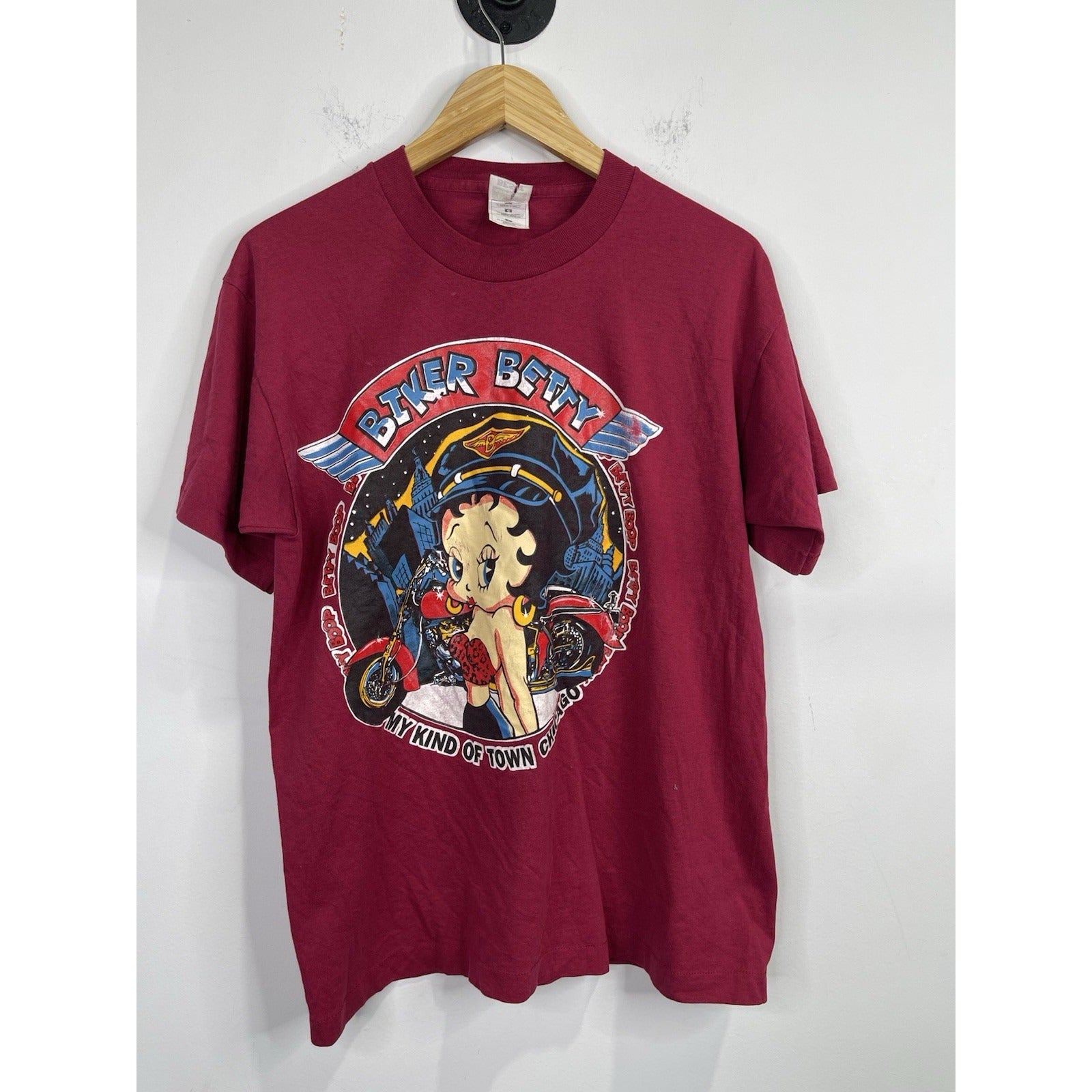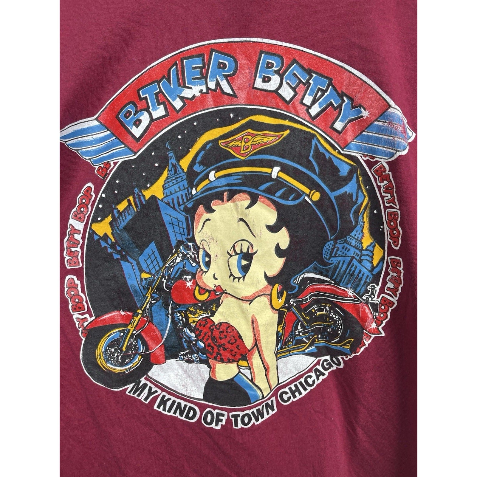 The Vintage Adults Biker Betty ‘My Kind Of Town Chicago’ Graphic Maroon T Shirt in size L is a graphic tee featuring the iconic character Betty Boop in a biker or motorcycle theme. Made of cotton fabric with a crew neck and short sleeves, this shirt is suitable for all seasons and is machine washable. The maroon color adds a vintage touch to the design, making it a unique and stylish addition to any wardrobe. Perfect for fans of retro 90s style, grunge, and hip hop culture.