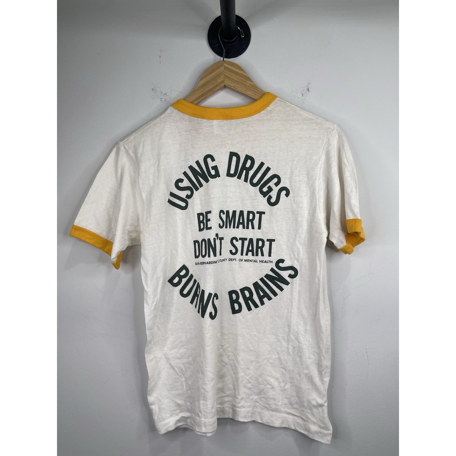 This Vintage Anti Drug Hanes T-shirt in size M features a classic graphic print design with a 90s theme, perfect for men looking to add a nostalgic touch to their wardrobe. Made of comfortable cotton material and featuring a crew neck and short sleeves, this regular fit t-shirt exudes a retro vibe that is both stylish and unique. The white color adds a clean and versatile look, making it a versatile piece for casual wear.