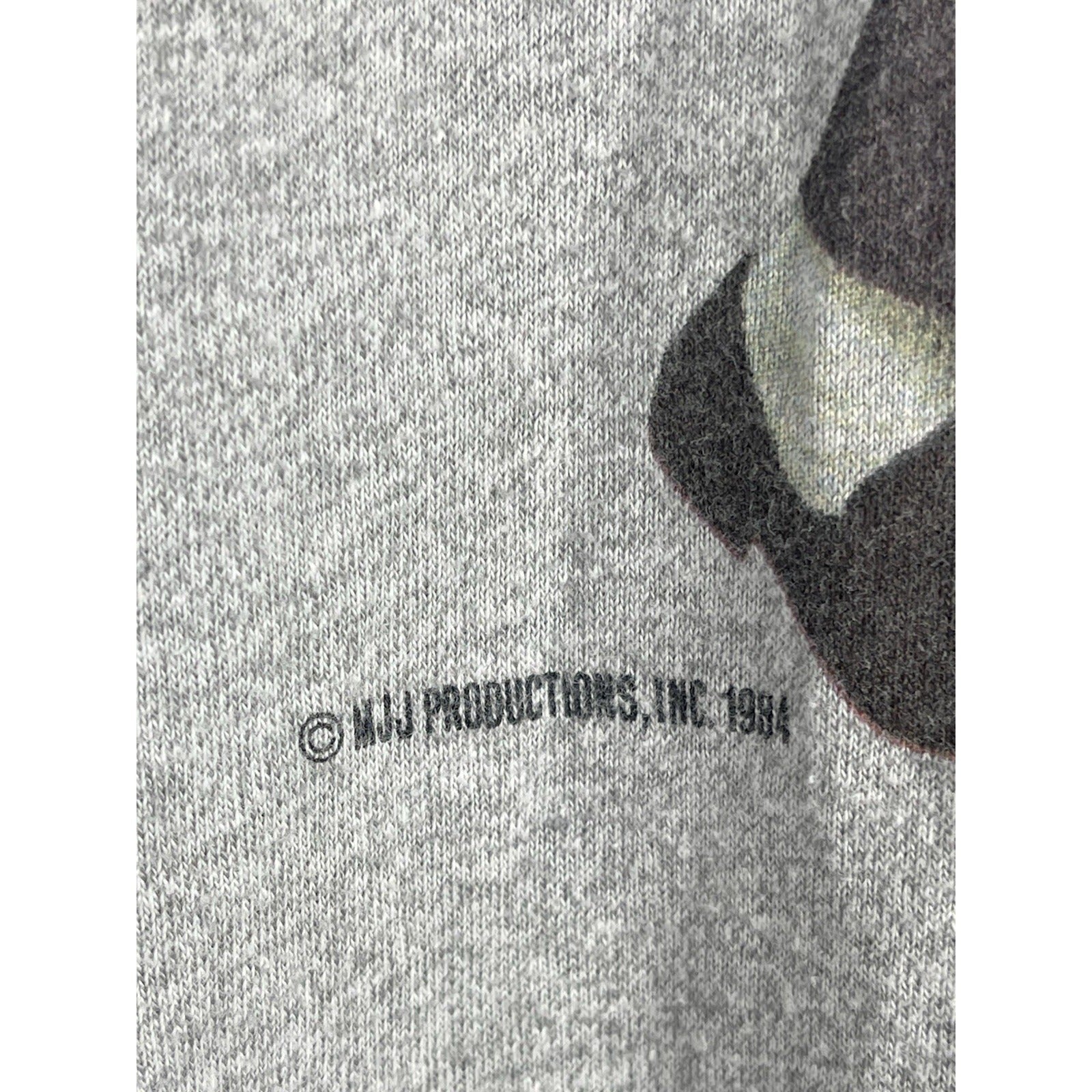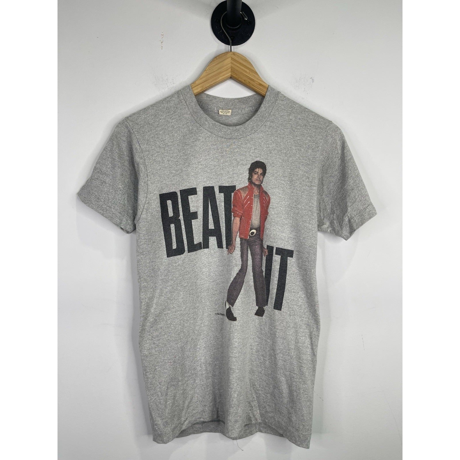 This vintage 1984 Michael Jackson "Beat It" t-shirt features a single stitch construction, adding to its authentic feel and appeal. Made in the United States, this small-sized shirt showcases the iconic music artist in a classic rock and pop genre design. Perfect for fans of Michael Jackson and music memorabilia collectors, this original piece offers a unique and nostalgic addition to any wardrobe.