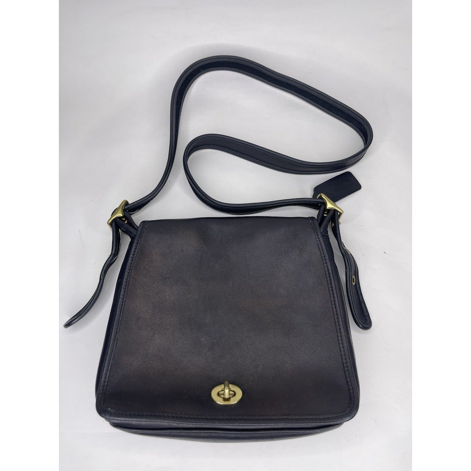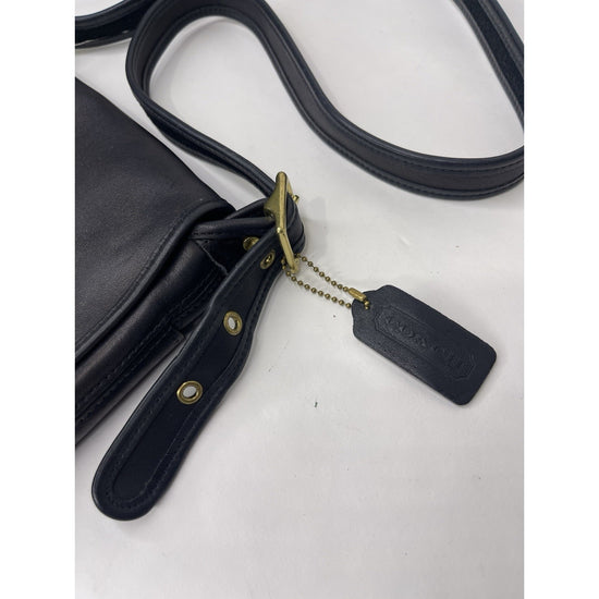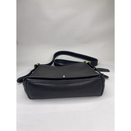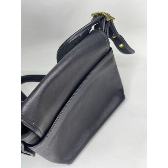 The Vintage Black Coach Legacy Companion Flap 9715 Leather Crossbody/Shoulder Bag is a medium-sized handbag made of black leather with gold hardware. It features a classic Coach Legacy design with a convenient crossbody style, perfect for everyday use. The black leather exterior and suede lining add a luxurious touch to this timeless piece that is ideal for any woman looking for a stylish and practical bag for her daily essentials.