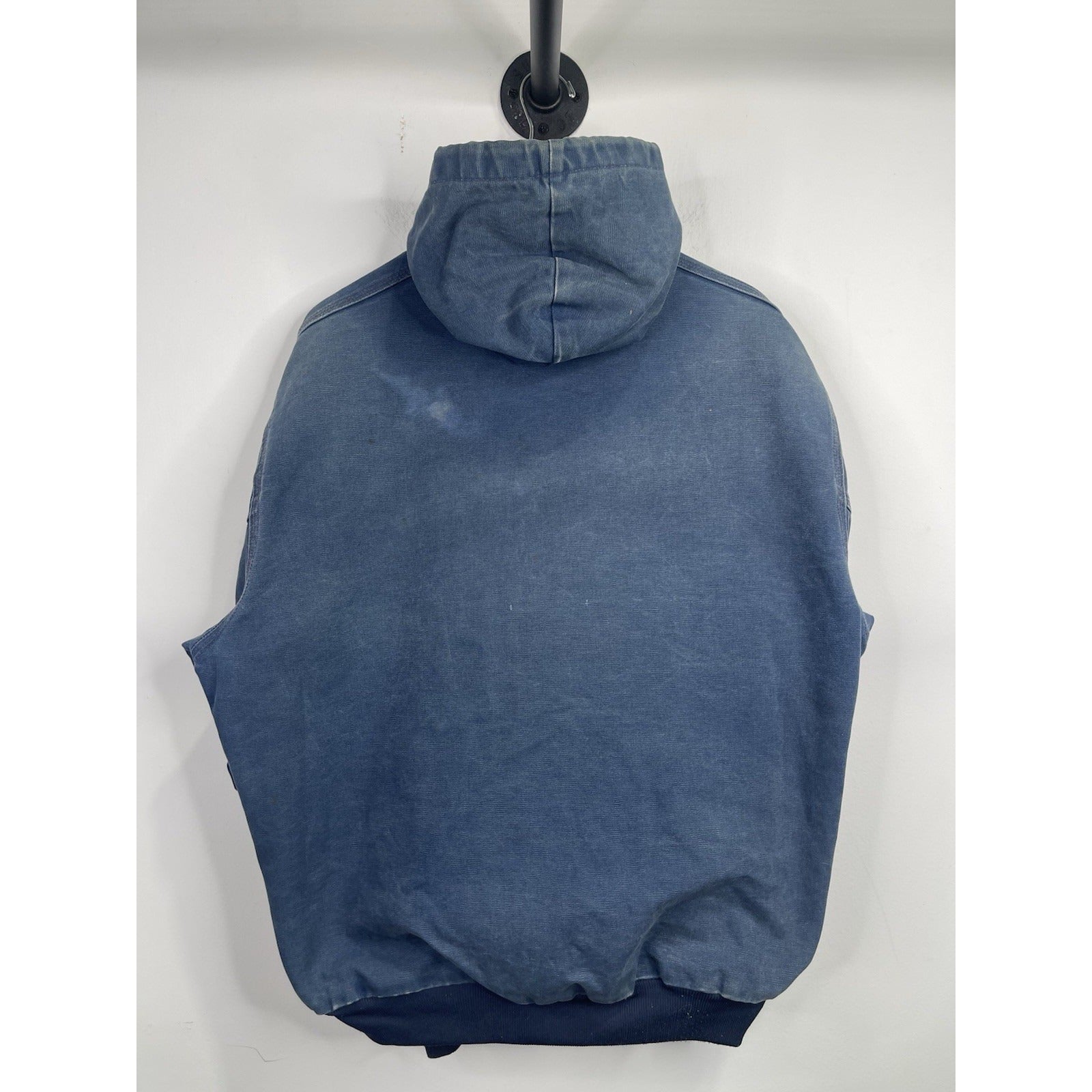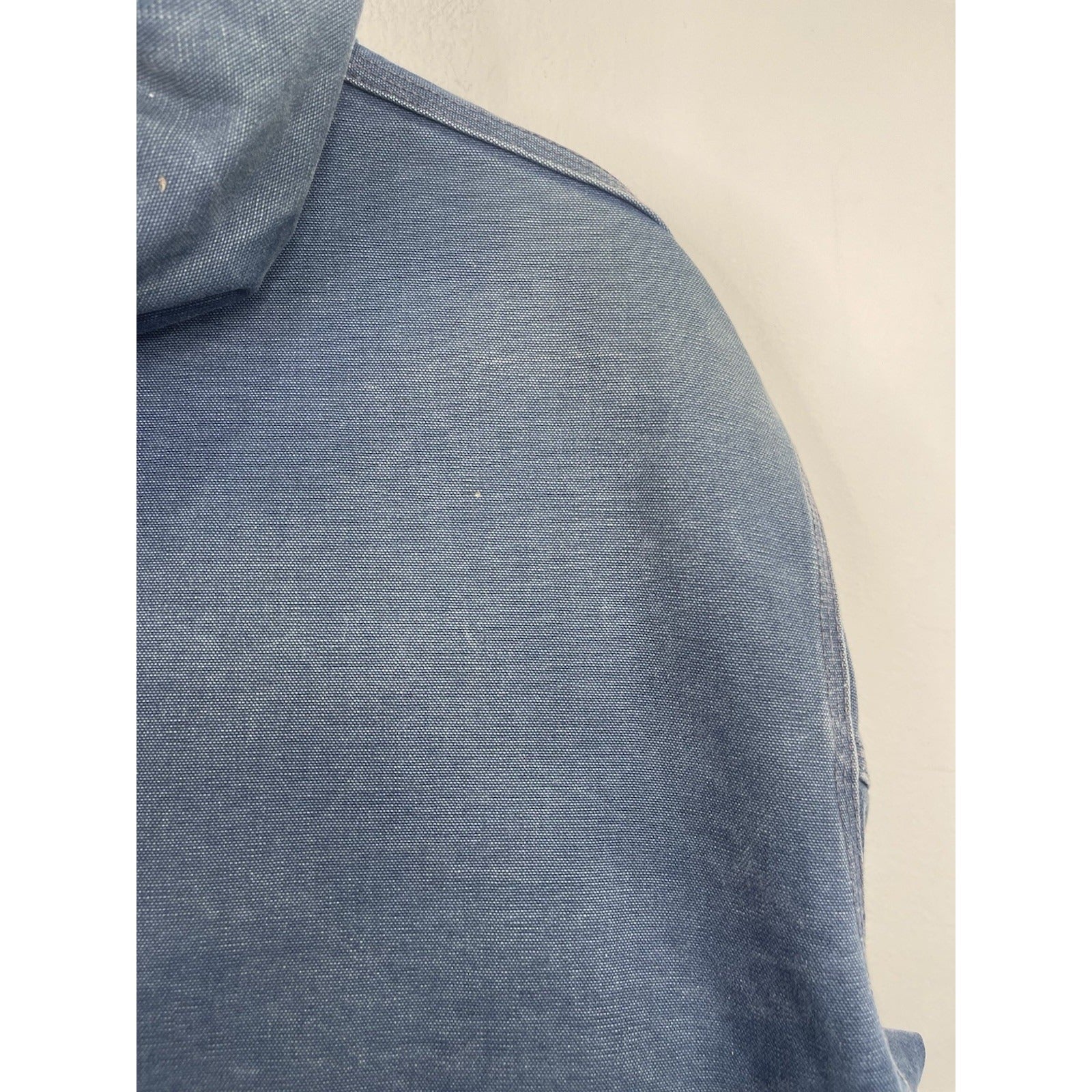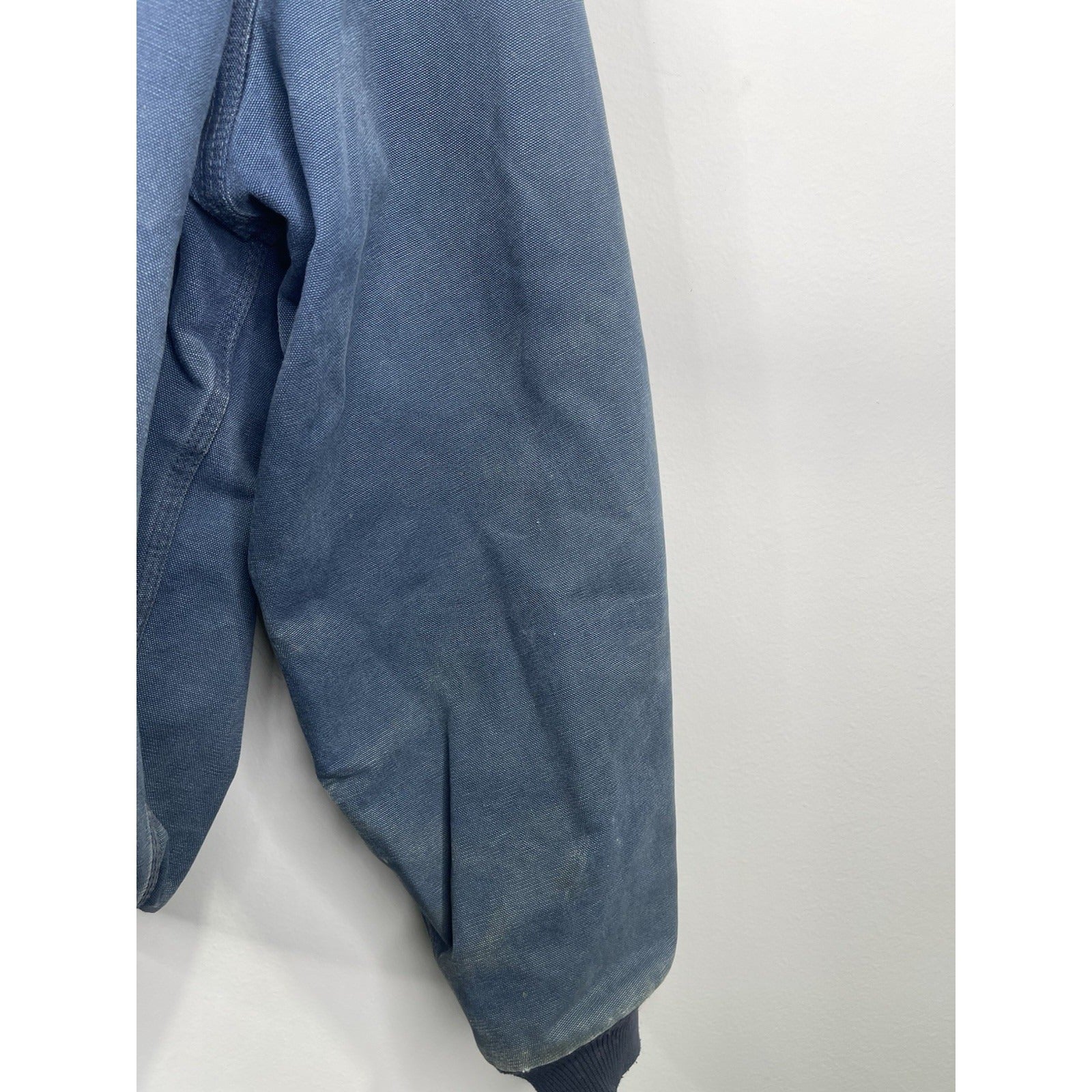 This Vintage Carhartt Blue Canvas Workwear Jacket is a classic bomber style jacket made of durable cotton canvas with a polyester lining and insulation, perfect for colder seasons. Featuring a full zip closure, hood, and pockets, this jacket is ideal for outdoor activities like riding, walking, hunting, or hiking. The vintage design with Carhartt logo accents and a solid blue color gives it a nostalgic 90's vibe that is perfect for casual or workwear occasions. Easy to care for with machine washable instructions, this jacket is a versatile and timeless addition to any wardrobe.
