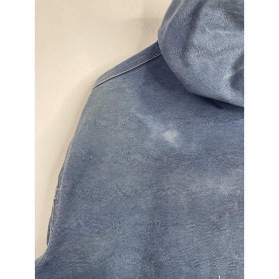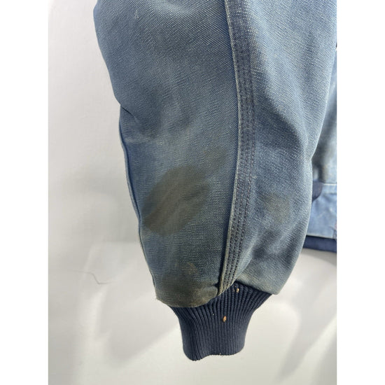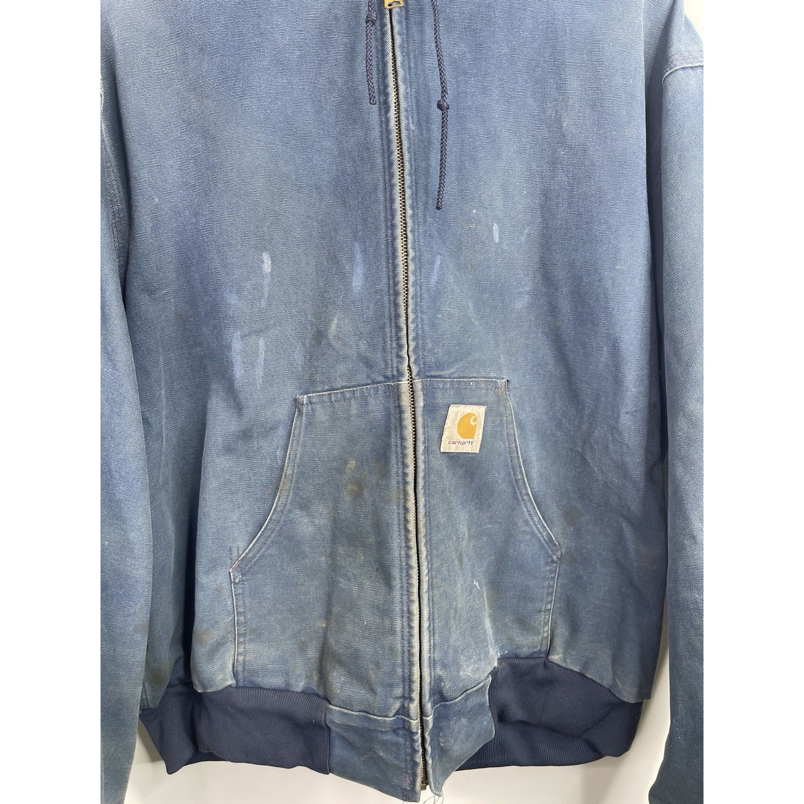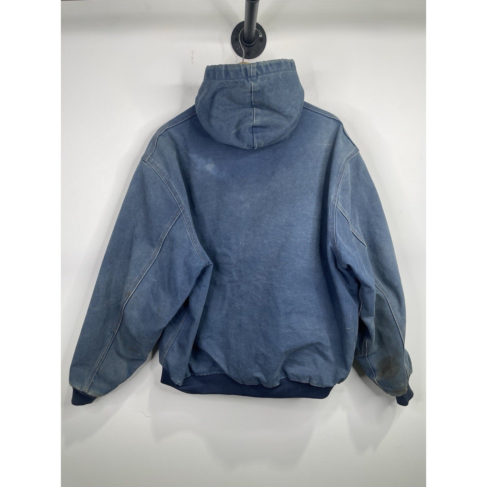 This Vintage Carhartt Blue Canvas Workwear Jacket is a classic bomber style jacket made of durable cotton canvas with a polyester lining and insulation, perfect for colder seasons. Featuring a full zip closure, hood, and pockets, this jacket is ideal for outdoor activities like riding, walking, hunting, or hiking. The vintage design with Carhartt logo accents and a solid blue color gives it a nostalgic 90's vibe that is perfect for casual or workwear occasions. Easy to care for with machine washable instructions, this jacket is a versatile and timeless addition to any wardrobe.