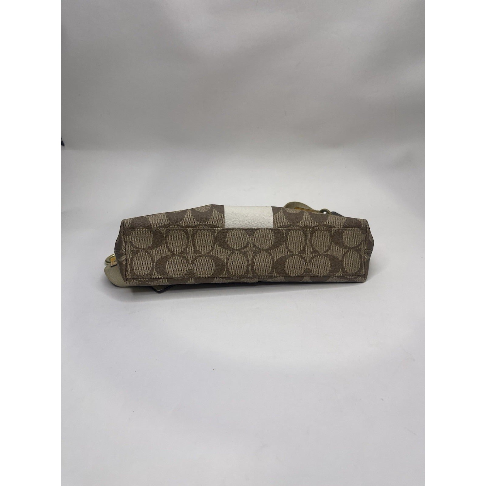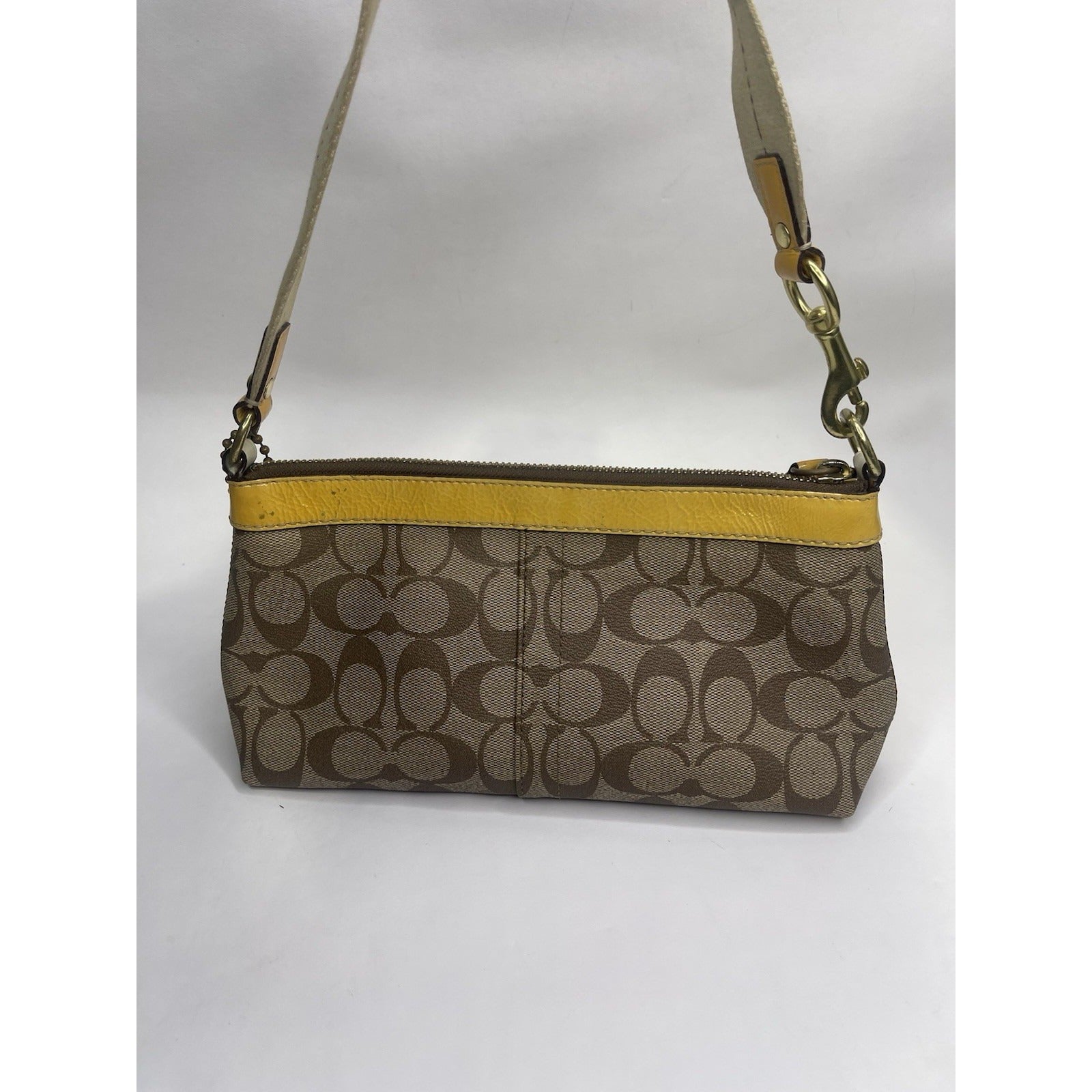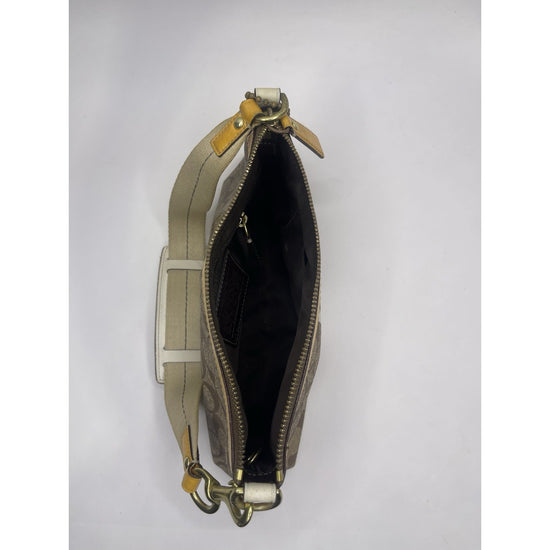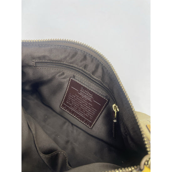 The Vintage Coach leather Heritage Stripe Signature handbag is a small rectangular shaped purse with a striped pattern in yellow, brown, and beige. Made of leather, PVC, and acrylic, this shoulder strap bag features a zip closure and brass hardware accents. The interior is lined with polyester and linen and includes inner pockets for organization. This Coach Heritage style handbag also comes with a keychain accessory, making it a stylish and practical choice for women looking to add a touch of vintage charm to their outfit
