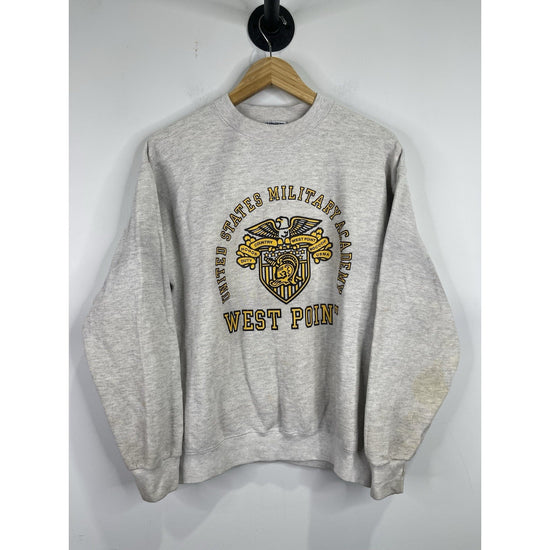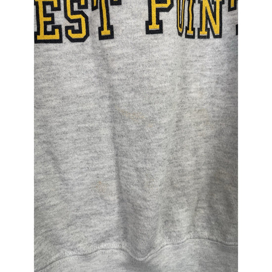 This Vintage Gray United States Military Academy USMA West Point Sweatshirt in size M is a classic pullover designed for men. Made from cotton fabric with a crew neck and drawstring closure, it features embroidered accents, a graphic print, and a logo. The sweatshirt showcases a patriotic theme with the USMA character and is suitable for all seasons, making it a versatile and stylish addition to any wardrobe. Machine washable and made in the United States, it is perfect for those who appreciate military history and a retro 80s/90s style.