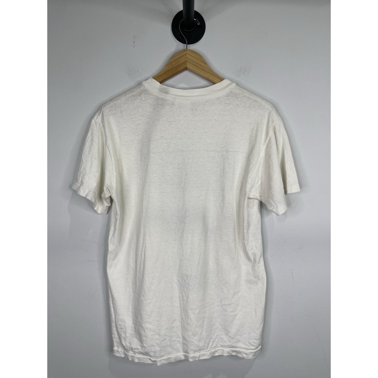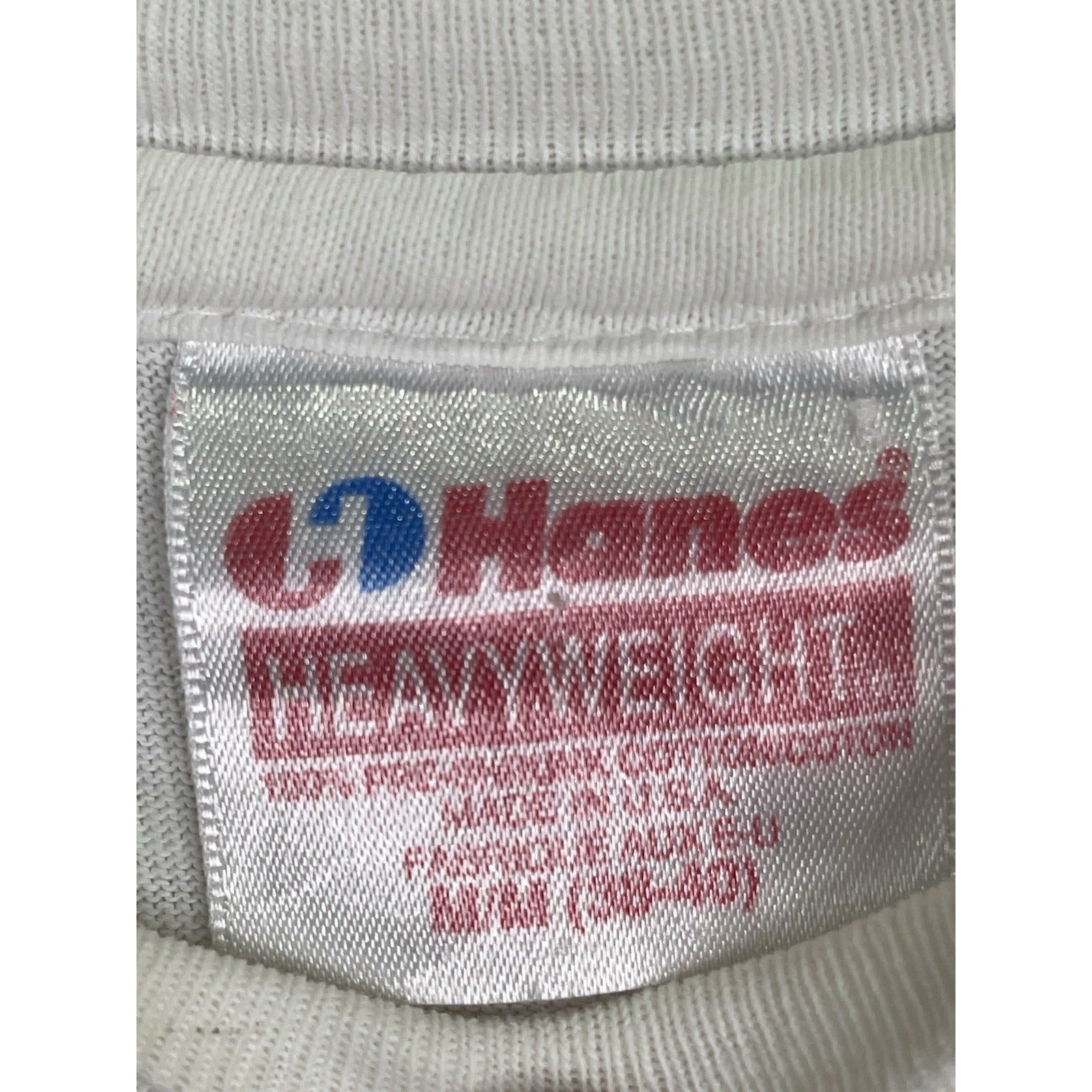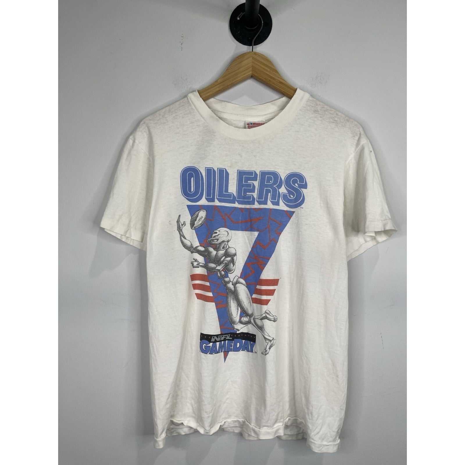 The Vintage Hanes NFL Houston Oilers Football T-Shirt in White is a classic piece of fan apparel for supporters of the Houston Oilers. Made from 100% cotton with a single stitch finish, this Men's M shirt is perfect for game day screenings. Proudly manufactured in the United States, this officially licensed product displays the team's logo and is ideal for showing your team spirit while staying comfortable and stylish.