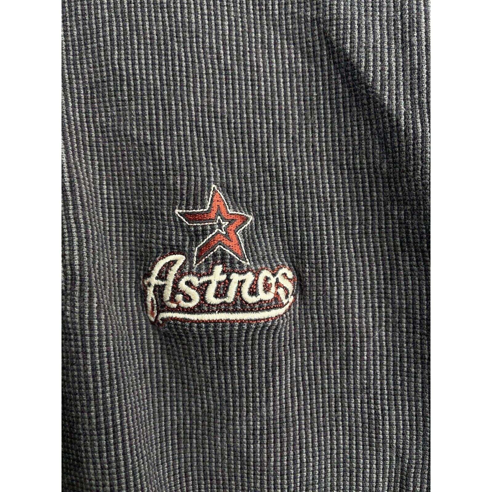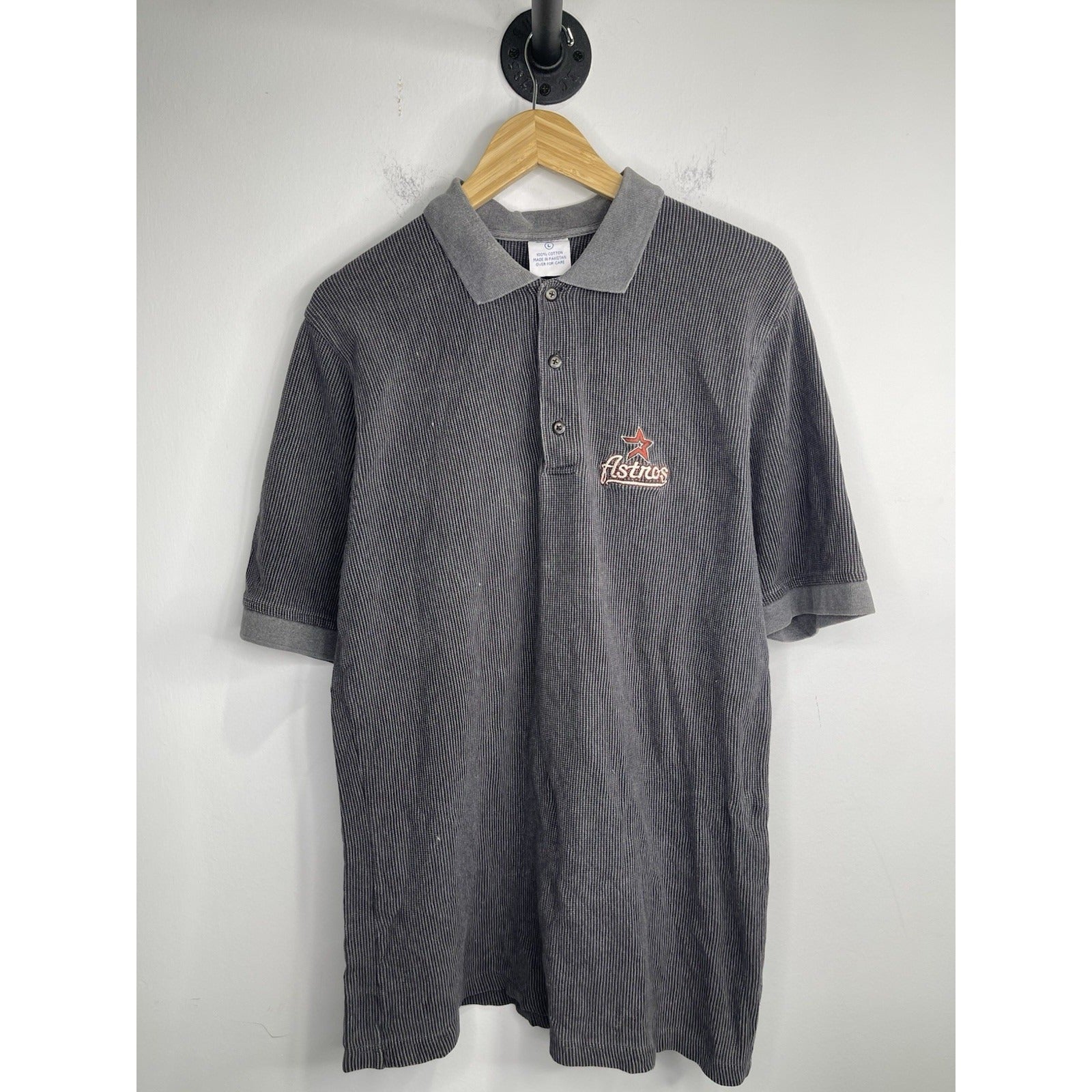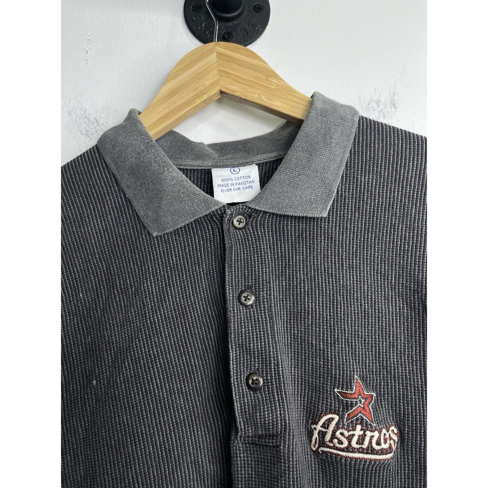 The vintage Houston Astros CSA size large gray 3 button polo collared shirt is a classic piece of fan apparel for Major League Baseball enthusiasts. The shirt features the Houston Astros team logo and colors, making it a perfect addition to any fan's collection. The CSA brand adds a unique touch to this shirt, making it a standout piece for fans of the team. This shirt is a great way to show support for the Astros while staying stylish and comfortable.
