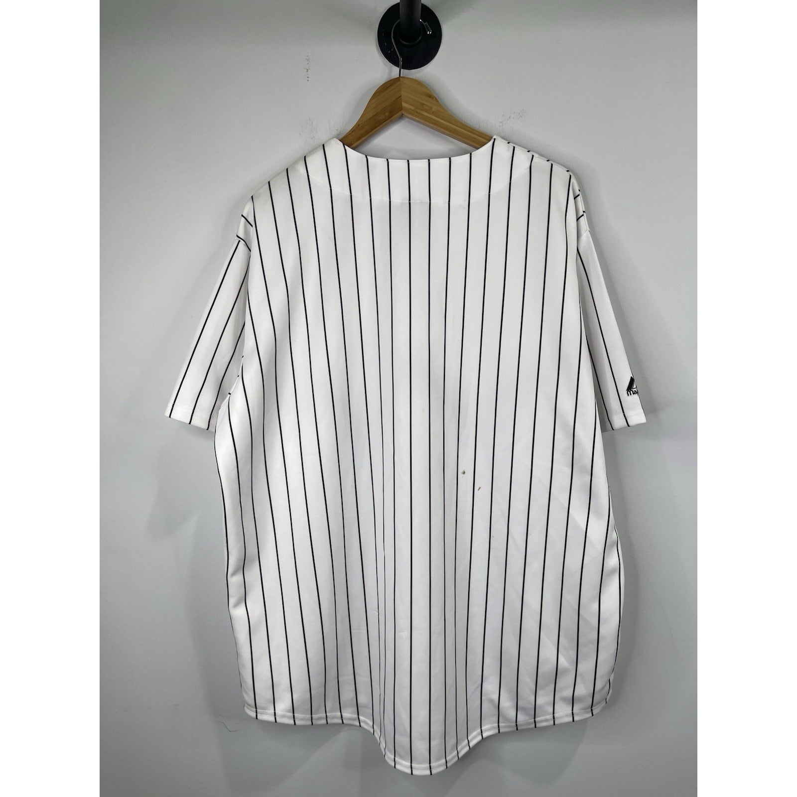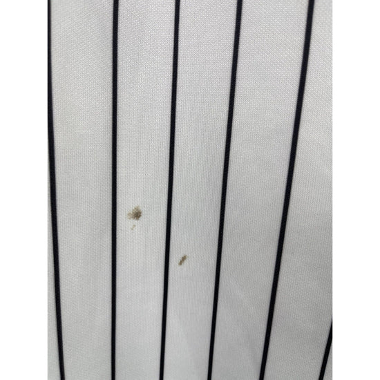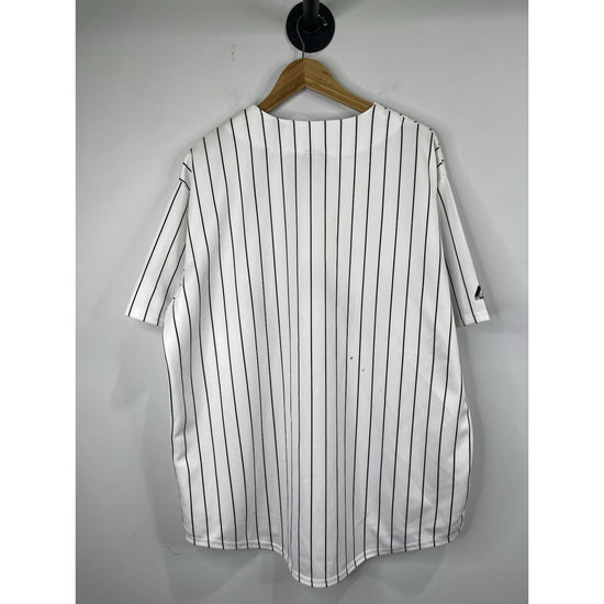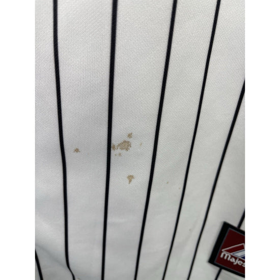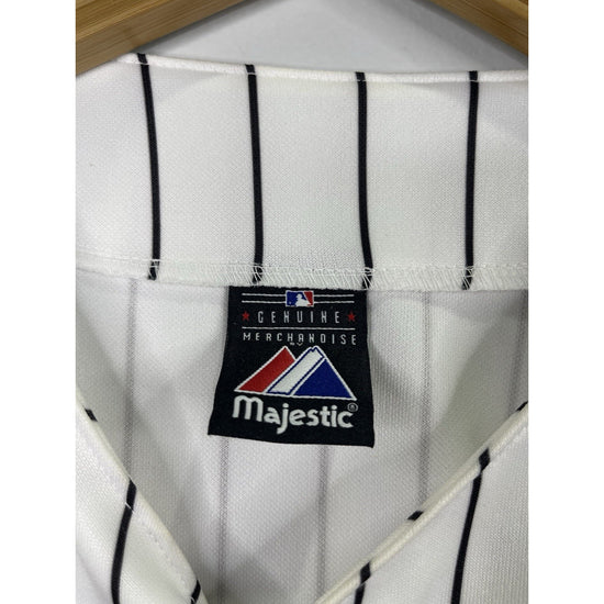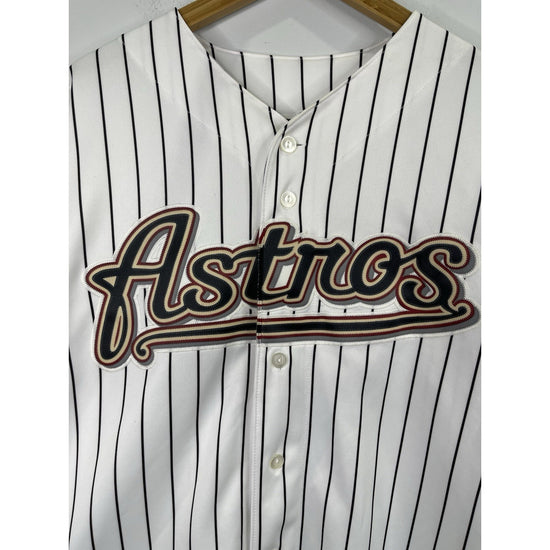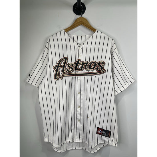 The product is a vintage Majestic Houston Astros baseball pinstripe jersey in size 2XL for men. It is officially licensed by Major League Baseball and features the team's logo and colors. This jersey is a must-have for any Astros fan looking to show their support in style.