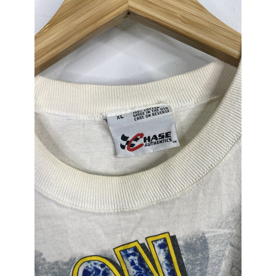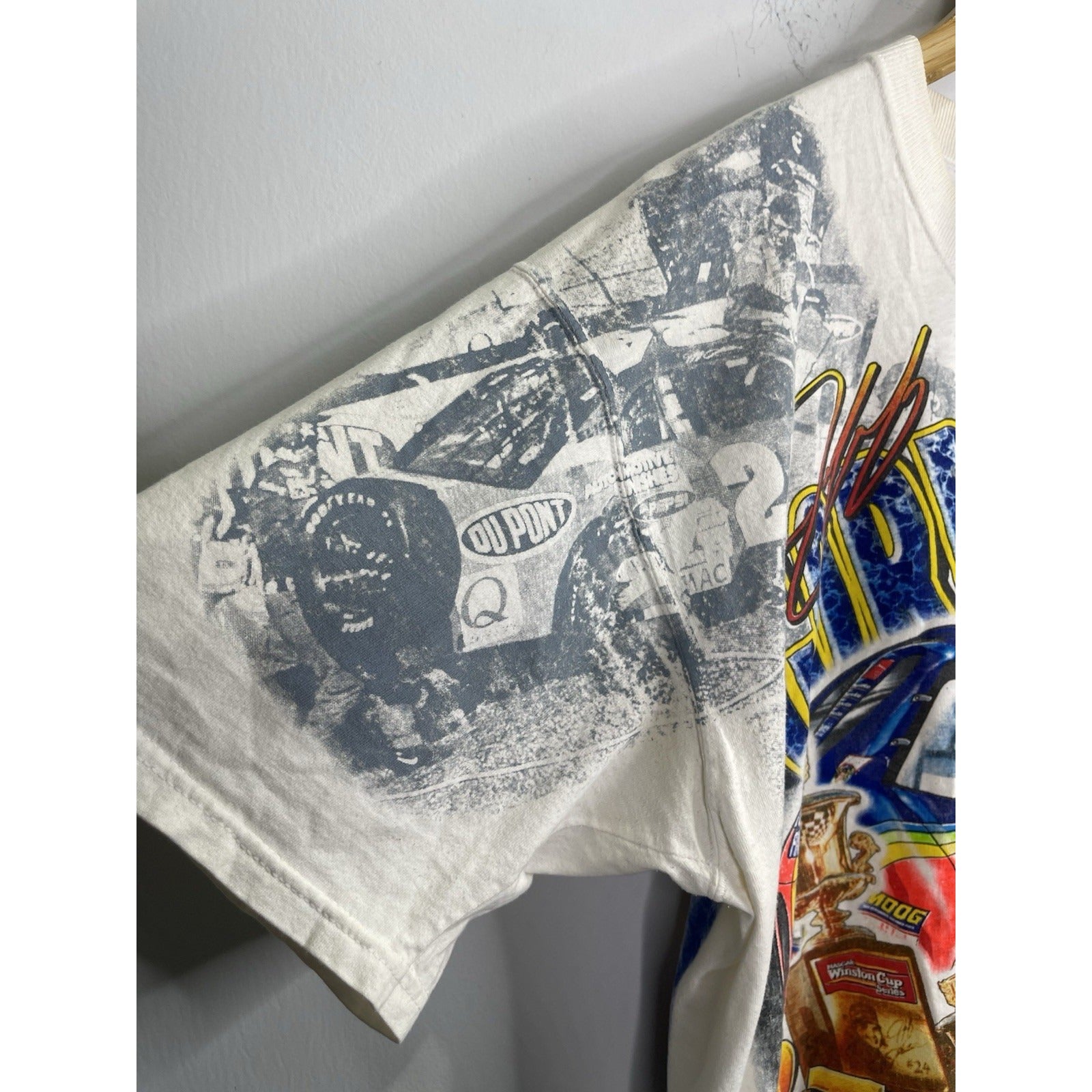 The product is a vintage Jeff Gordon all over print 1998 T-shirt in men's XL, officially licensed by NASCAR. Made by Chase Authentics, this white shirt features the iconic Jeff Gordon driver in a classic design perfect for fans of auto racing and the legendary driver. Perfect for any Jeff Gordon or NASCAR enthusiast looking to showcase their love for the sport in style.