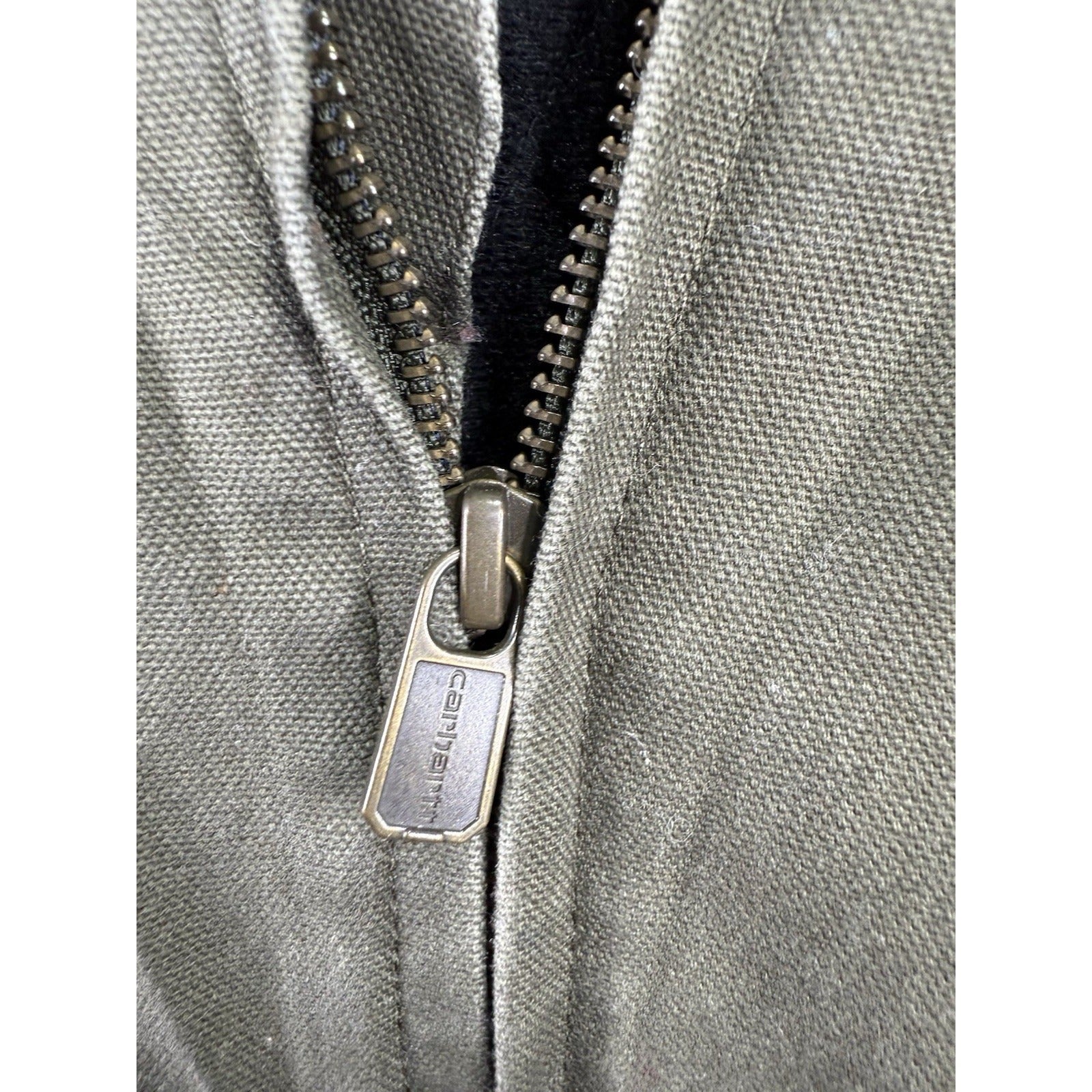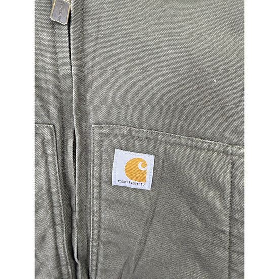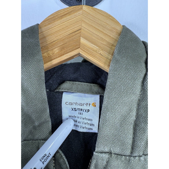 The Vintage Kids Olive Green Carhartt Jacket in size XS (6) is a stylish and practical outerwear option for boys. Made from 100% cotton canvas with a cozy 100% polyester lining, this jacket is perfect for the colder seasons of winter and fall. Featuring a hood and full zip closure, this basic jacket from Carhartt is not only functional but also a charming addition to any young boy's wardrobe. With its vintage appeal and quality construction, this jacket combines both timeless style and durability for a versatile outerwear piece.