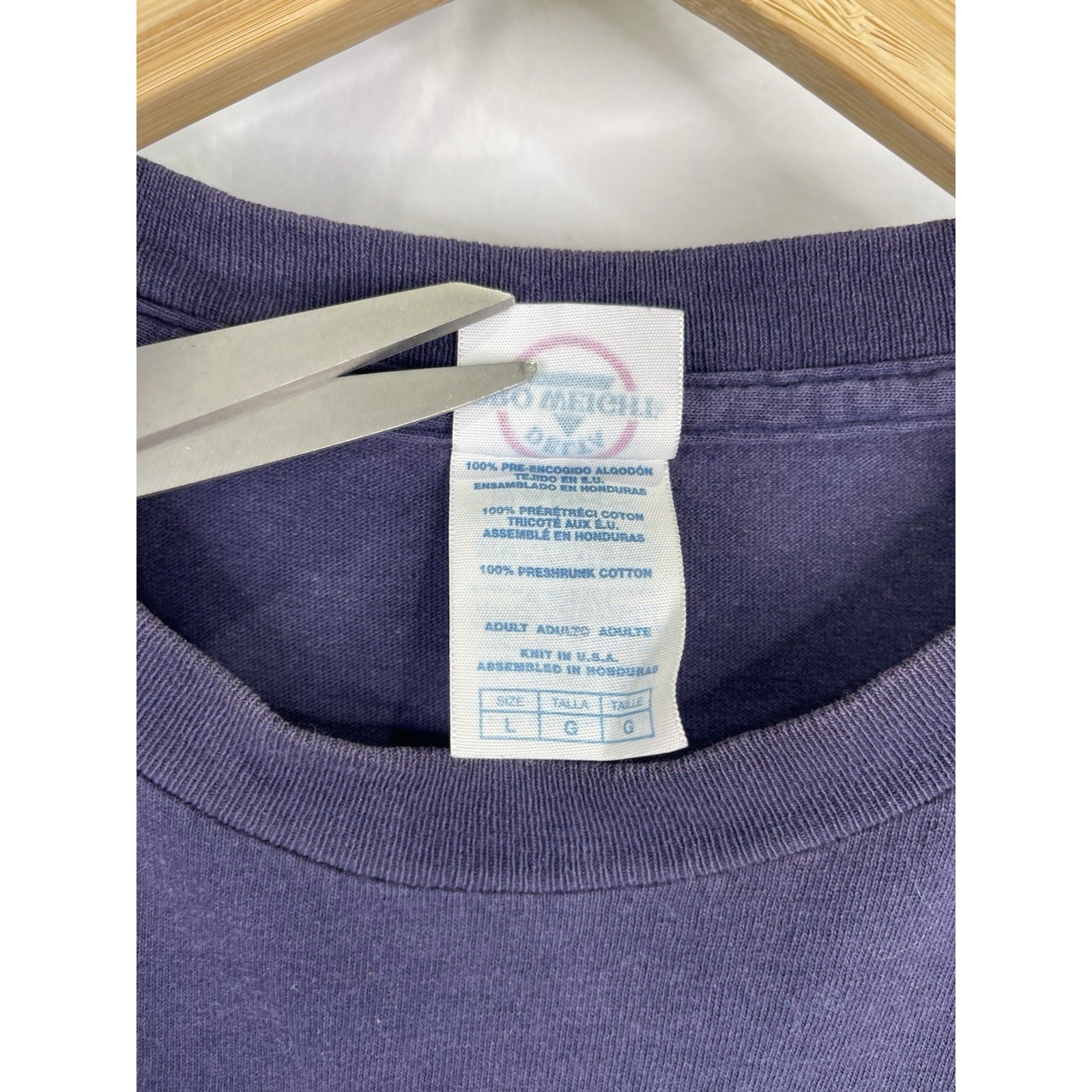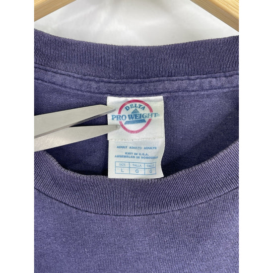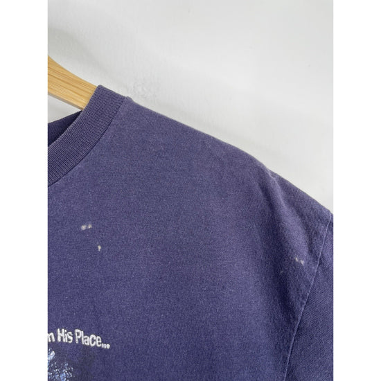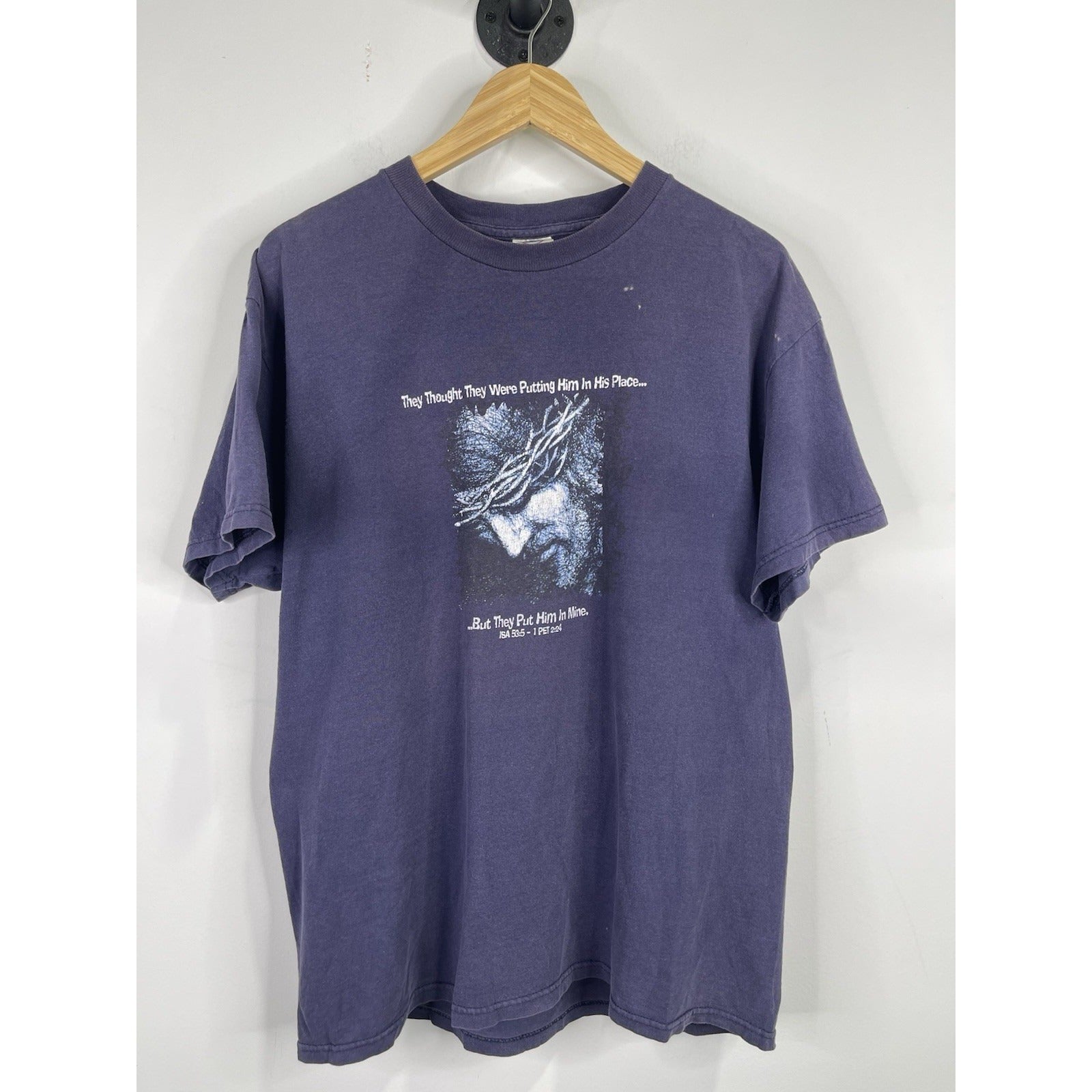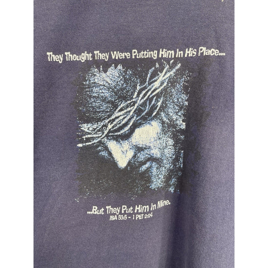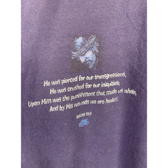 The Vintage Living Epistles Christian Jesus Dark Blue Graphic T-Shirt in size Large is a classic and spiritual addition to any man's wardrobe. Made of comfortable cotton material, this short sleeve shirt features a crew neck and a regular fit. The graphic print on both sides of the shirt showcases a strong message of faith and religion, perfect for those looking to make a statement with their clothing choices. With its easy care and all-season versatility, this timeless piece is a great choice for any man seeking a unique and meaningful style.